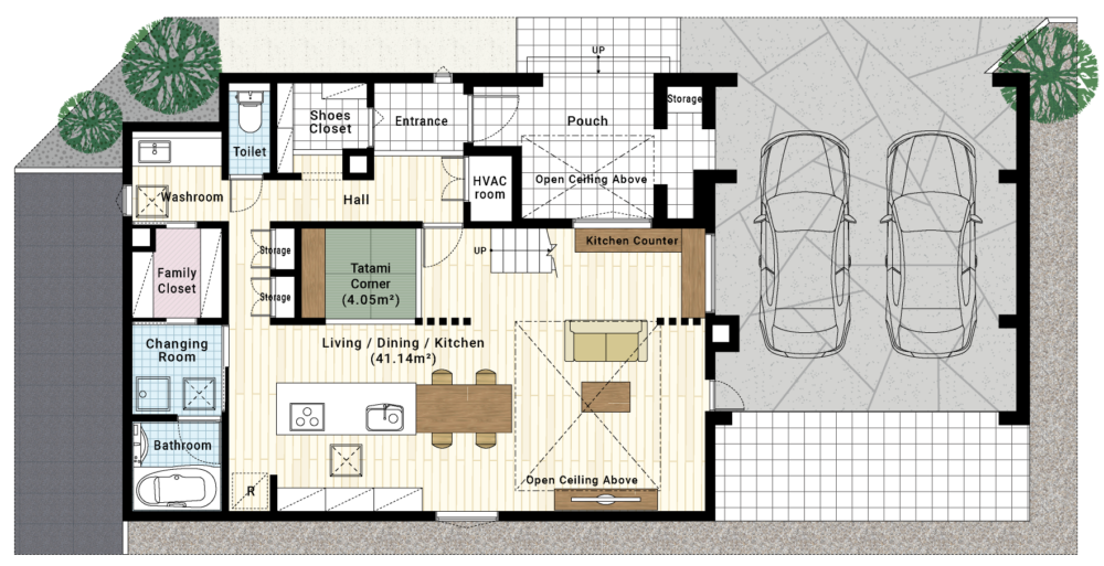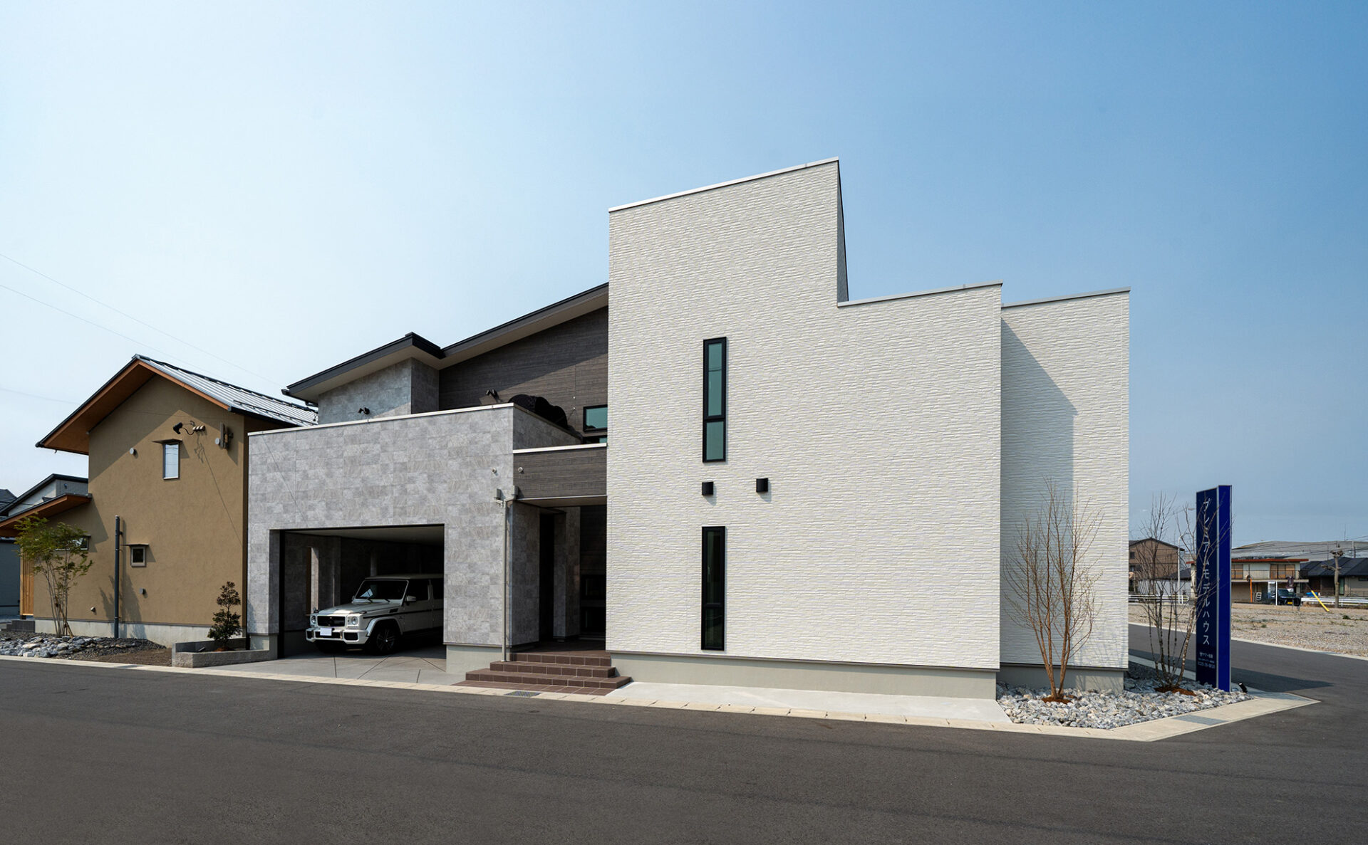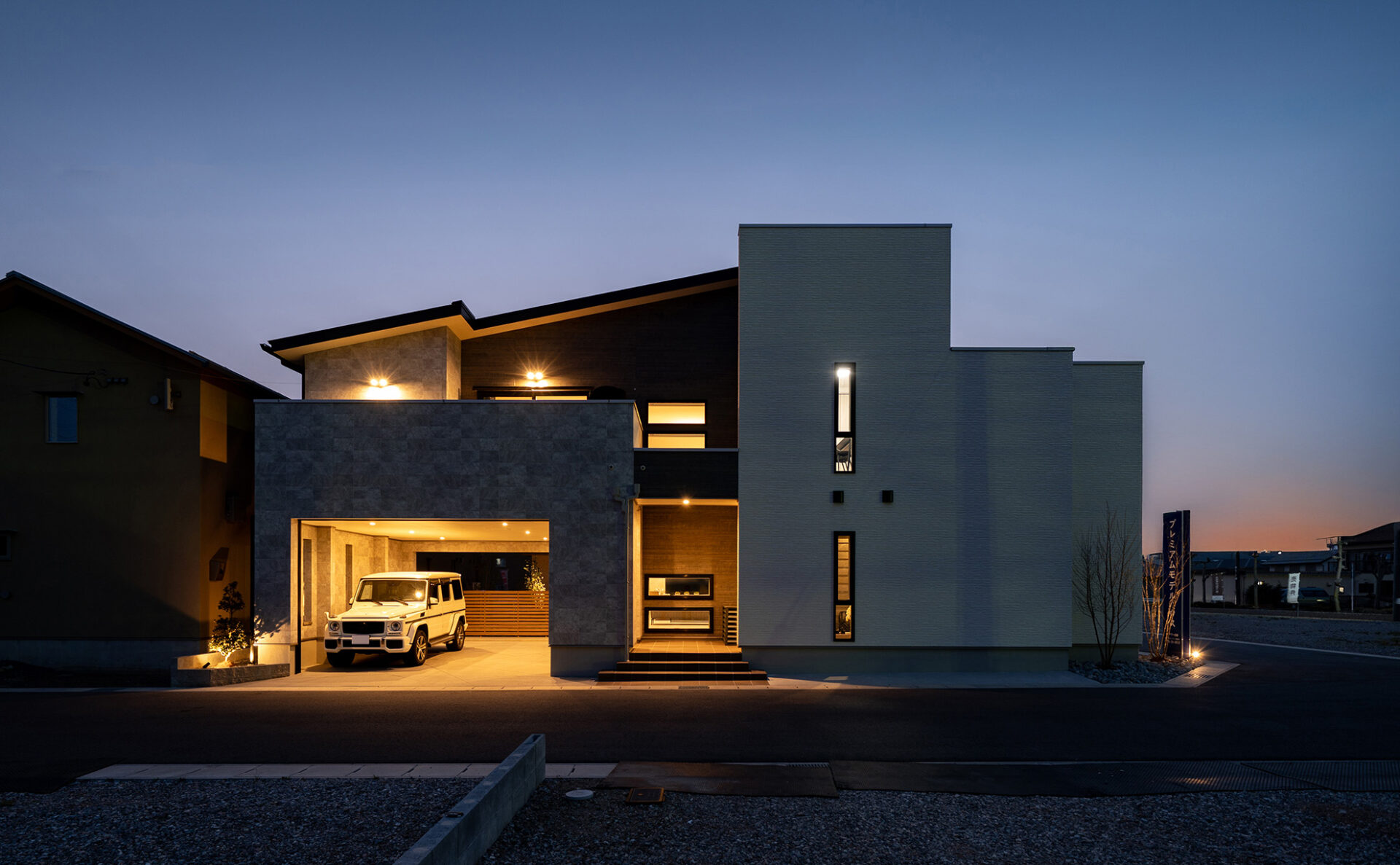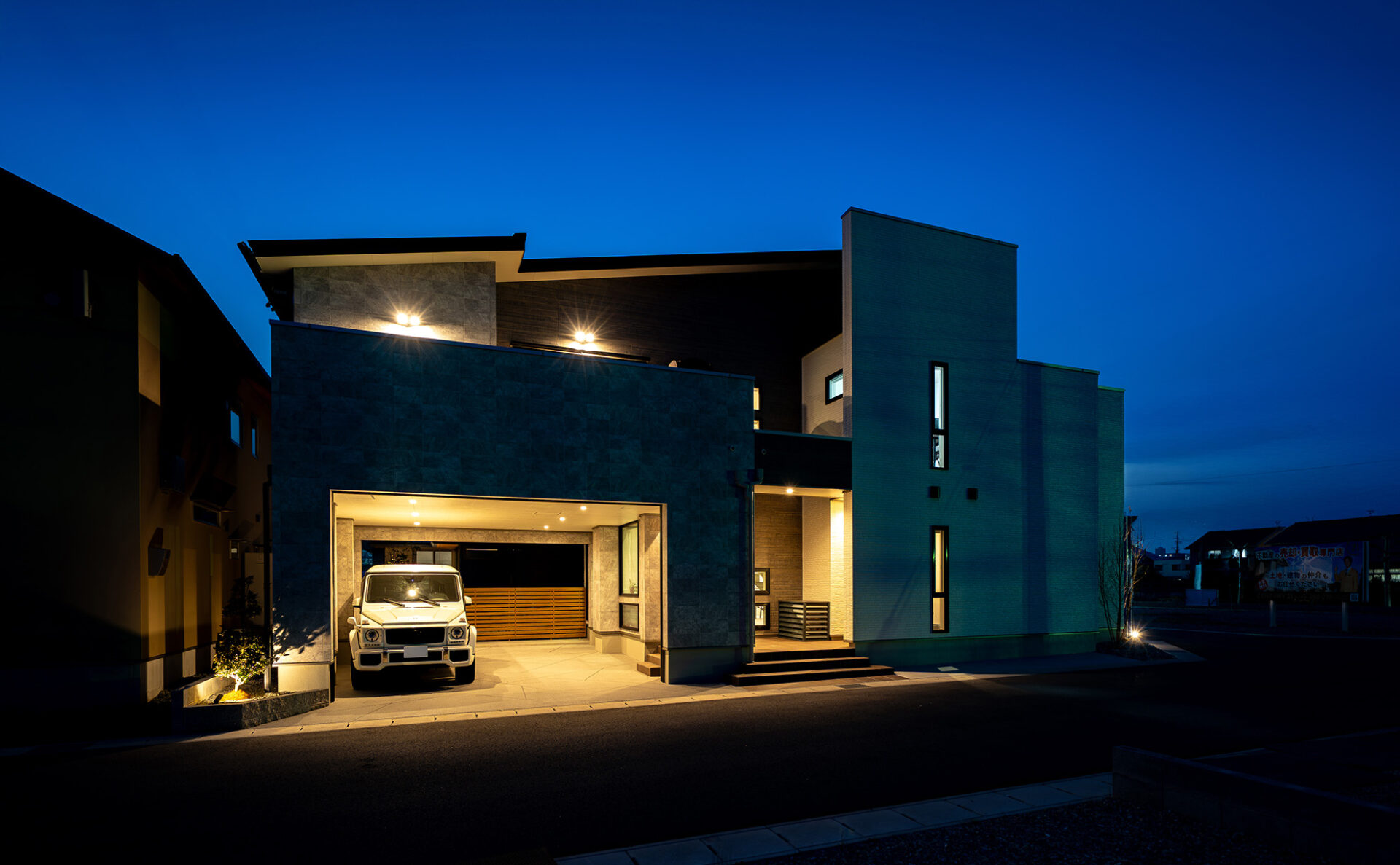 おしゃれなビルトインガレージを備えた、太陽光発電と蓄電池完備のサステナブルな住まい。
