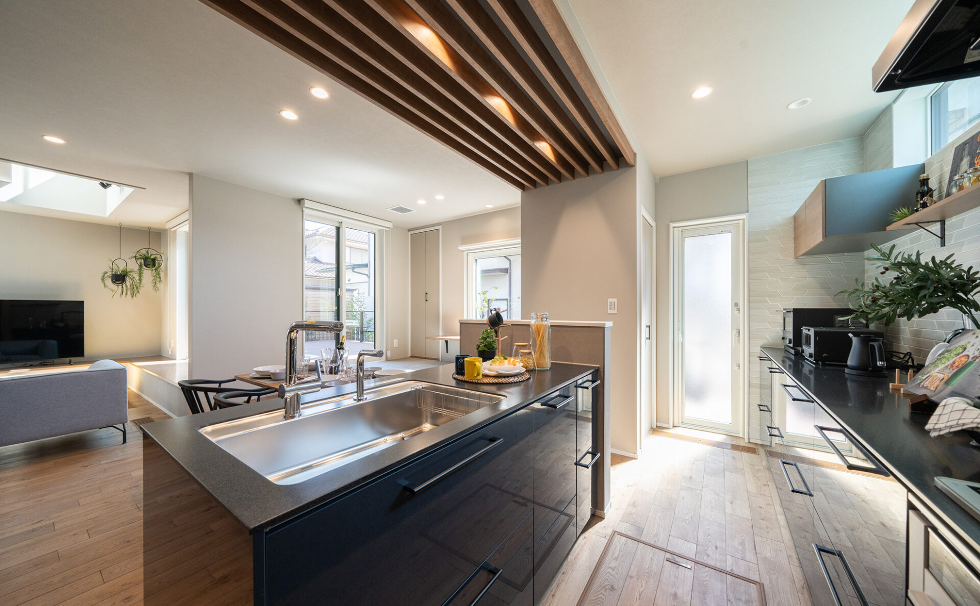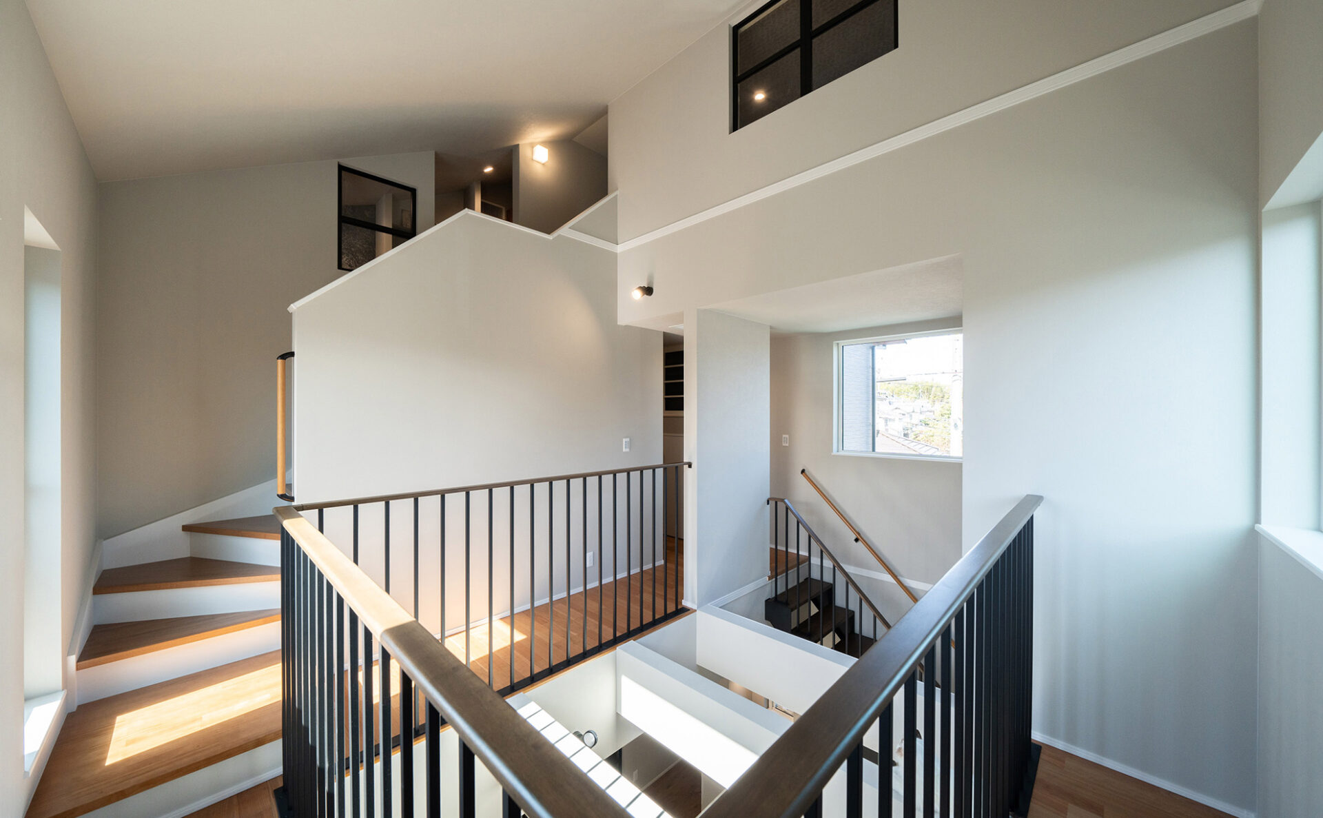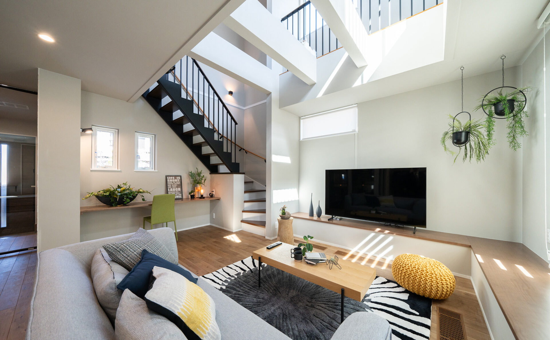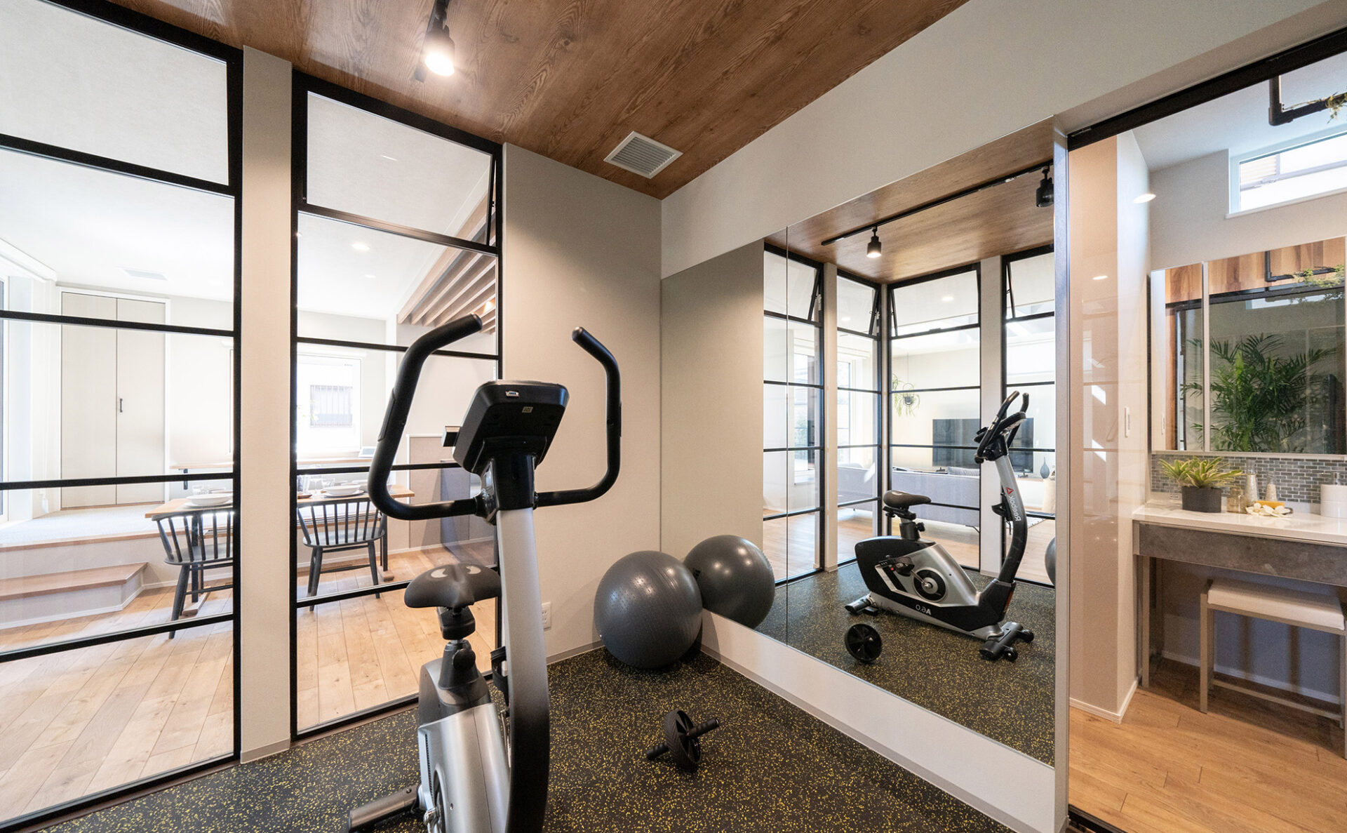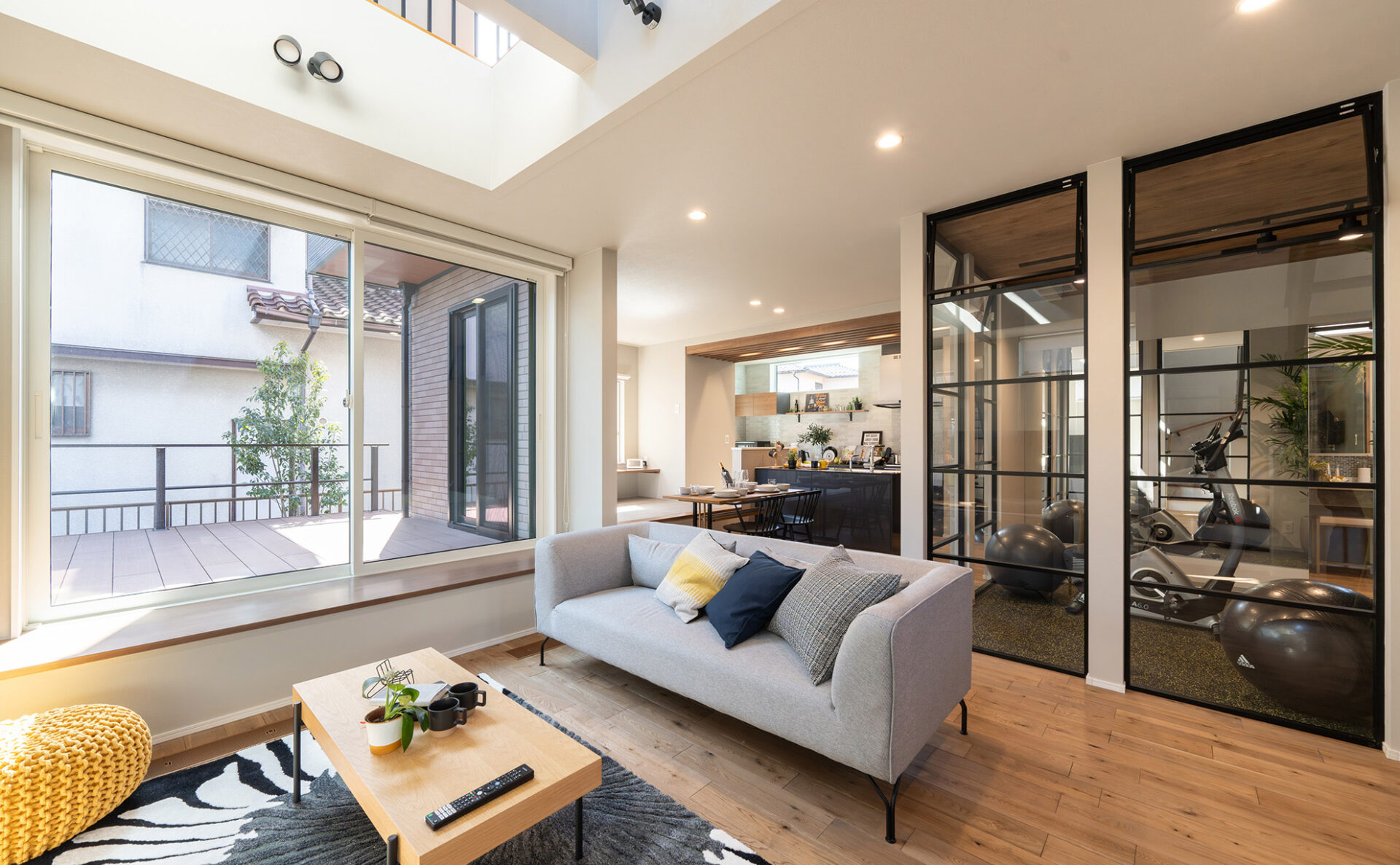 夫婦が永く住み続けられるストレスフリーの家をコンセプトにしたモデルハウス。吹き抜けやステップアップ大開口により光や風を取り入れた自宅リゾートが味わえます。また、1階にトレーニング室を設けて身体も動かせる空間を実現し、2.5階には隠し部屋を2部屋も設置。太陽光発電システムを7.5kW搭載し、家計と地球にやさしい住宅を実現しました。