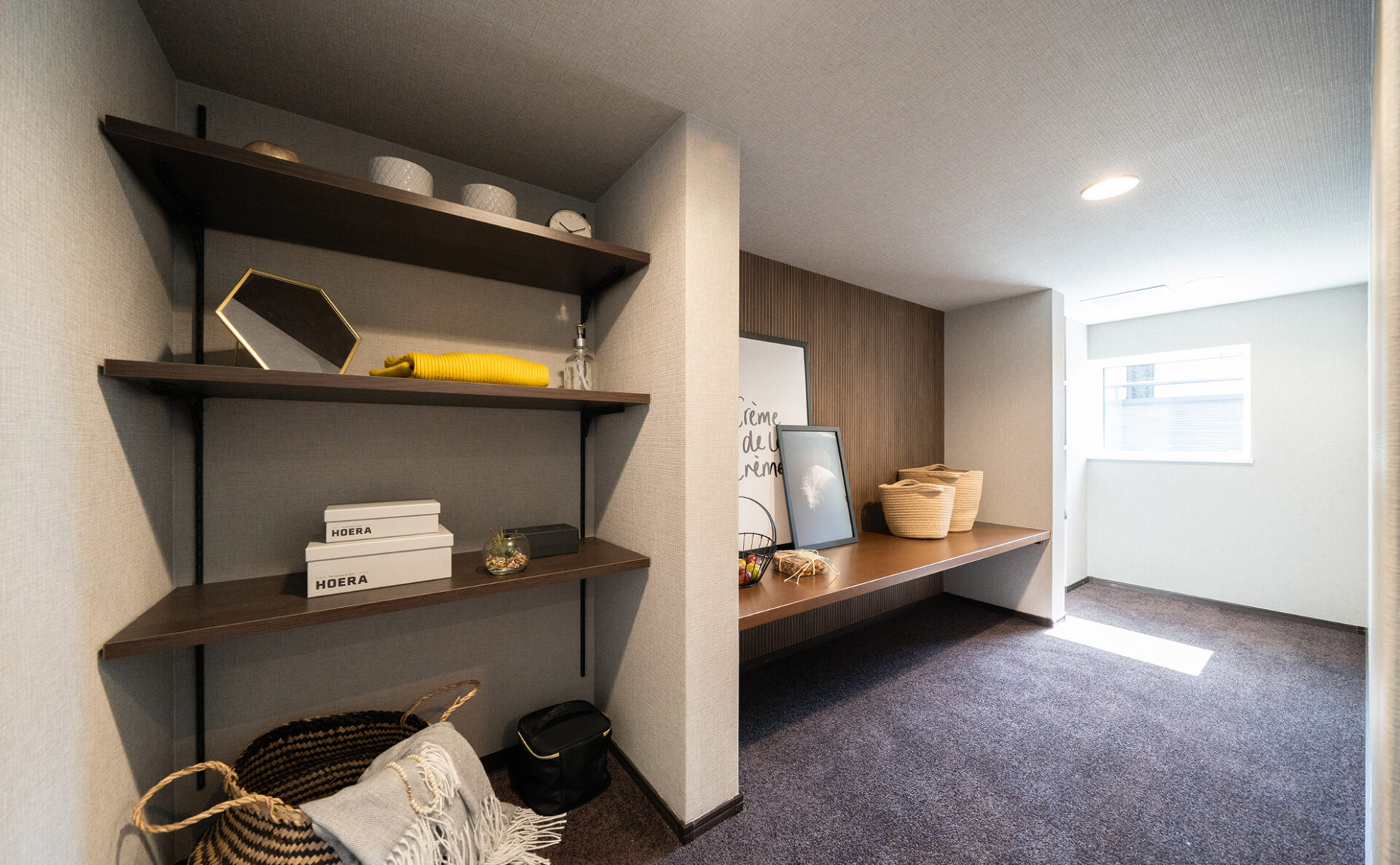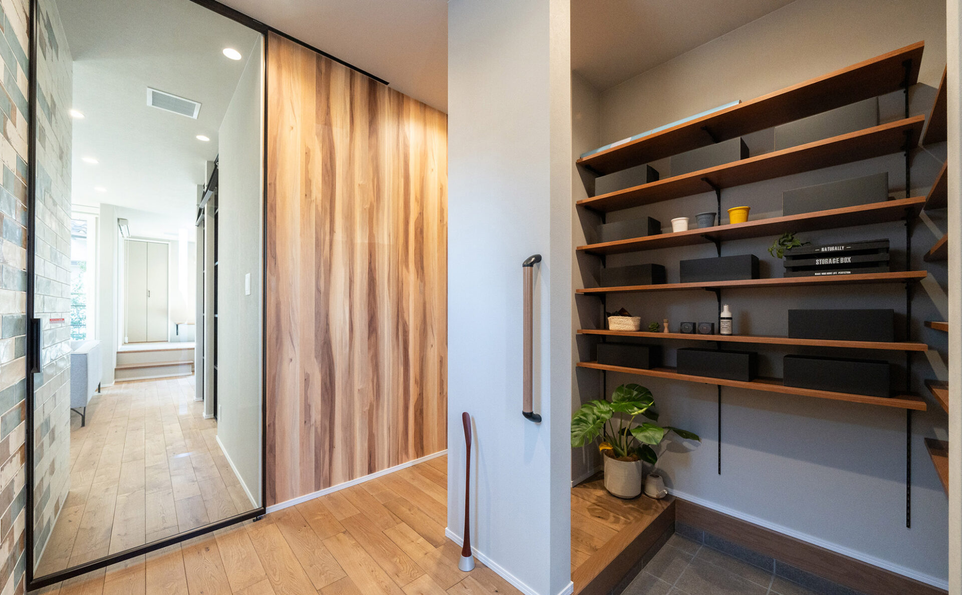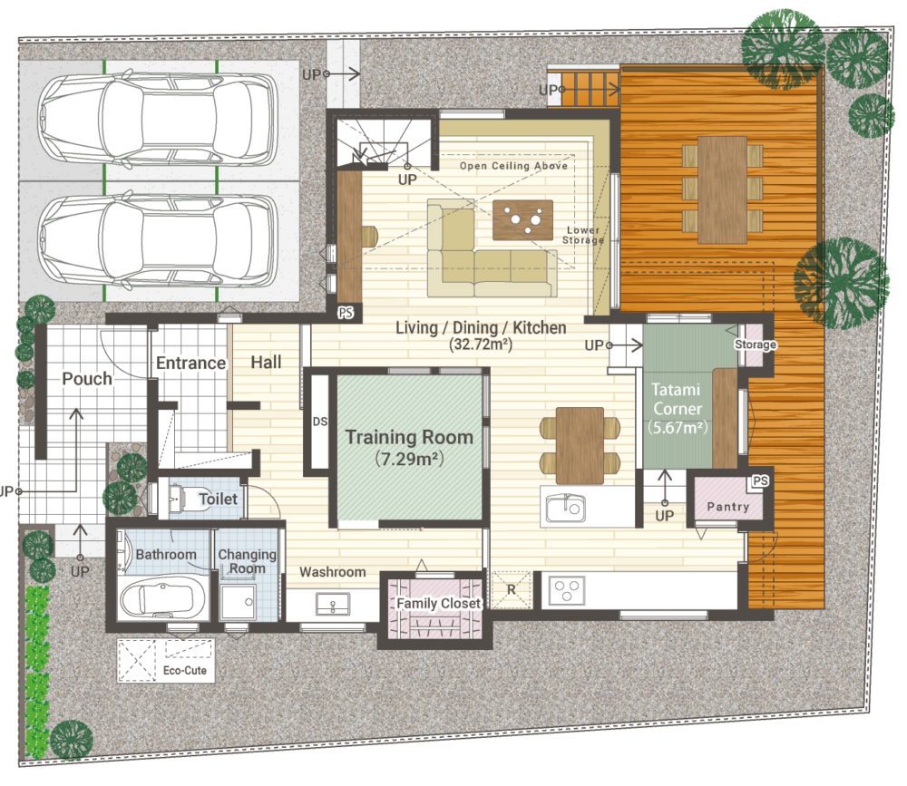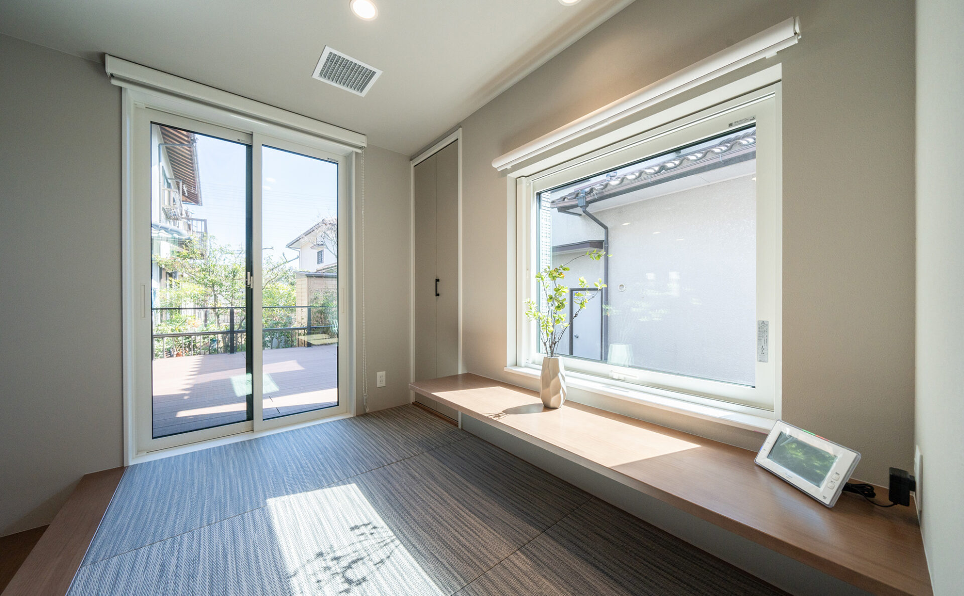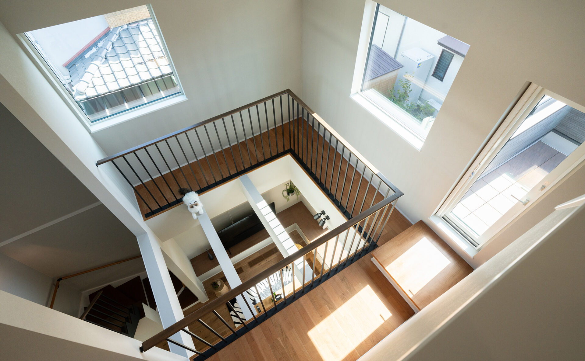 夫婦が永く住み続けられるストレスフリーの家をコンセプトにしたモデルハウス。吹き抜けやステップアップ大開口により光や風を取り入れた自宅リゾートが味わえます。また、1階にトレーニング室を設けて身体も動かせる空間を実現し、2.5階には隠し部屋を2部屋も設置。太陽光発電システムを7.5kW搭載し、家計と地球にやさしい住宅を実現しました。