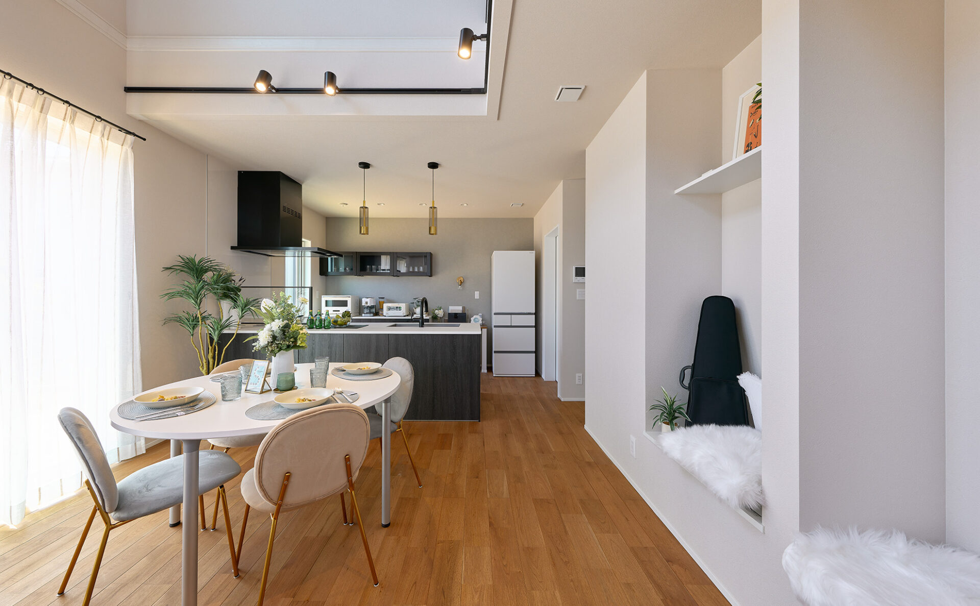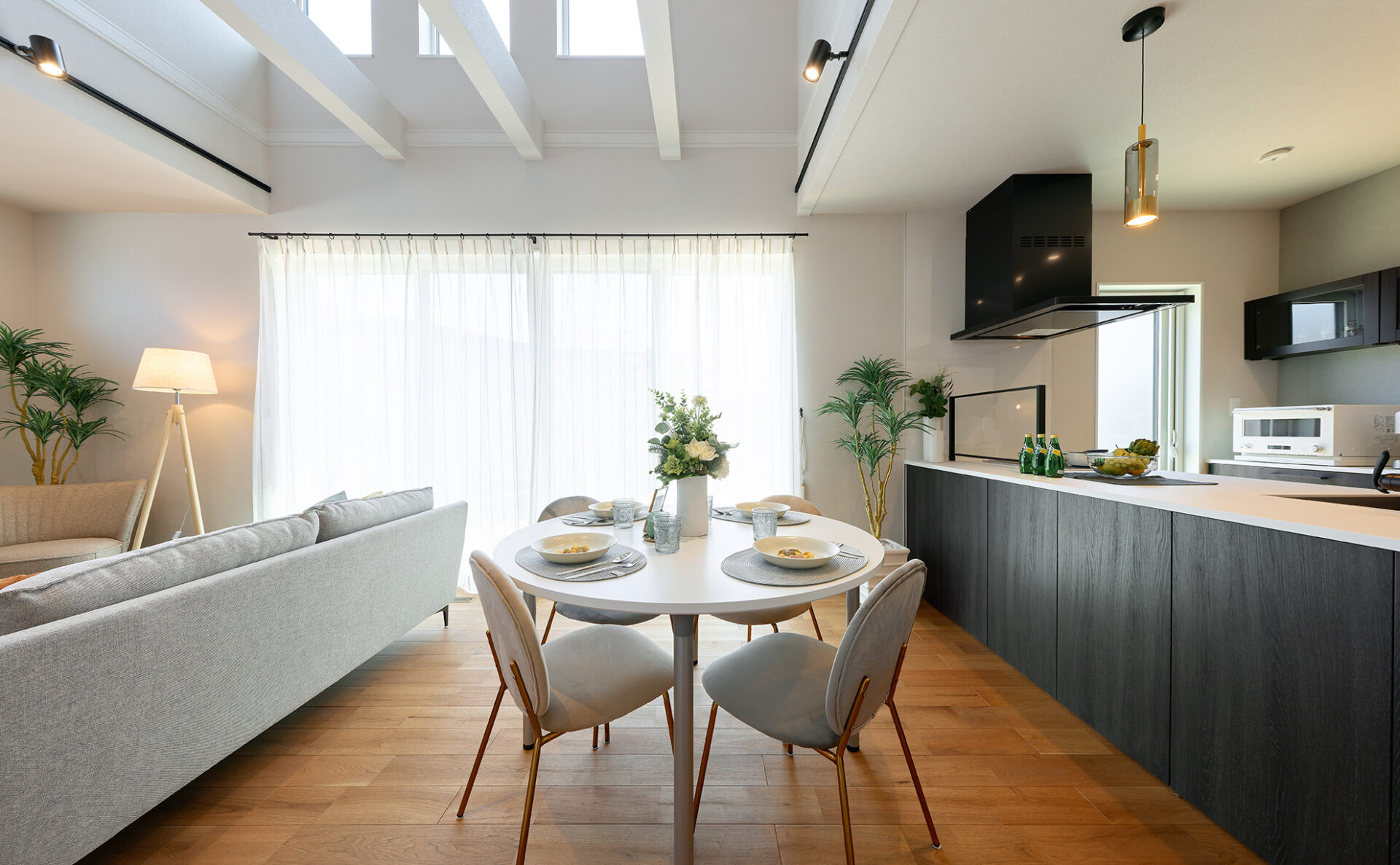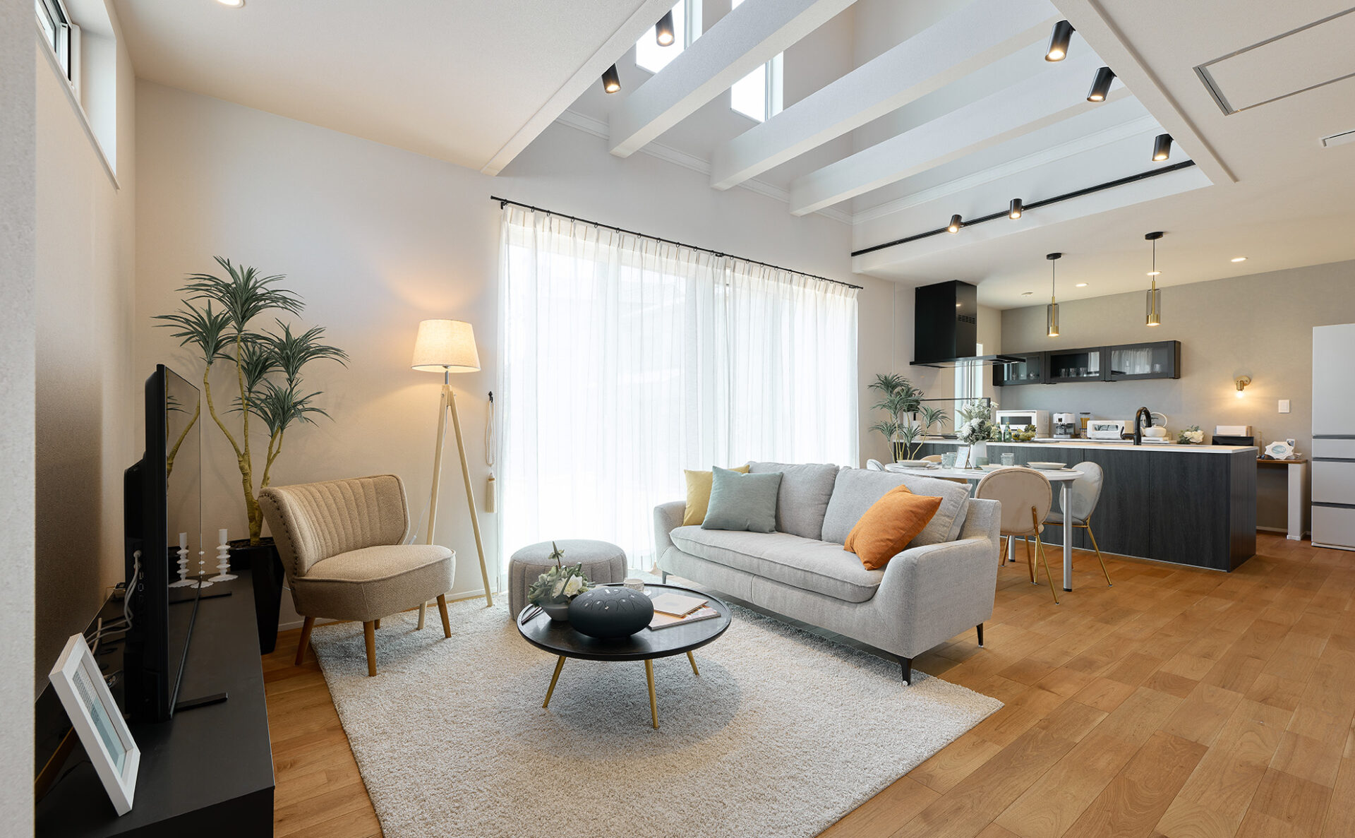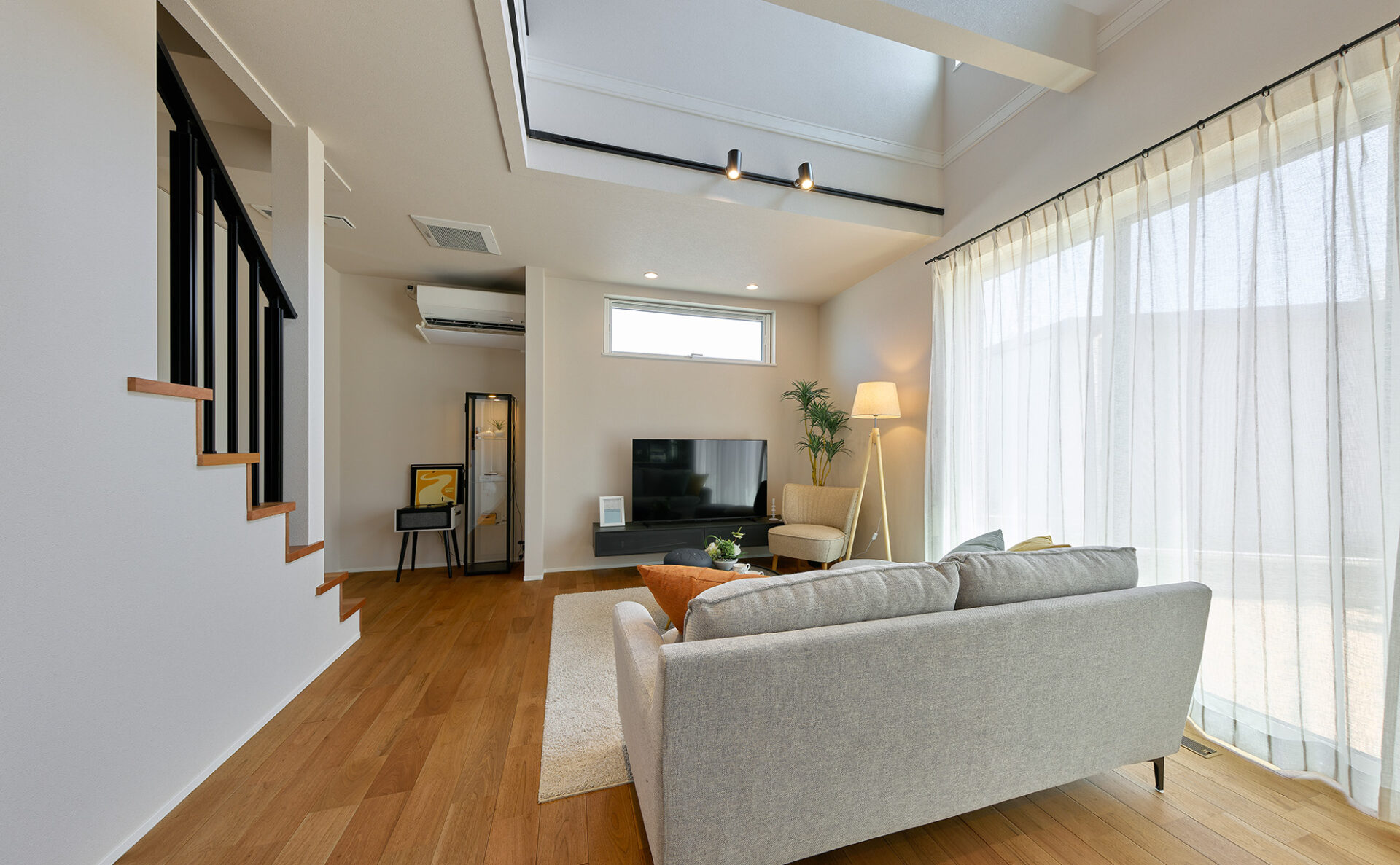吹き抜けと広々としたLDKが、自然光に包まれた開放的な空間を演出。家全体に豊富な収納スペースを設けているため、日々の暮らしがすっきりと整い、快適に過ごせます。
