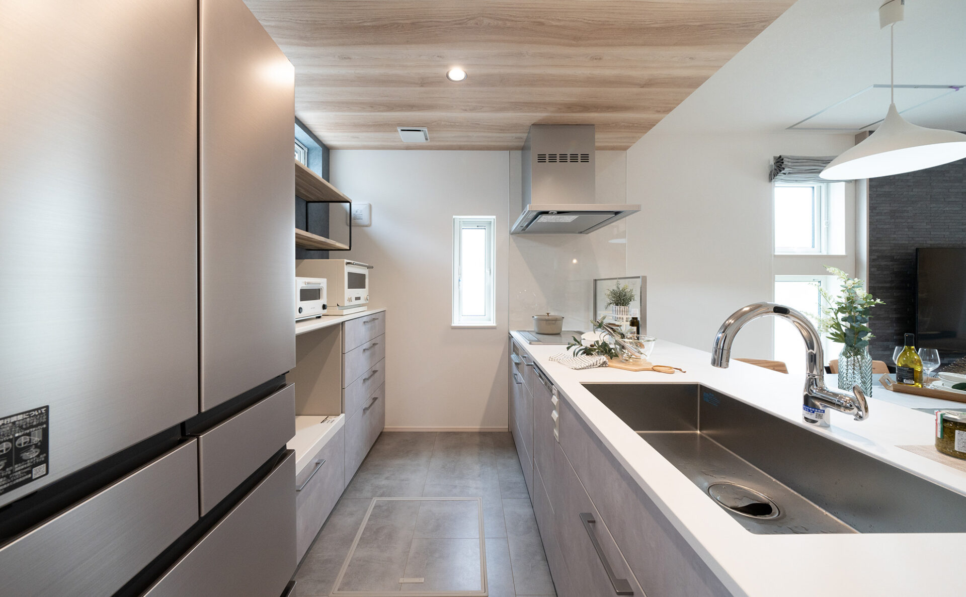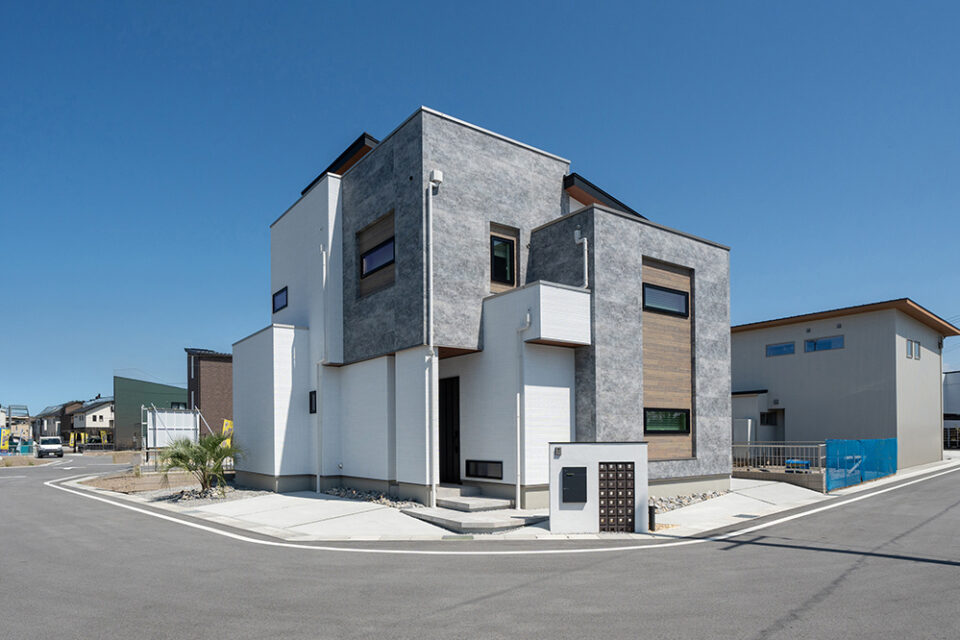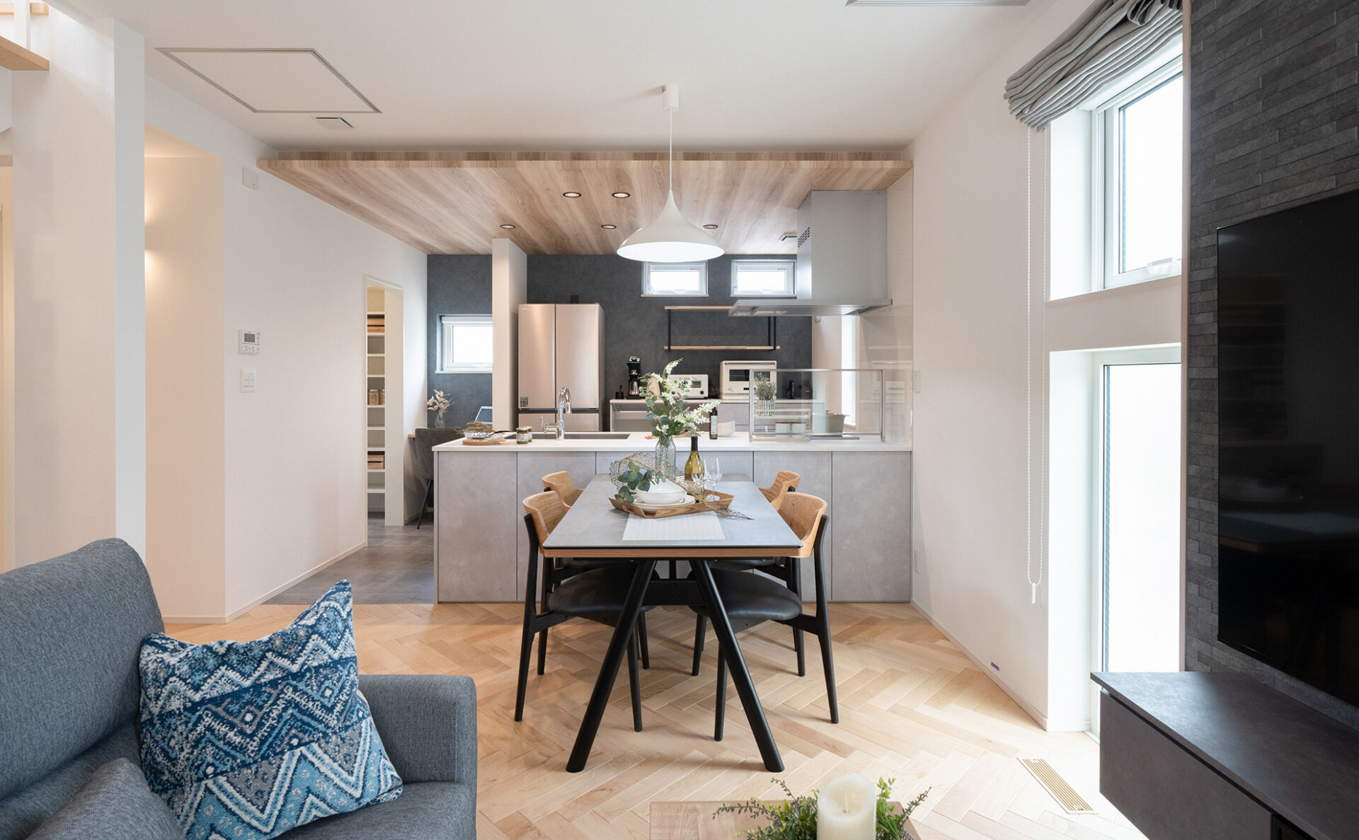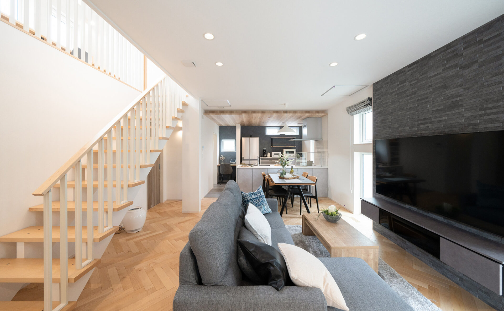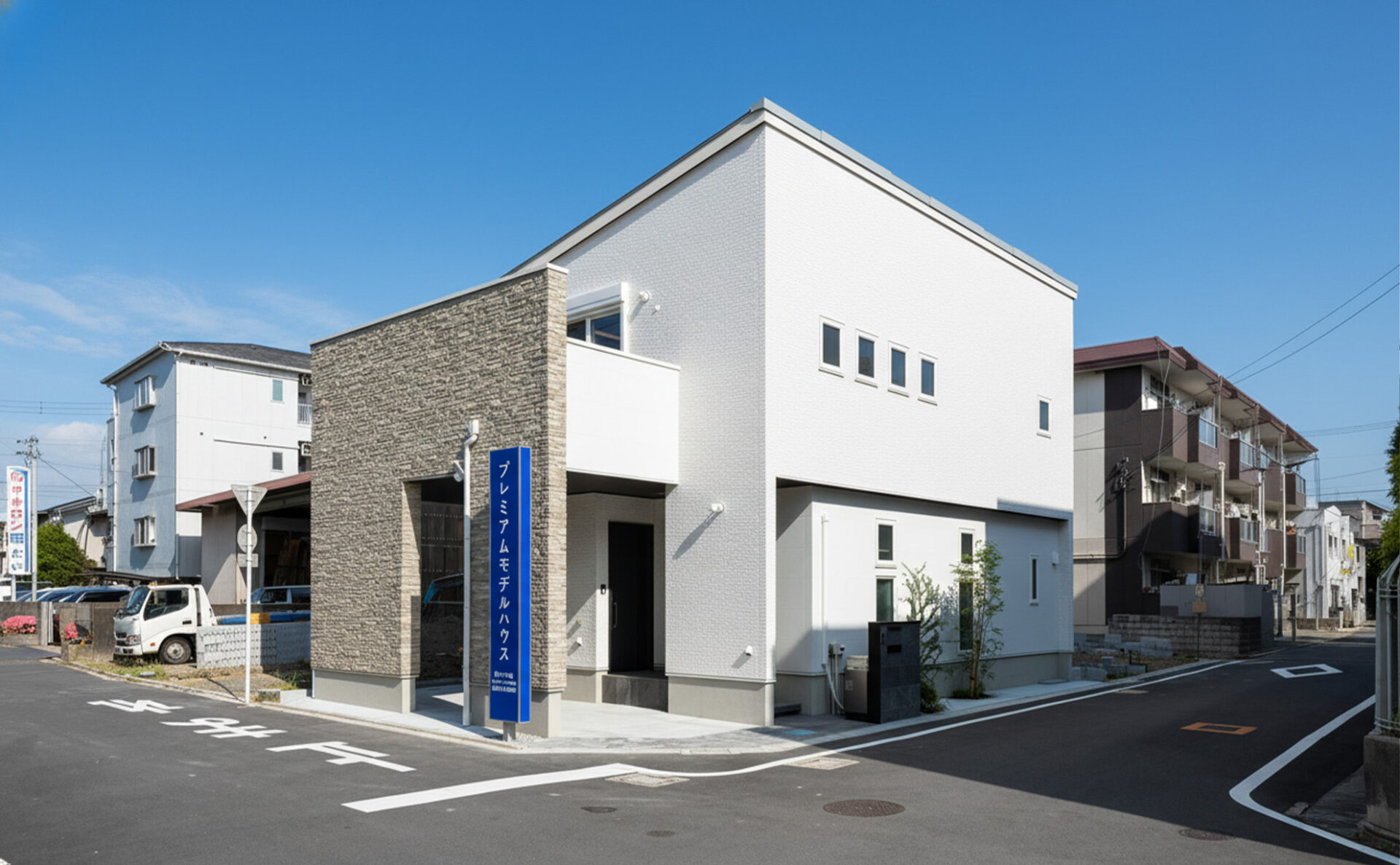 まちかどに佇む、白を基調としたモダンな住まい。ヘリンボーン柄の床材が特徴的なLDKは、家族の会話が自然と生まれる明るい空間です。さらに、便利なパントリールームや、洗面室と分けられたランドリールーム、空間を有効活用したスタディーコーナーなど、参考にしたいアイデアが満載。太陽光パネルを約8.25kw搭載しており、家計に優しい暮らしが実現できます。また、Airフローシステムを搭載し、1年中快適な暮らしをご体感いただけます。
