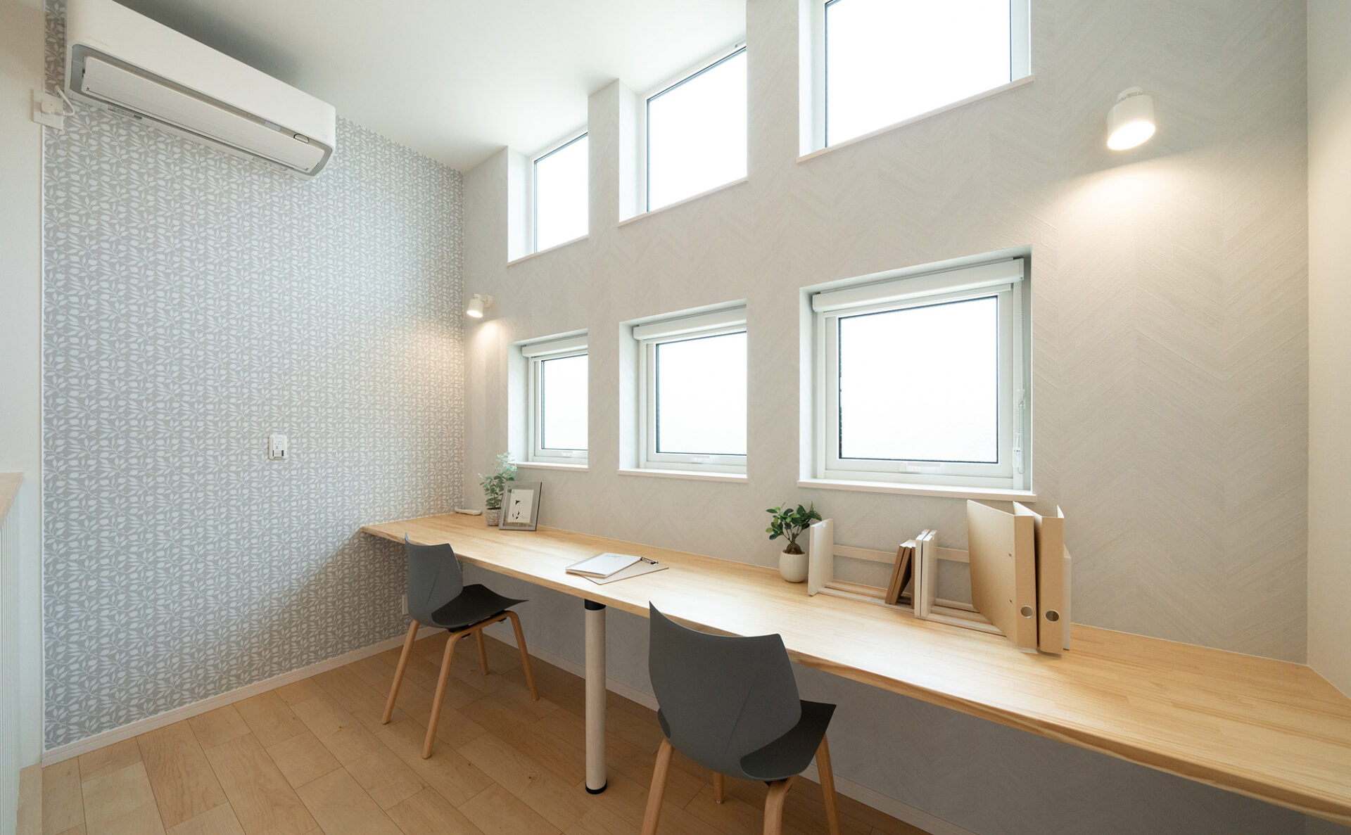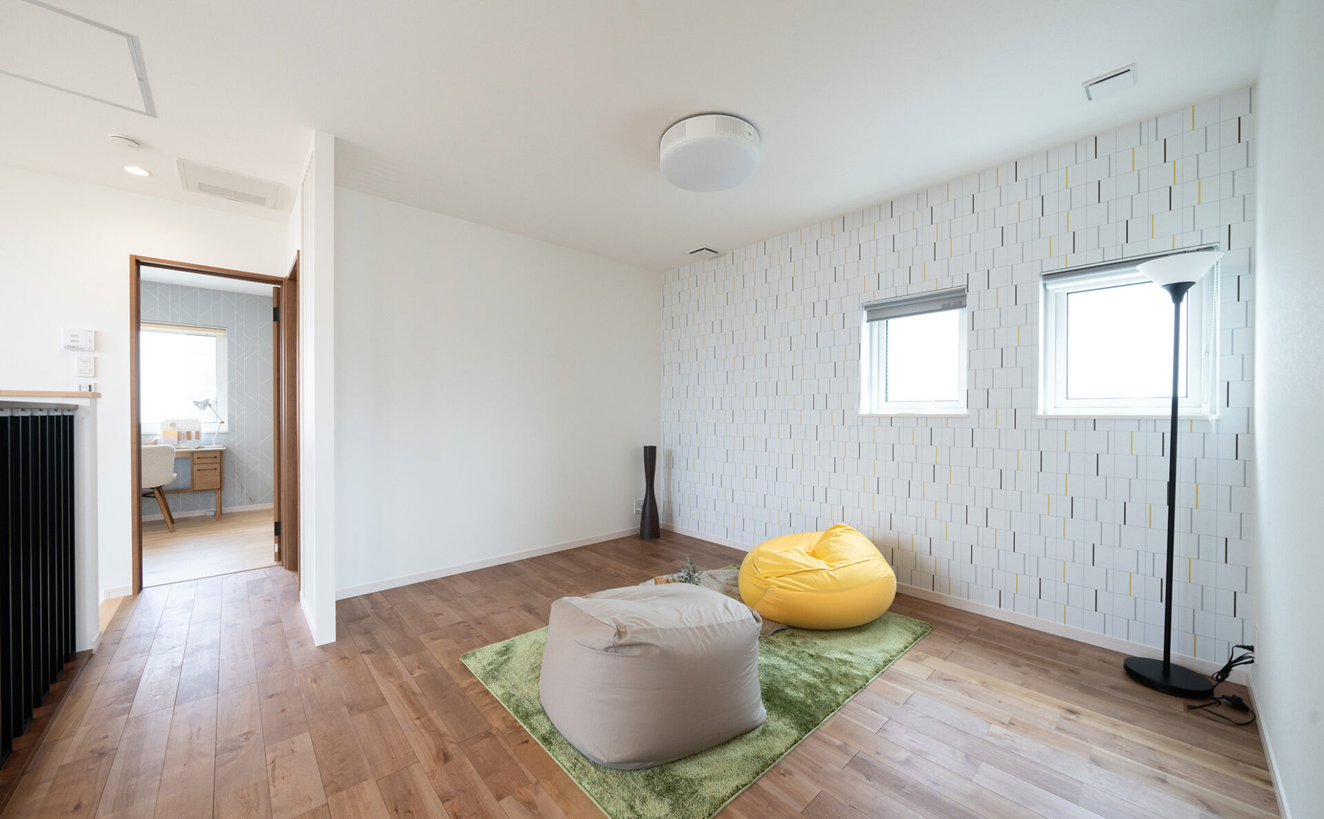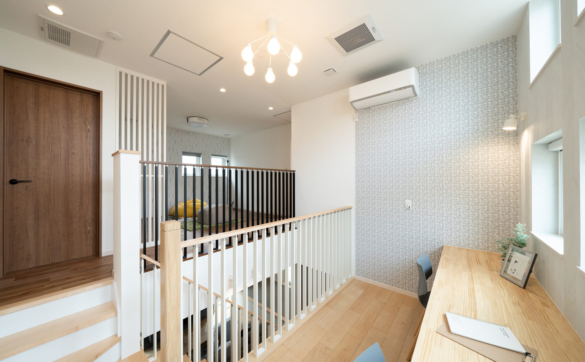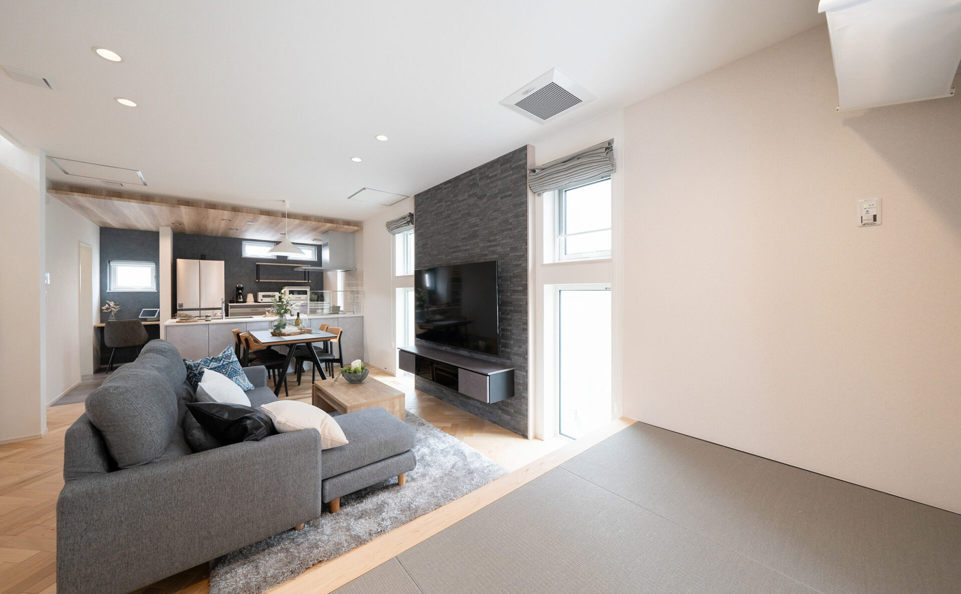 まちかどに佇む、白を基調としたモダンな住まい。ヘリンボーン柄の床材が特徴的なLDKは、家族の会話が自然と生まれる明るい空間です。さらに、便利なパントリールームや、洗面室と分けられたランドリールーム、空間を有効活用したスタディーコーナーなど、参考にしたいアイデアが満載。太陽光パネルを約8.25kw搭載しており、家計に優しい暮らしが実現できます。また、Airフローシステムを搭載し、1年中快適な暮らしをご体感いただけます。