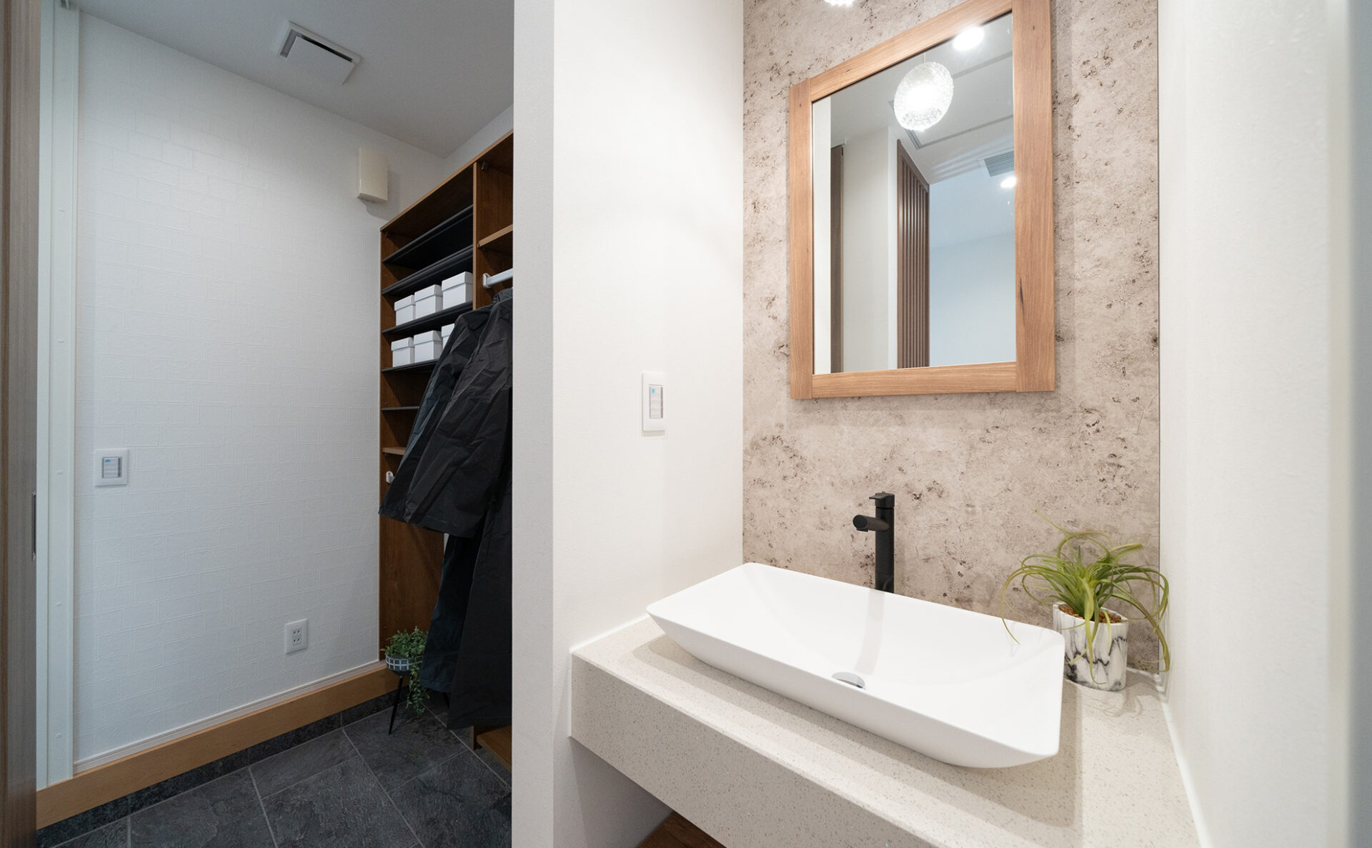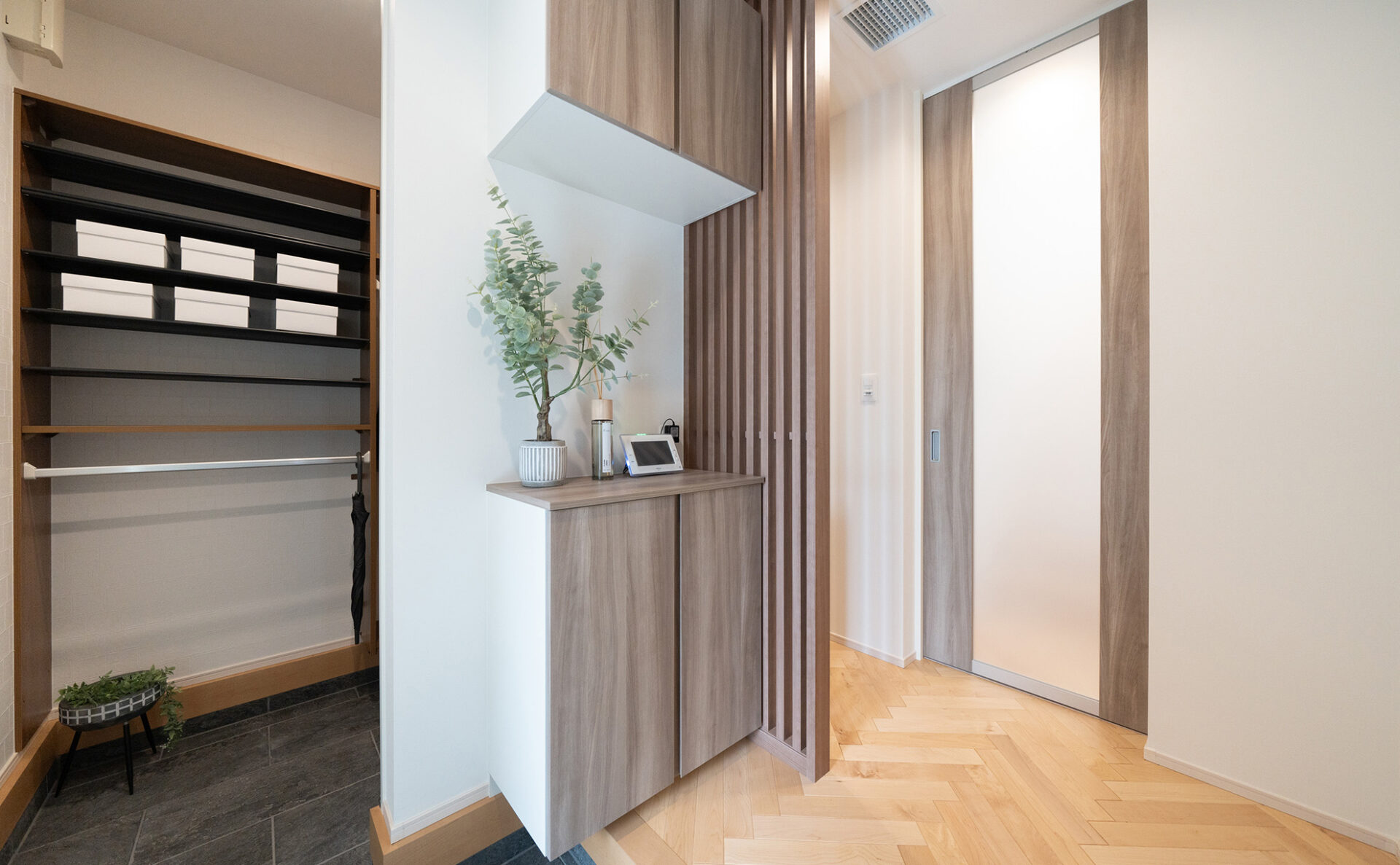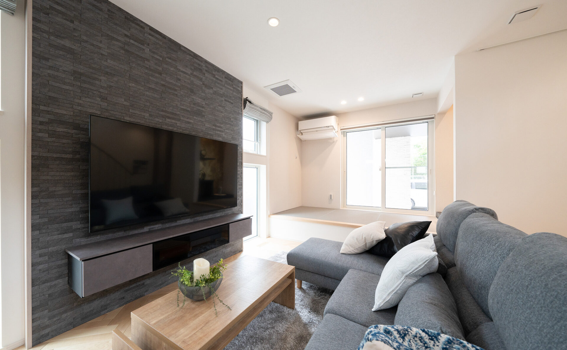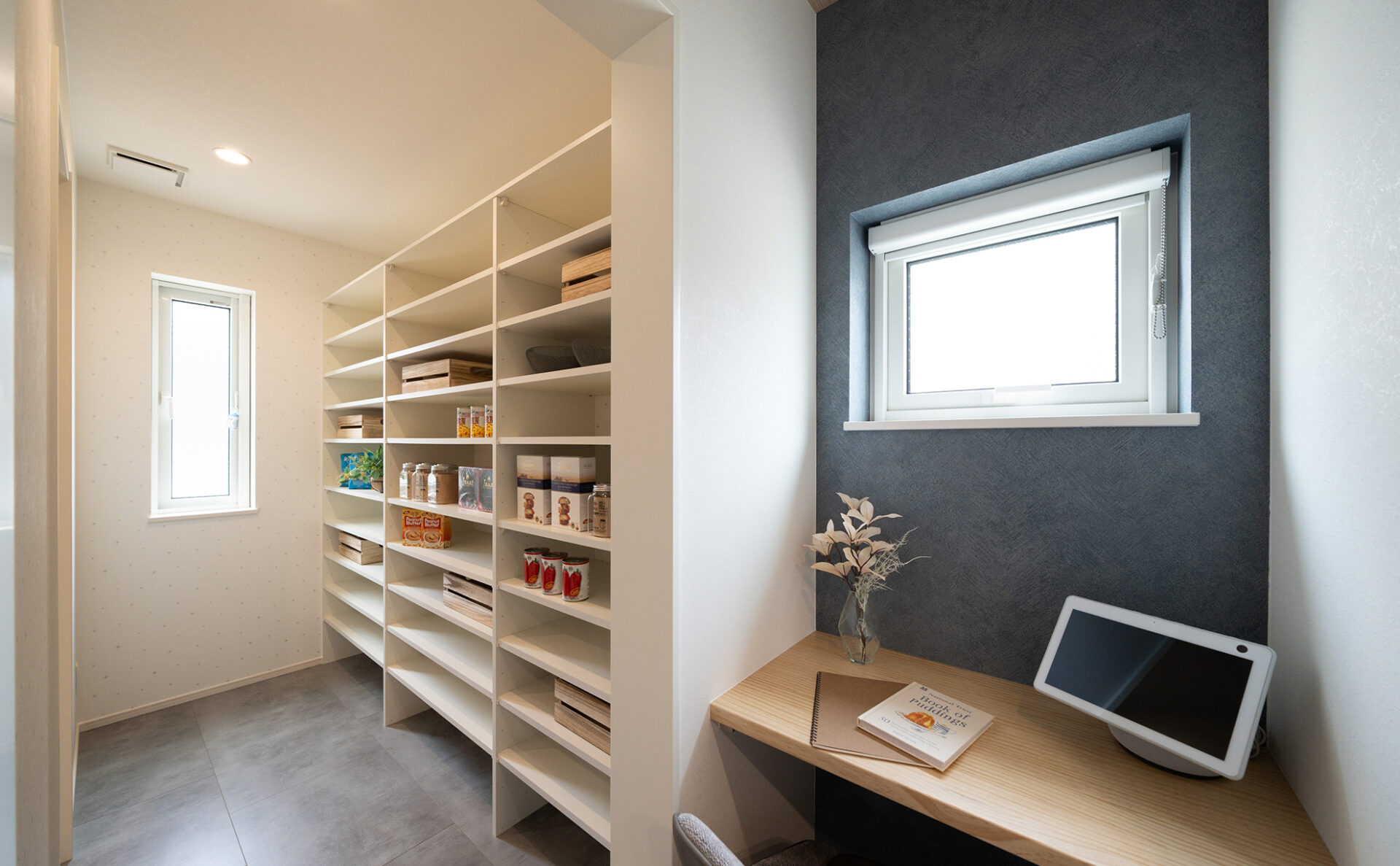まちかどに佇む、白を基調としたモダンな住まい。ヘリンボーン柄の床材が特徴的なLDKは、家族の会話が自然と生まれる明るい空間です。さらに、便利なパントリールームや、洗面室と分けられたランドリールーム、空間を有効活用したスタディーコーナーなど、参考にしたいアイデアが満載。太陽光パネルを約8.25kw搭載しており、家計に優しい暮らしが実現できます。また、Airフローシステムを搭載し、1年中快適な暮らしをご体感いただけます。