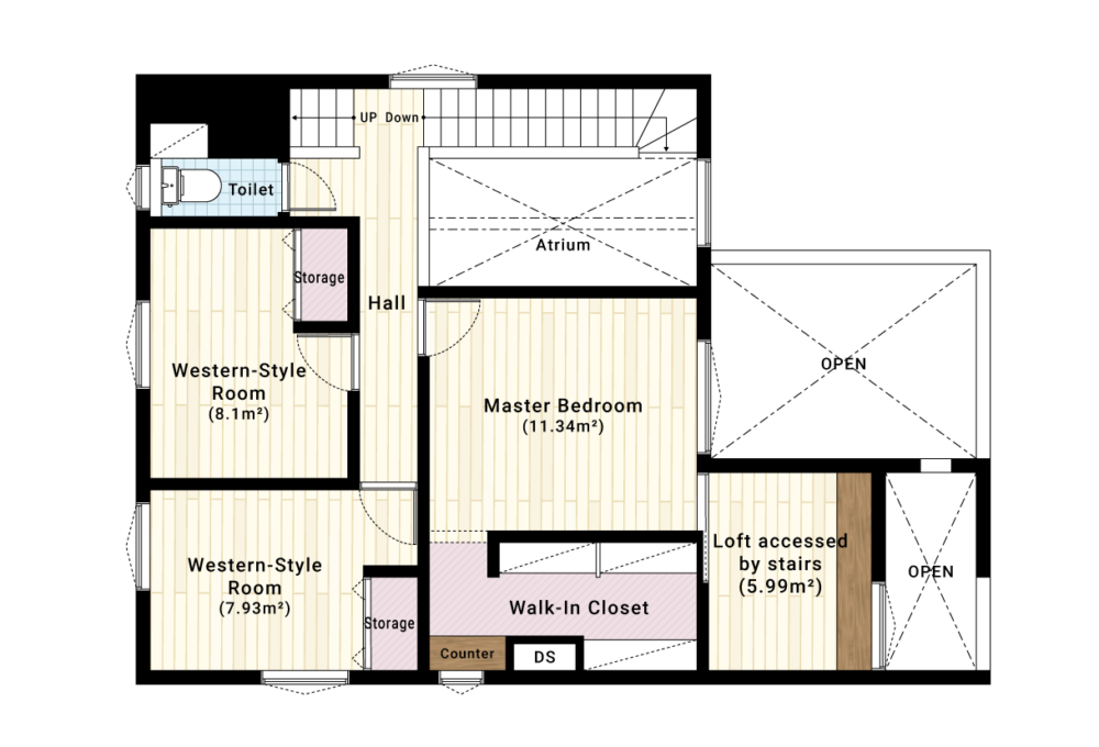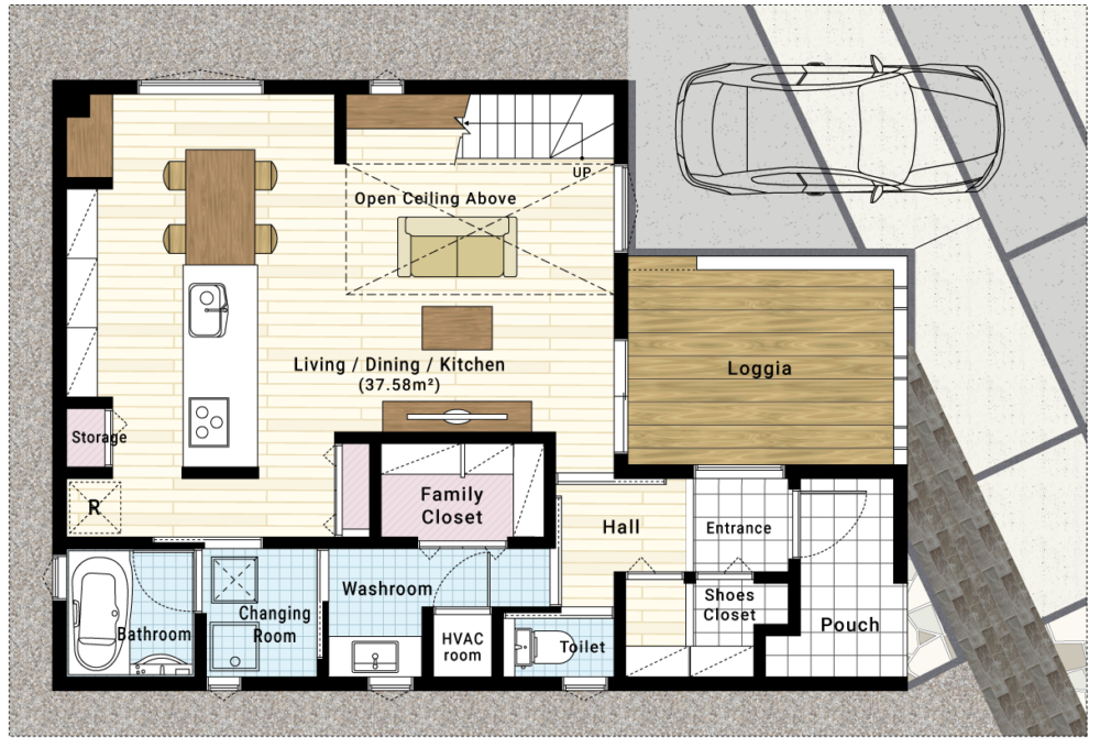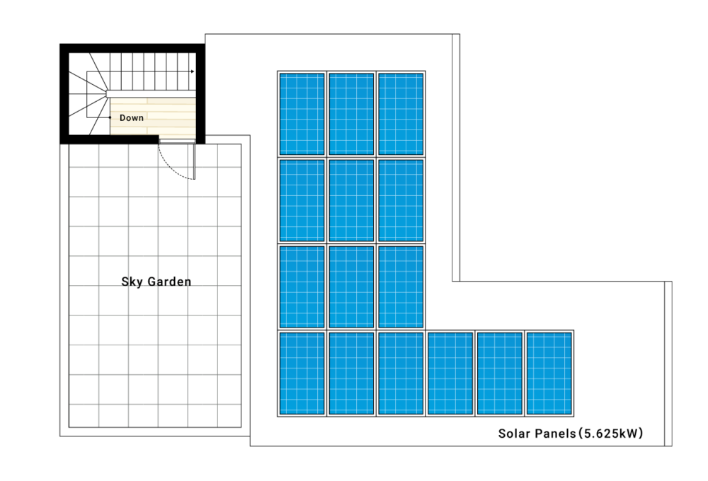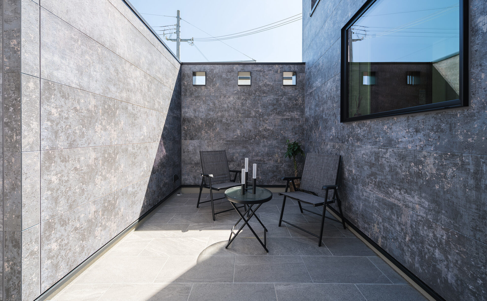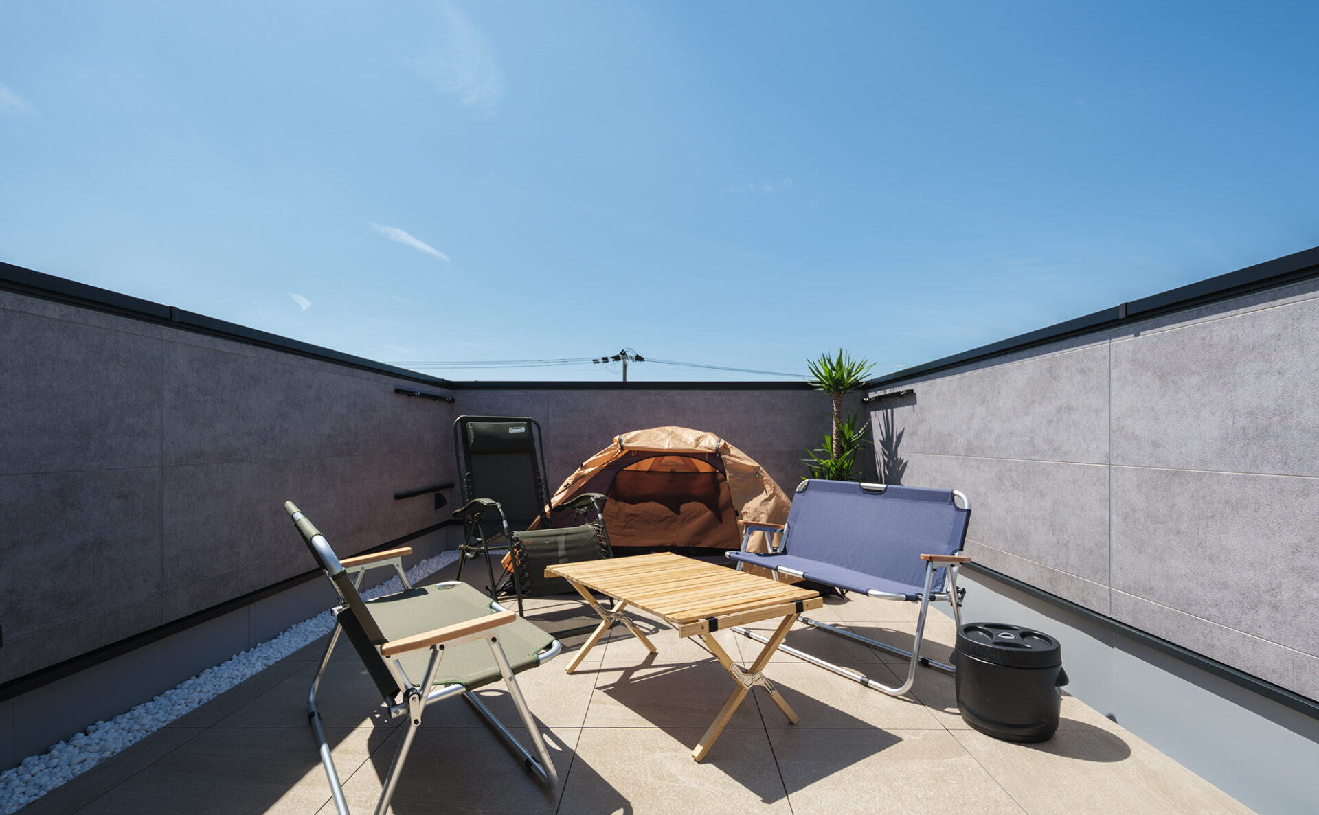 外壁に囲まれたロジアと開放的な屋上庭園が、心地よい半屋外空間を実現。視線を気にせず、食事や趣味を楽しめるプライベートな空間。