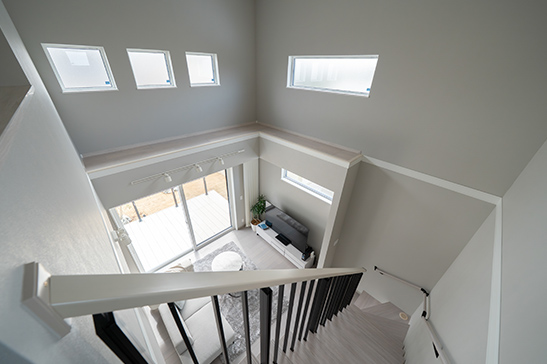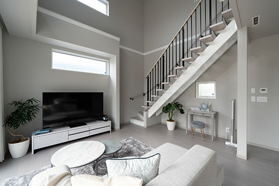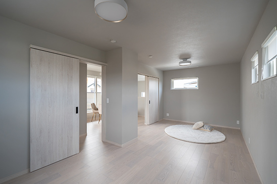 明るく広々としたLDKと無垢材の床が心地よい空間を演出。太陽光パネルと蓄電池を備え、エネルギーを自給しながら環境にも優しい暮らしを実現。自然素材の温もりと最新設備が調和する、快適でサステナブルな住まいです。