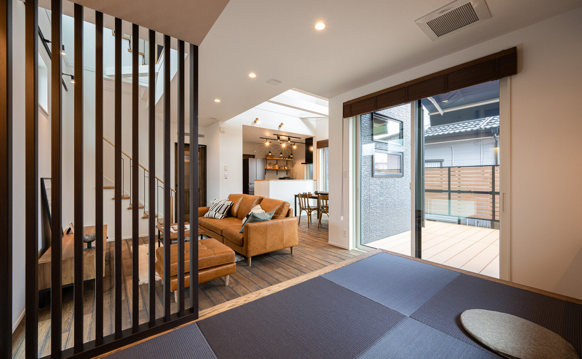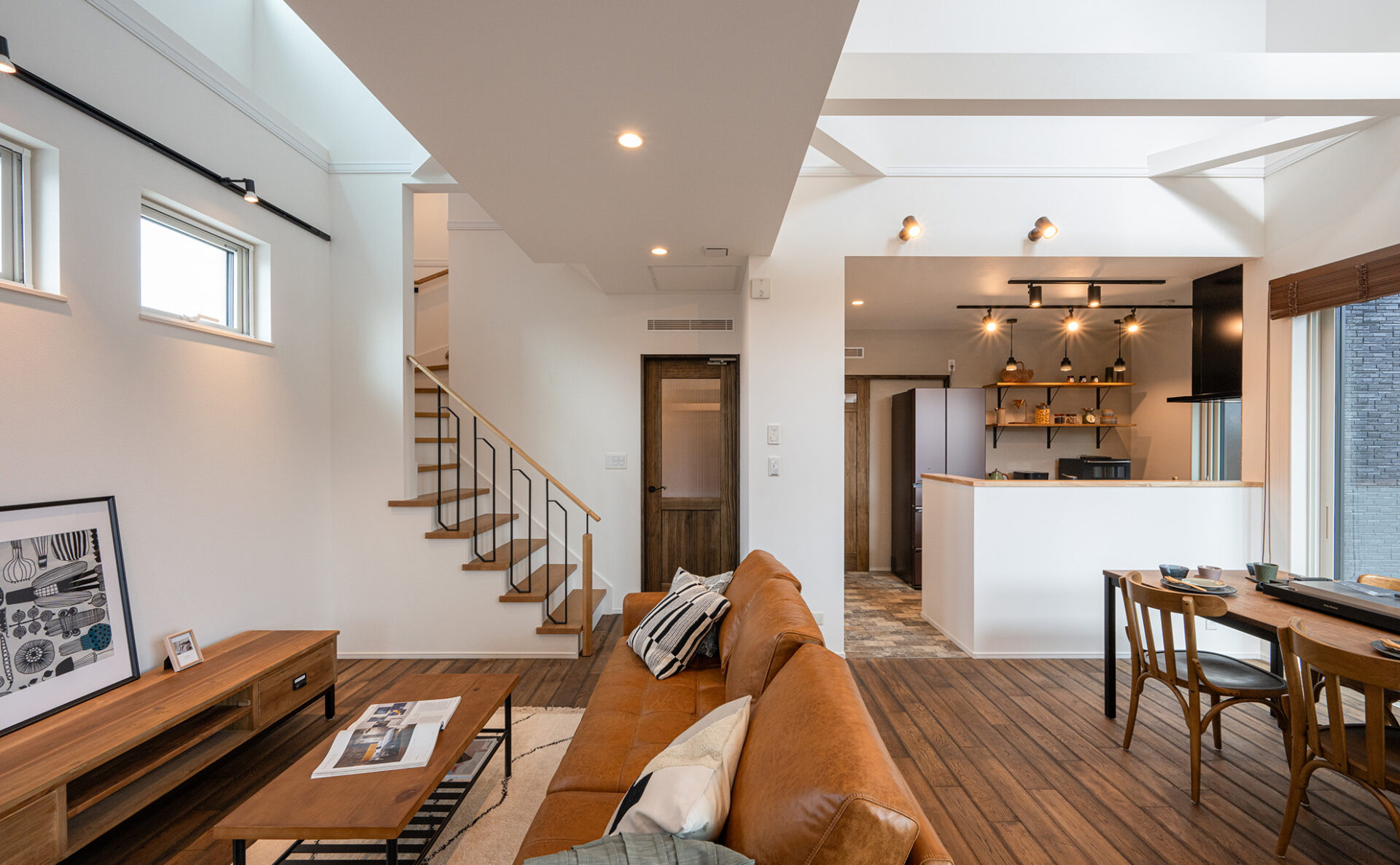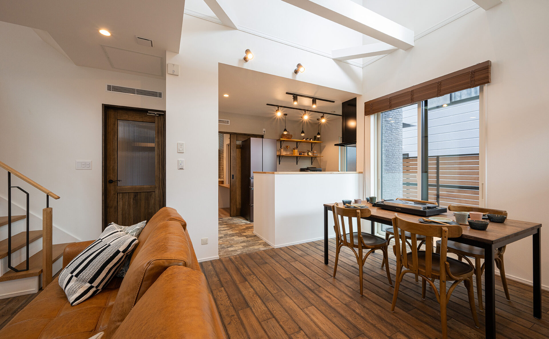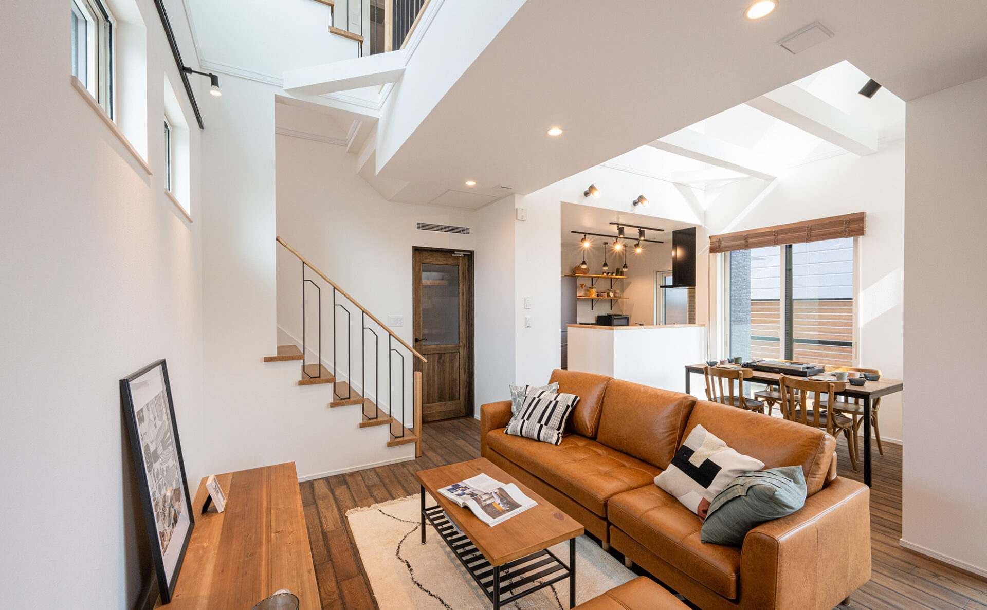 2つの吹き抜けで開放的なLDK、デッキや屋上庭園などの外部空間も備え、家の内外で解放感を感じる住まい。生活に合わせて空間の活用方法を変化させることができるリビングや和室、子ども部屋を採用し、いつまでも暮らしやすい間取りを採用しました。全館空調エアフローシステムや空気清浄システムのトルネックスを搭載し、家全体が快適。また、6.0kWの太陽光発電システムも採用しています。