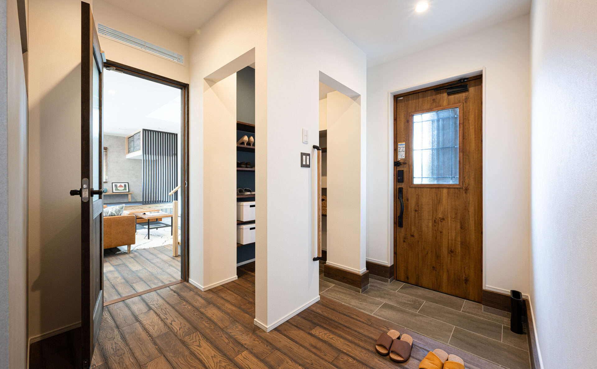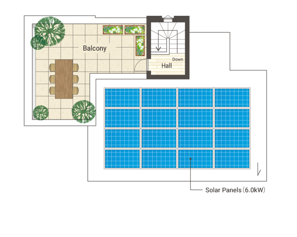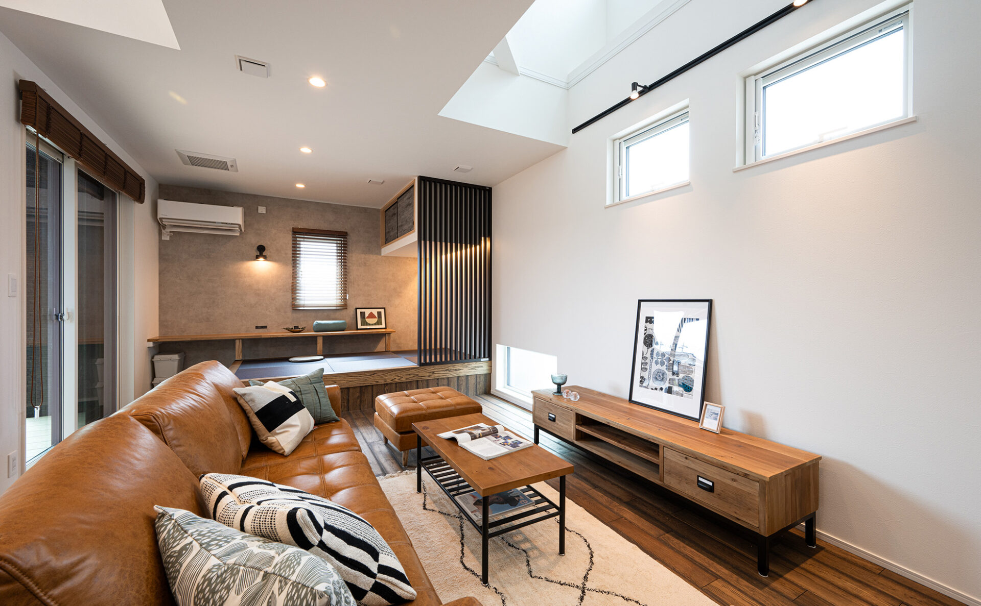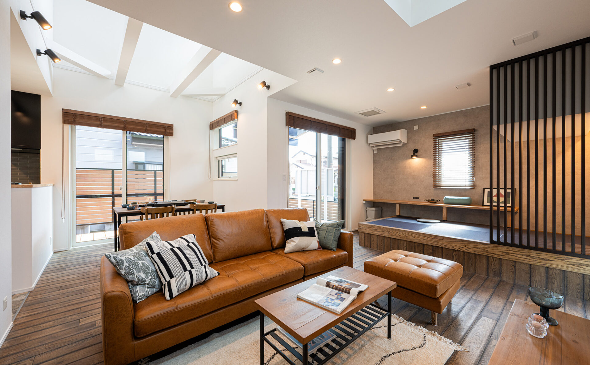 2つの吹き抜けで開放的なLDK、デッキや屋上庭園などの外部空間も備え、家の内外で解放感を感じる住まい。生活に合わせて空間の活用方法を変化させることができるリビングや和室、子ども部屋を採用し、いつまでも暮らしやすい間取りを採用しました。全館空調エアフローシステムや空気清浄システムのトルネックスを搭載し、家全体が快適。また、6.0kWの太陽光発電システムも採用しています。