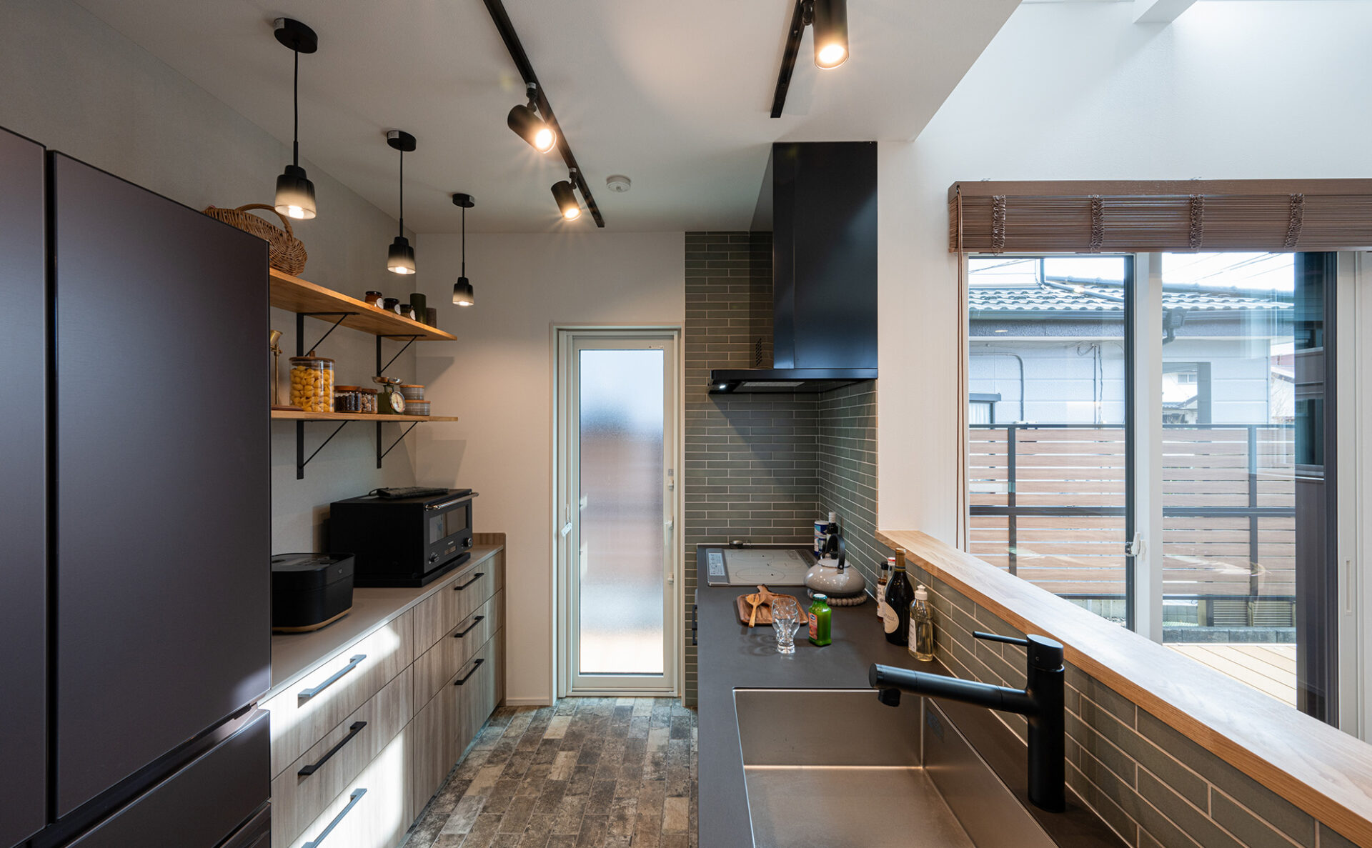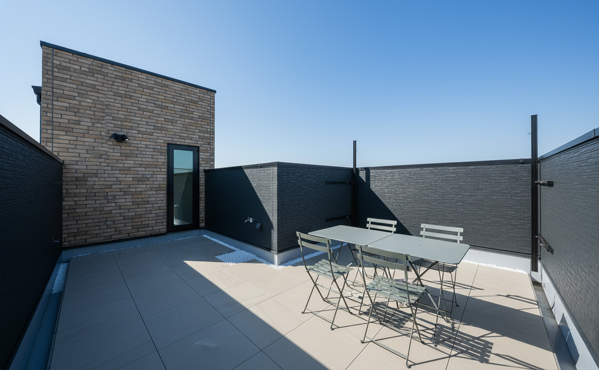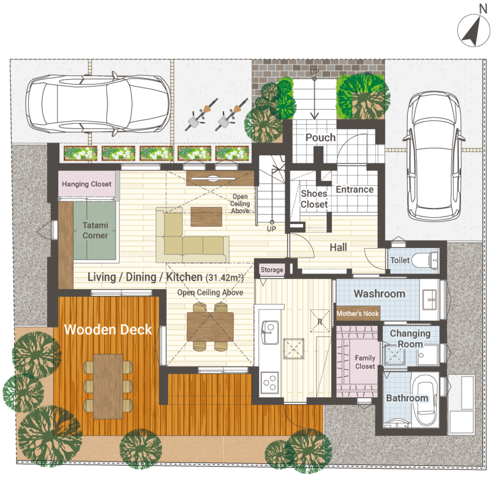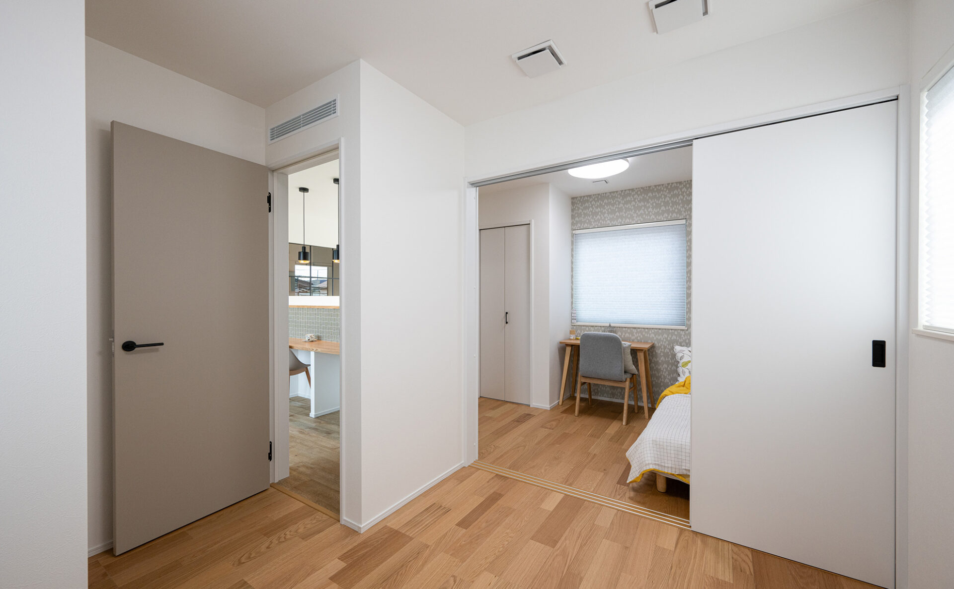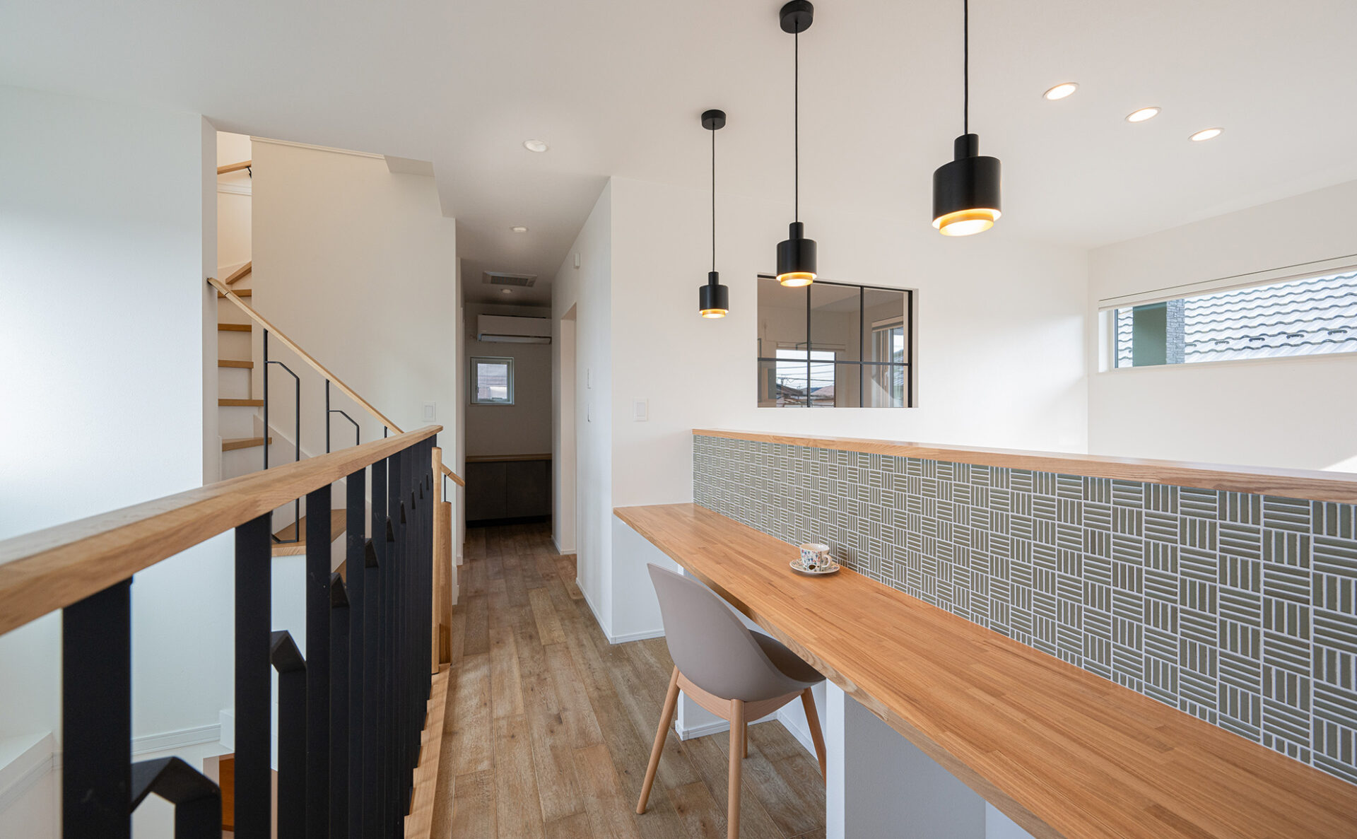 2つの吹き抜けで開放的なLDK、デッキや屋上庭園などの外部空間も備え、家の内外で解放感を感じる住まい。生活に合わせて空間の活用方法を変化させることができるリビングや和室、子ども部屋を採用し、いつまでも暮らしやすい間取りを採用しました。全館空調エアフローシステムや空気清浄システムのトルネックスを搭載し、家全体が快適。また、6.0kWの太陽光発電システムも採用しています。