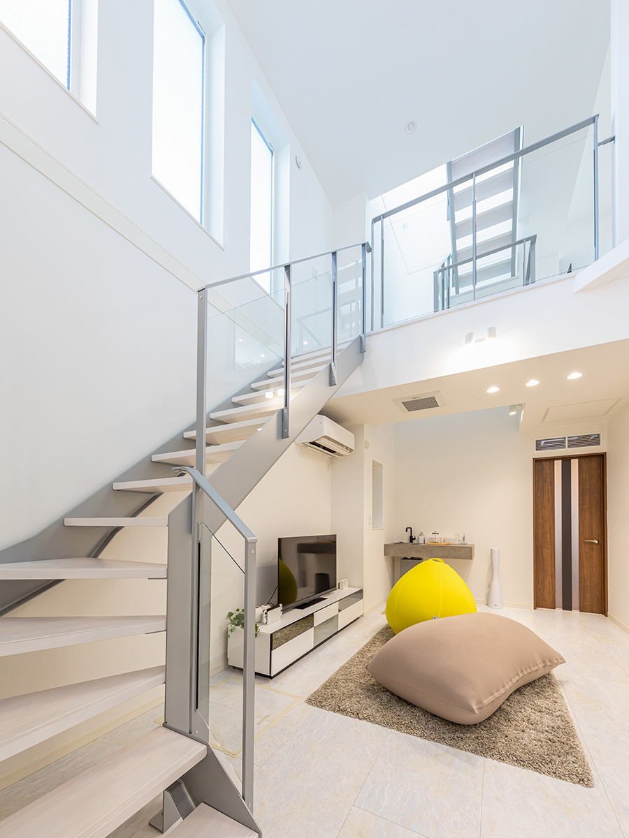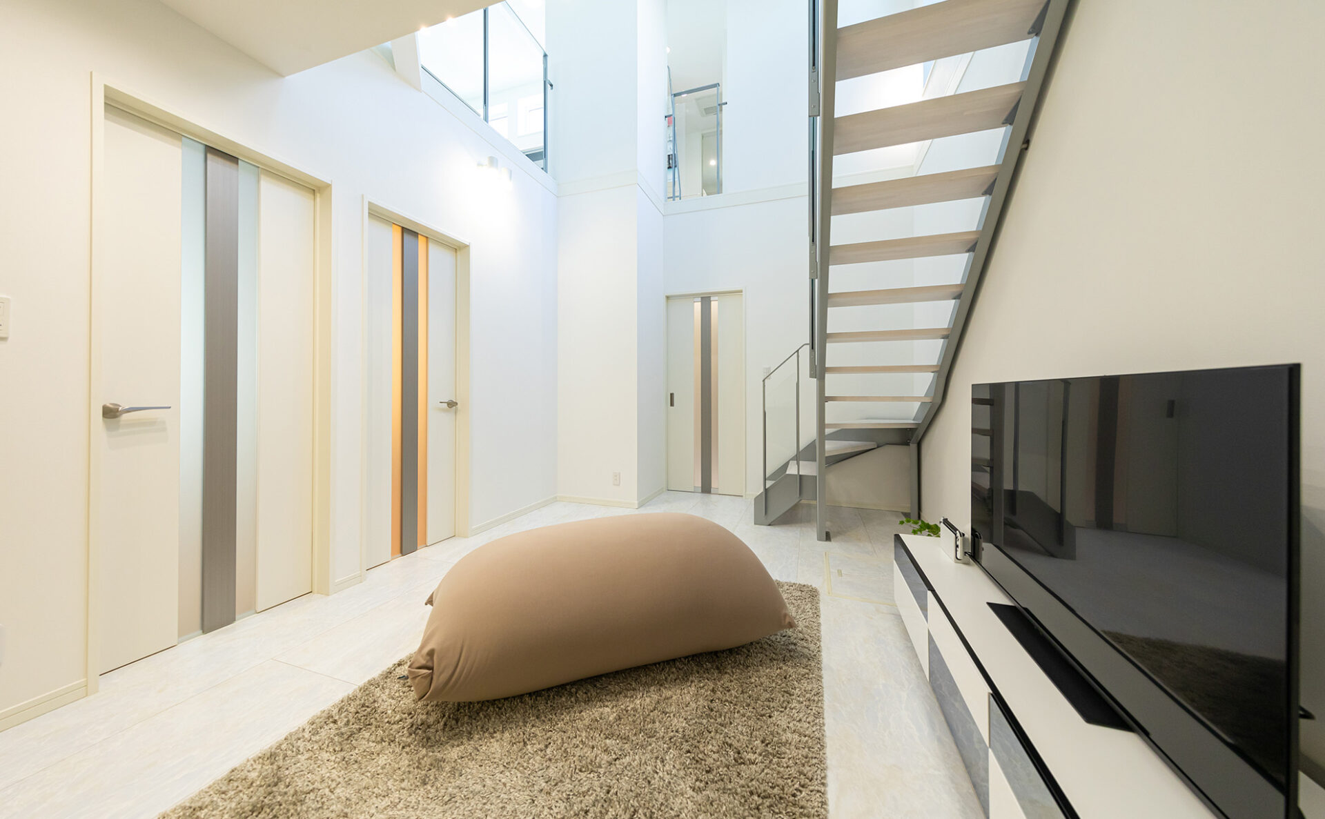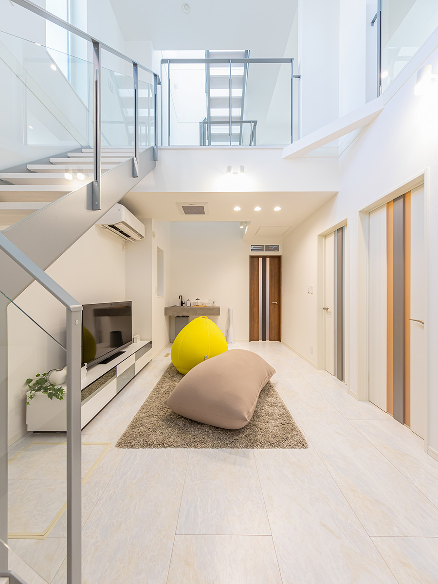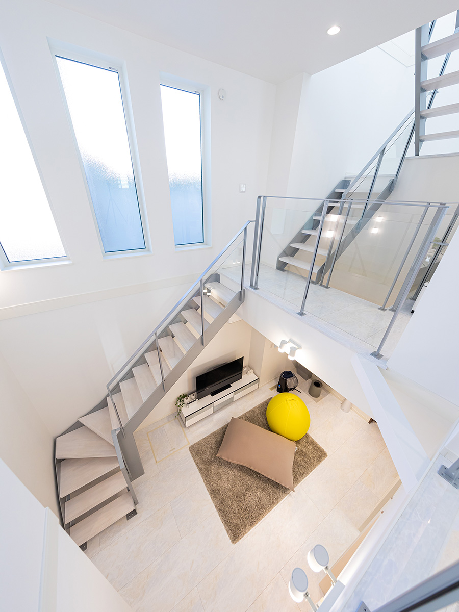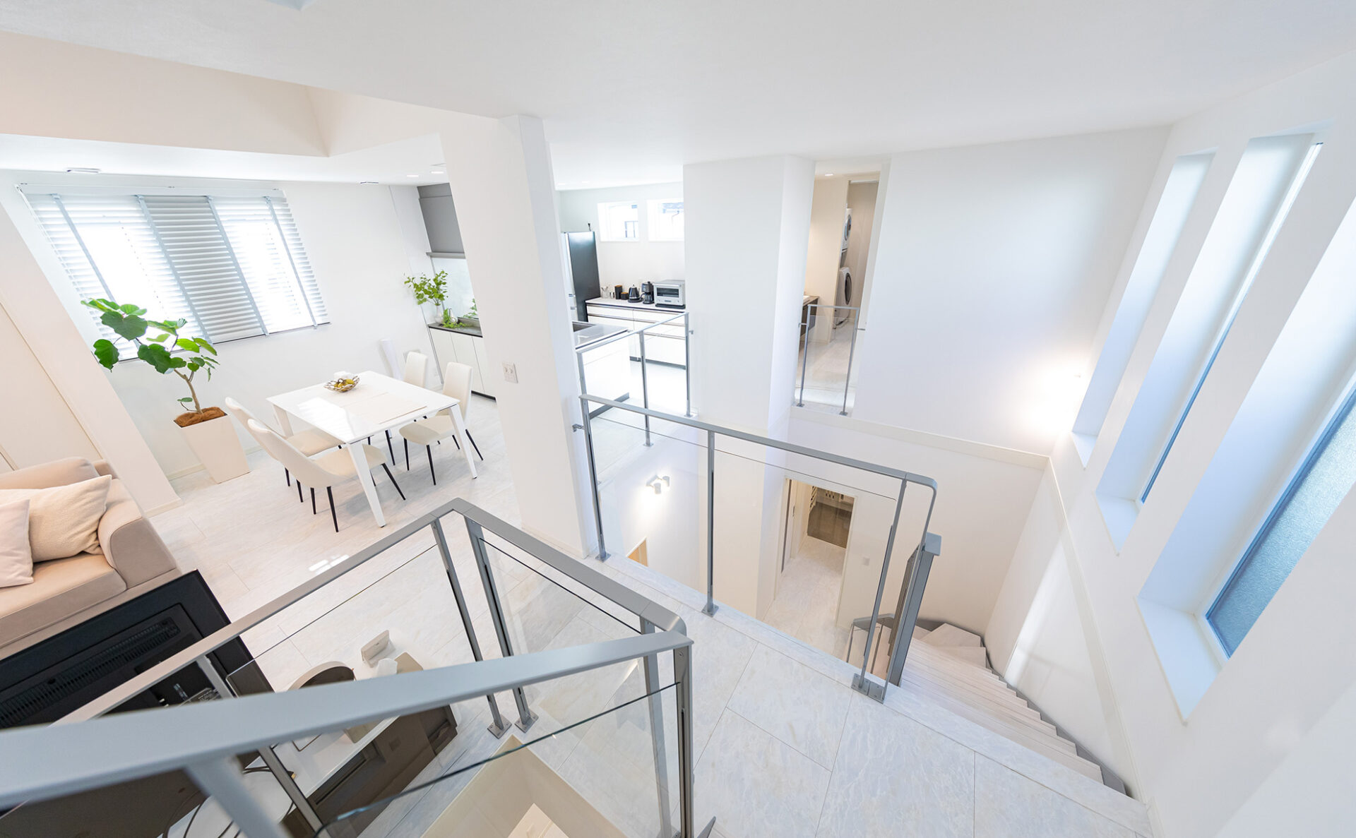 1階から屋上庭園まで吹き抜けで繋がる一室空間。スケルトン階段で光が入る2階LDKは20畳で解放感たっぷり。空気換気システム「エアフローシステム」を採用したモデルハウスをぜひご体感ください。