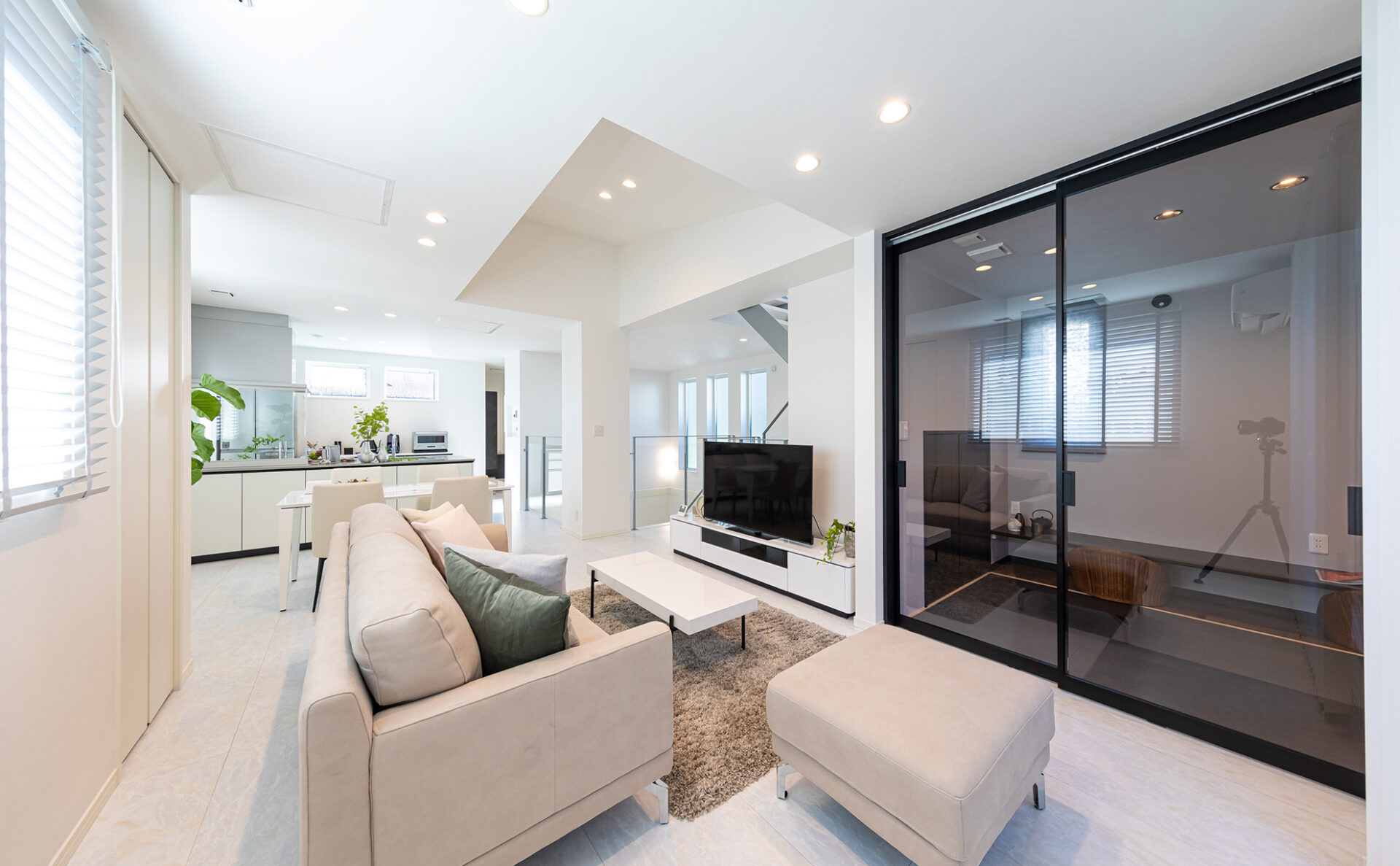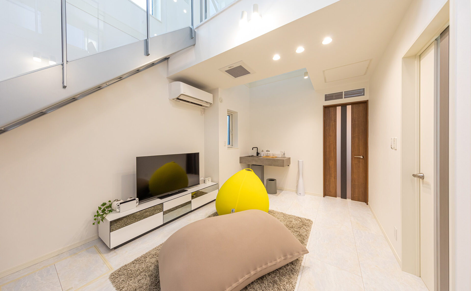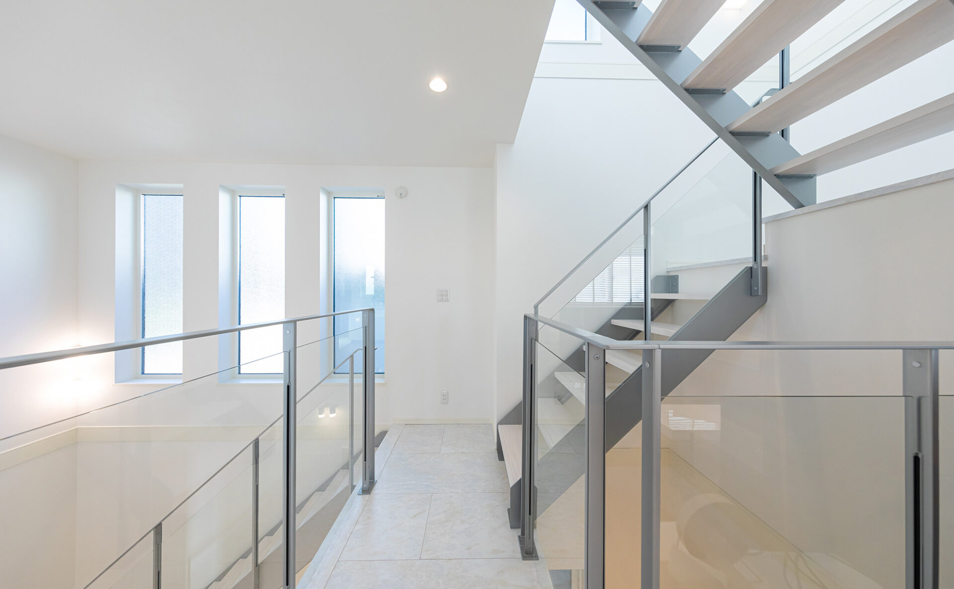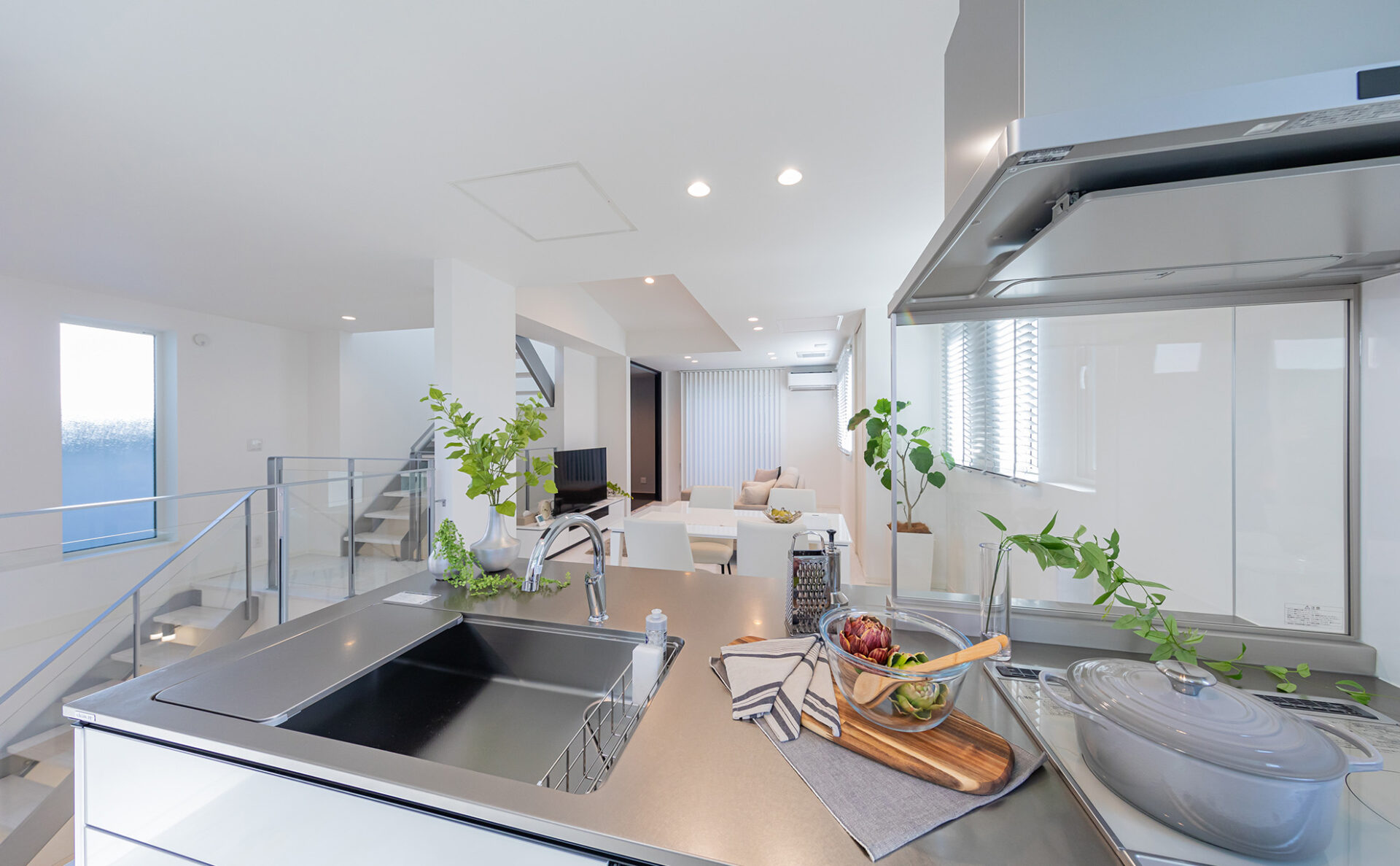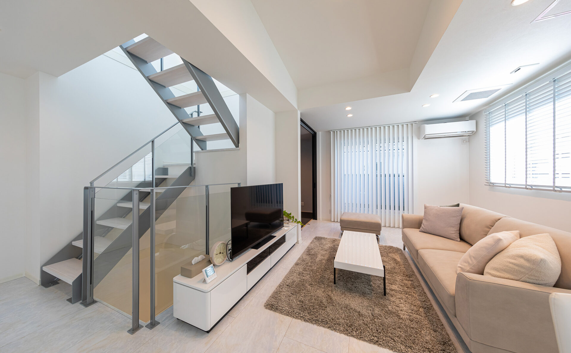 1階から屋上庭園まで吹き抜けで繋がる一室空間。スケルトン階段で光が入る2階LDKは20畳で解放感たっぷり。空気換気システム「エアフローシステム」を採用したモデルハウスをぜひご体感ください。