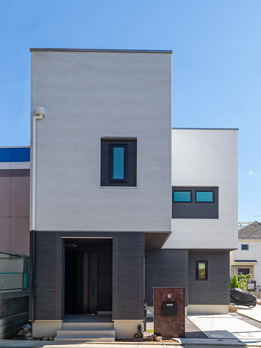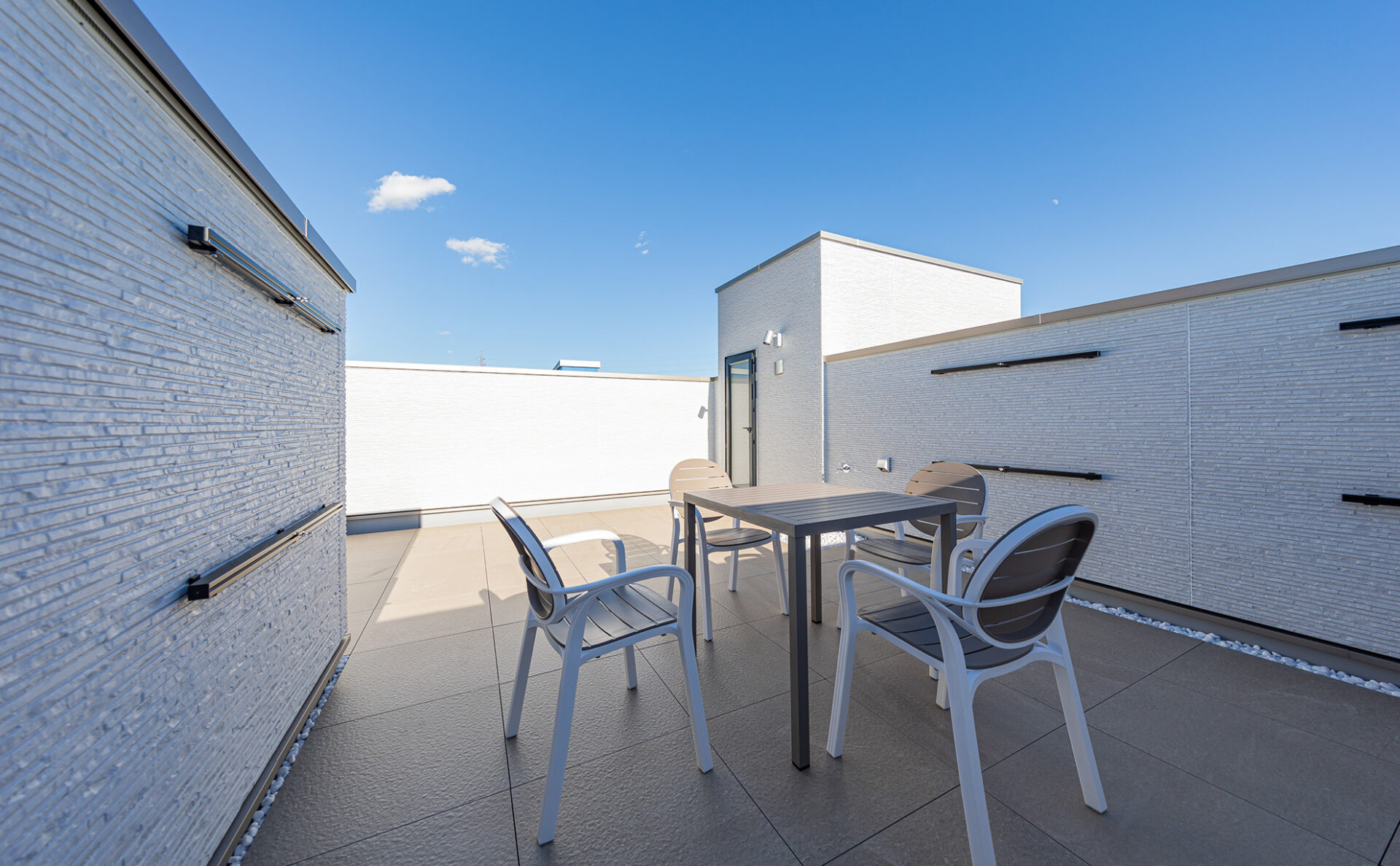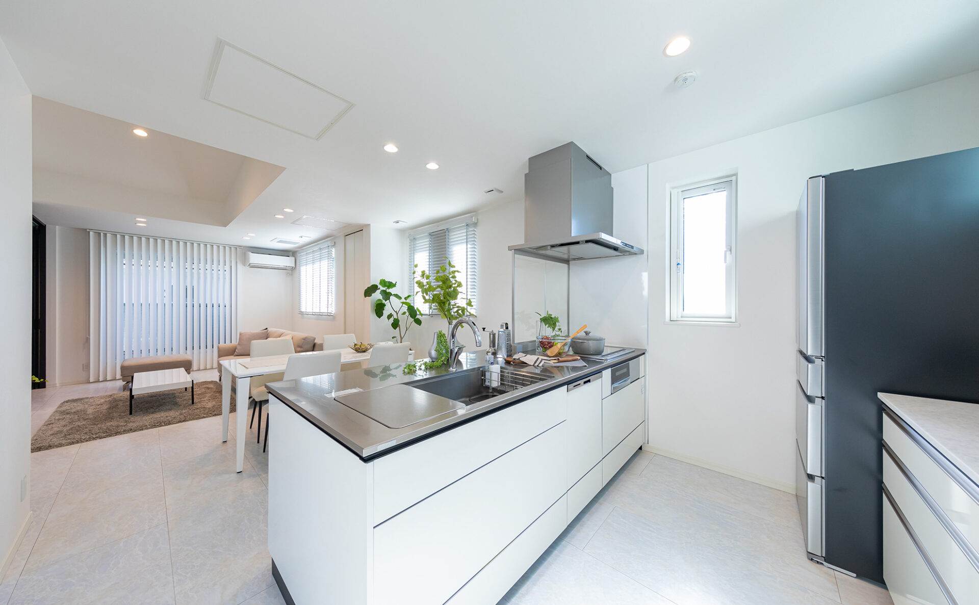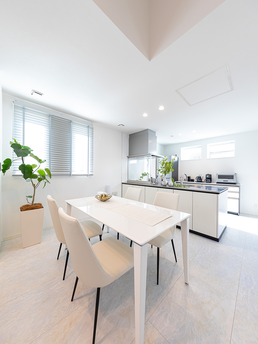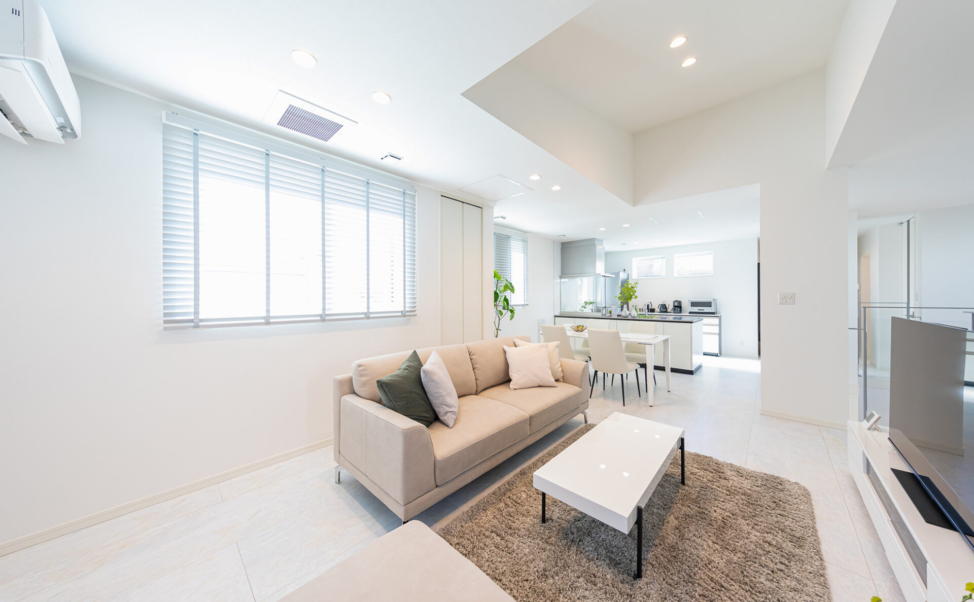 1階から屋上庭園まで吹き抜けで繋がる一室空間。スケルトン階段で光が入る2階LDKは20畳で解放感たっぷり。空気換気システム「エアフローシステム」を採用したモデルハウスをぜひご体感ください。