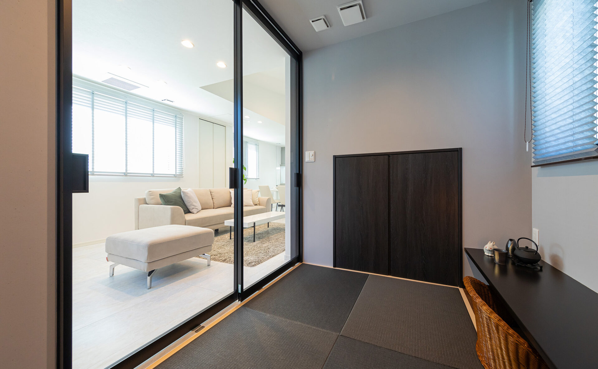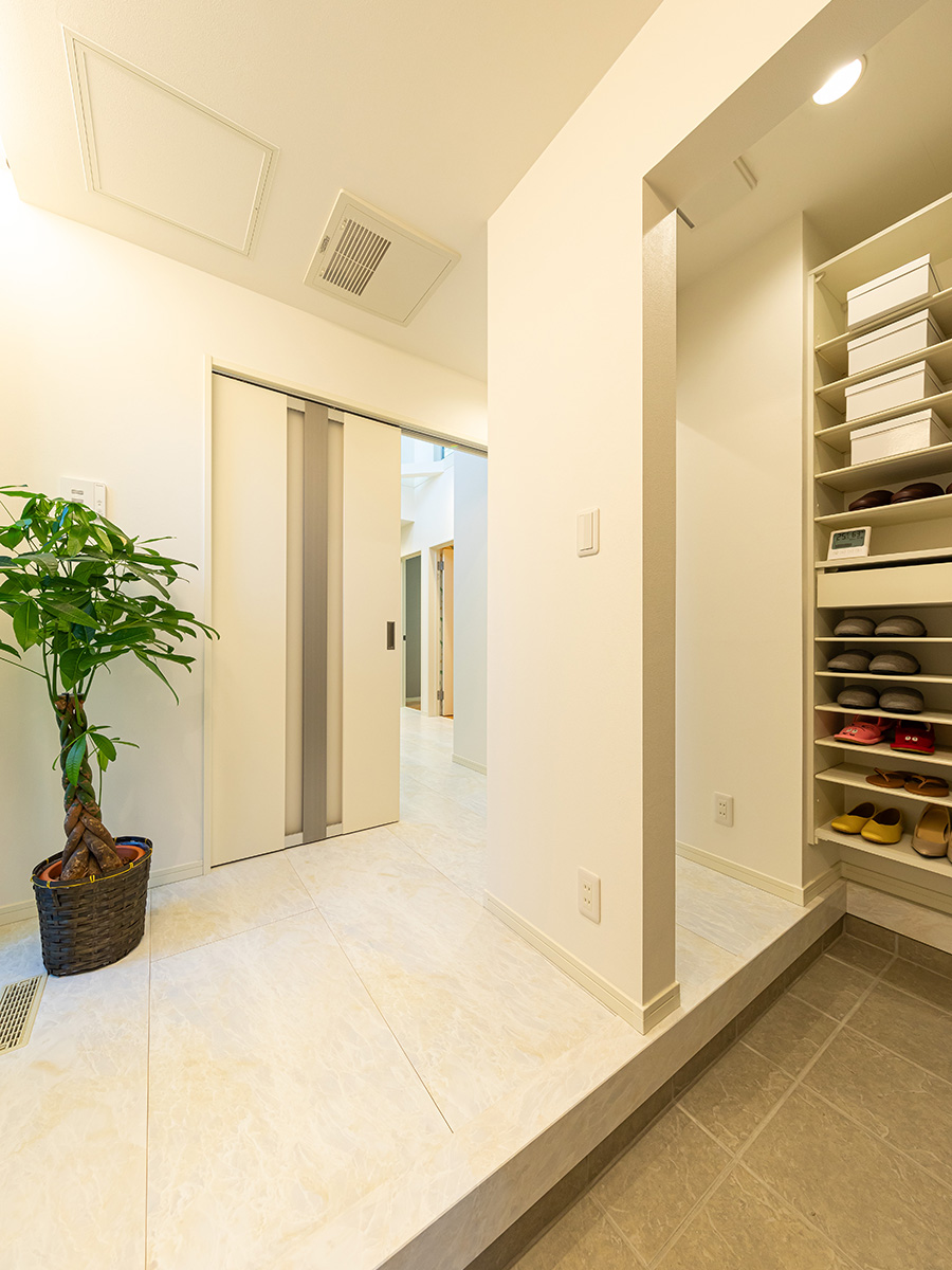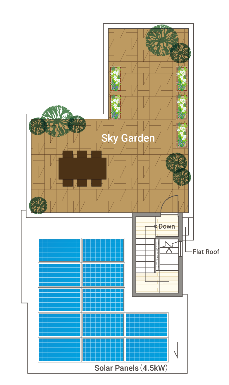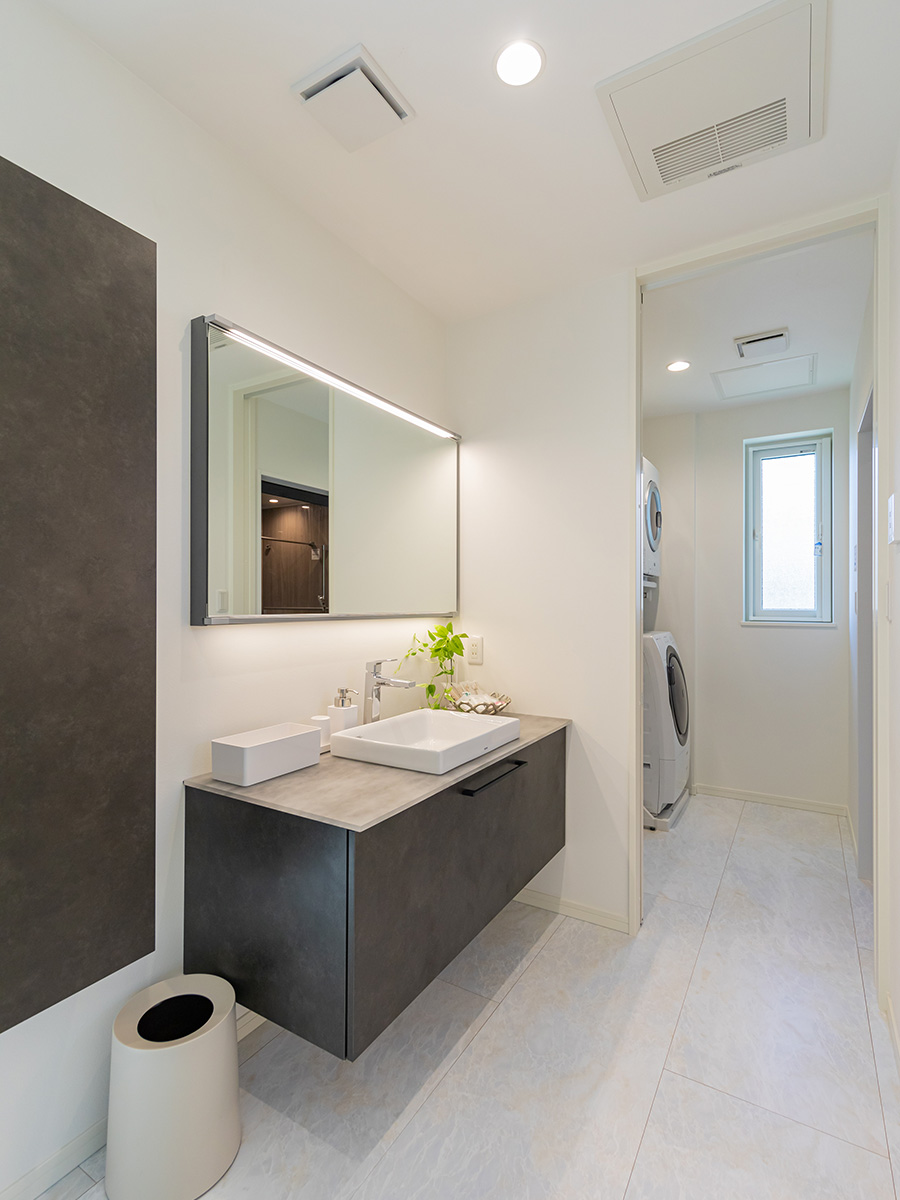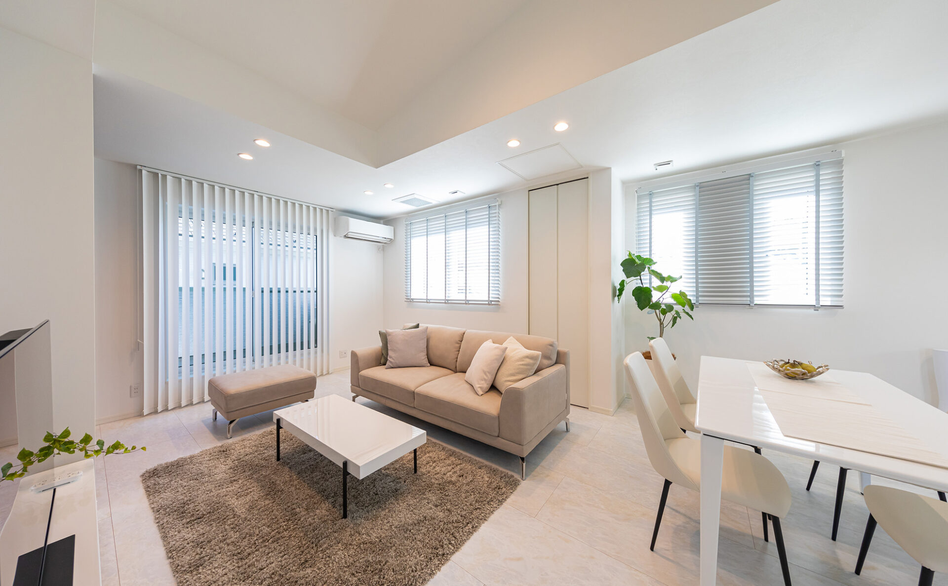 1階から屋上庭園まで吹き抜けで繋がる一室空間。スケルトン階段で光が入る2階LDKは20畳で解放感たっぷり。空気換気システム「エアフローシステム」を採用したモデルハウスをぜひご体感ください。