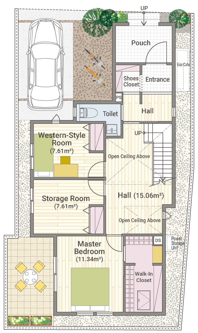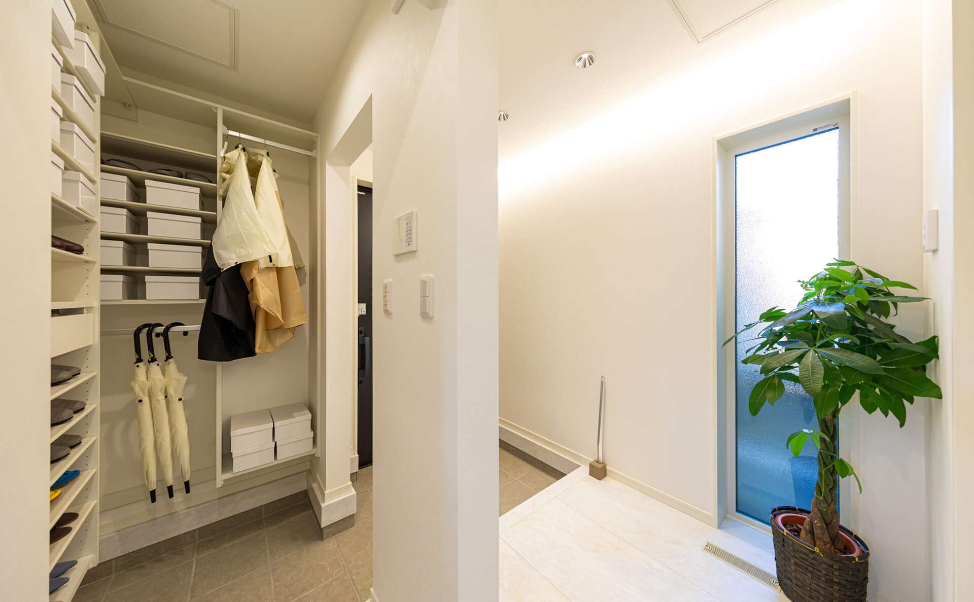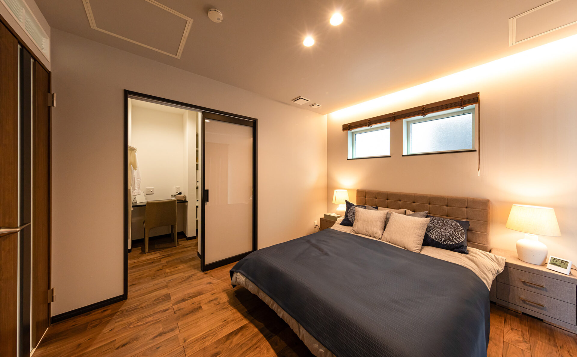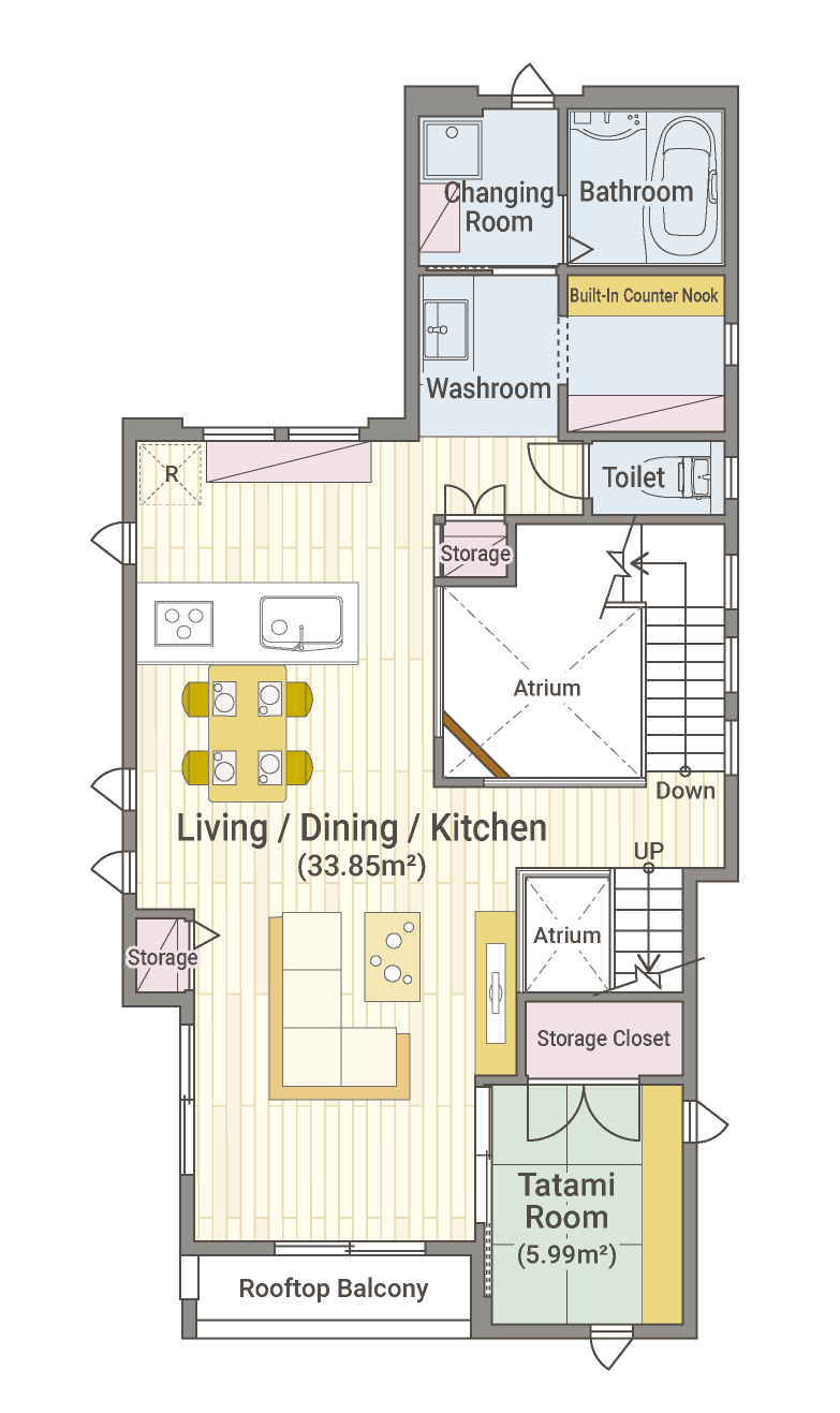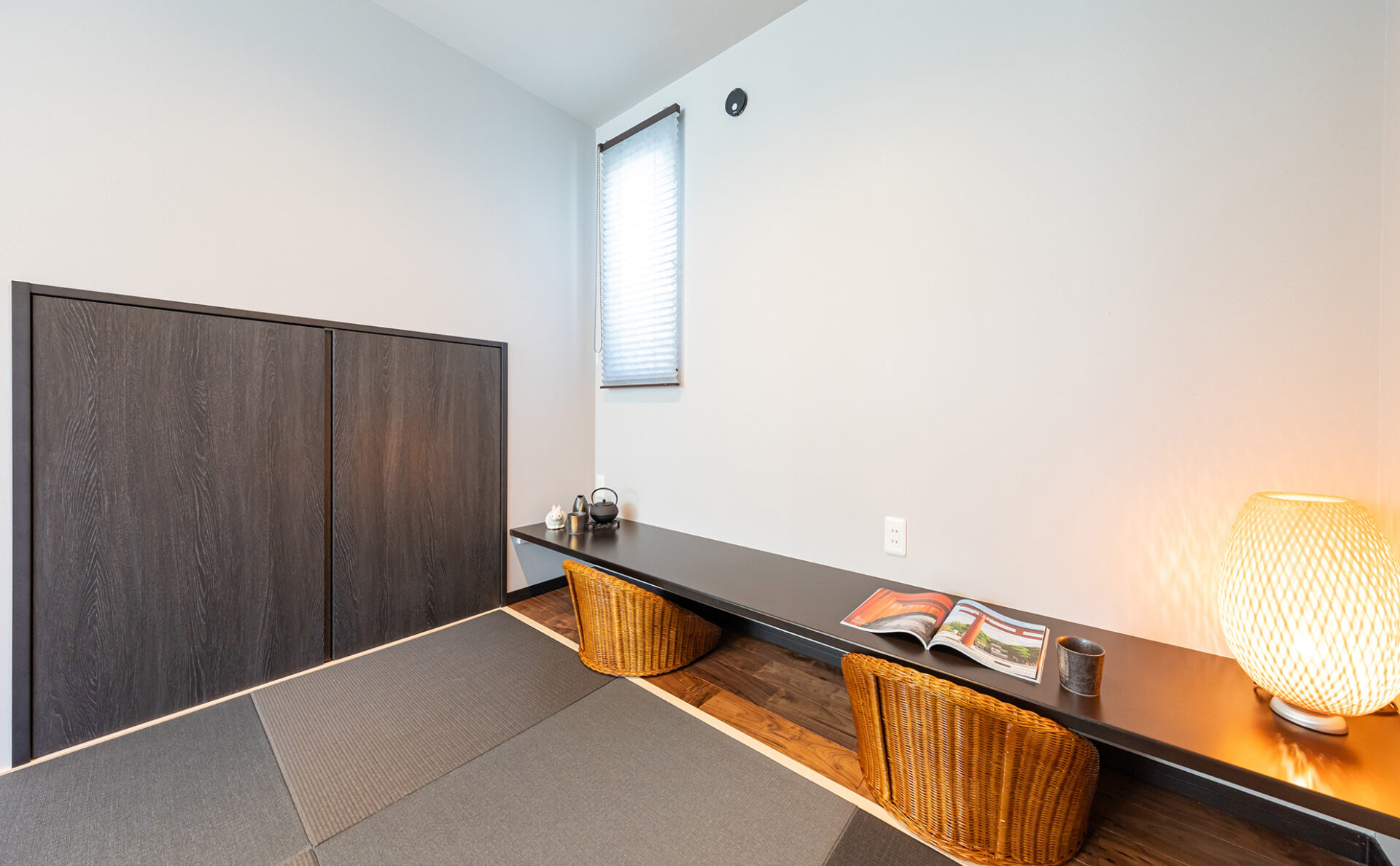 1階から屋上庭園まで吹き抜けで繋がる一室空間。スケルトン階段で光が入る2階LDKは20畳で解放感たっぷり。空気換気システム「エアフローシステム」を採用したモデルハウスをぜひご体感ください。