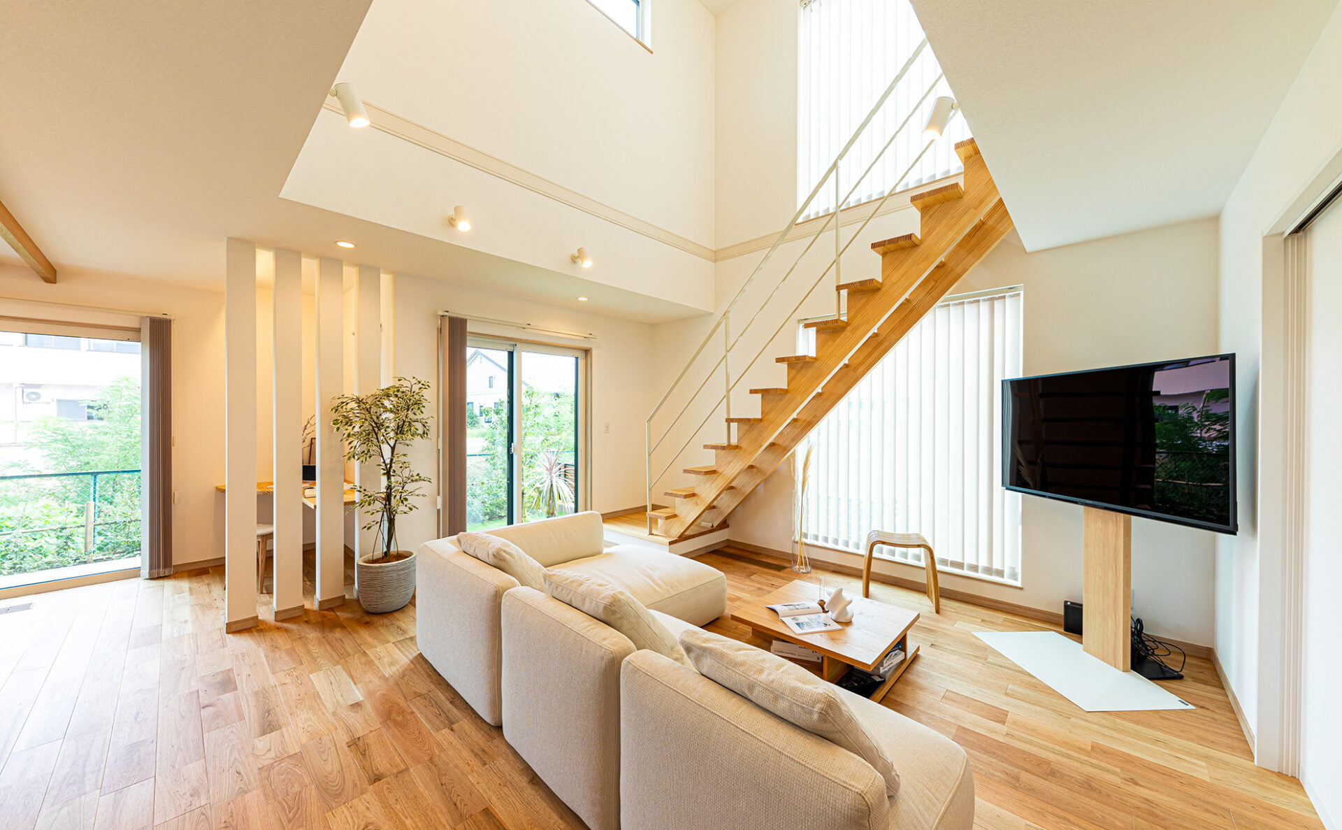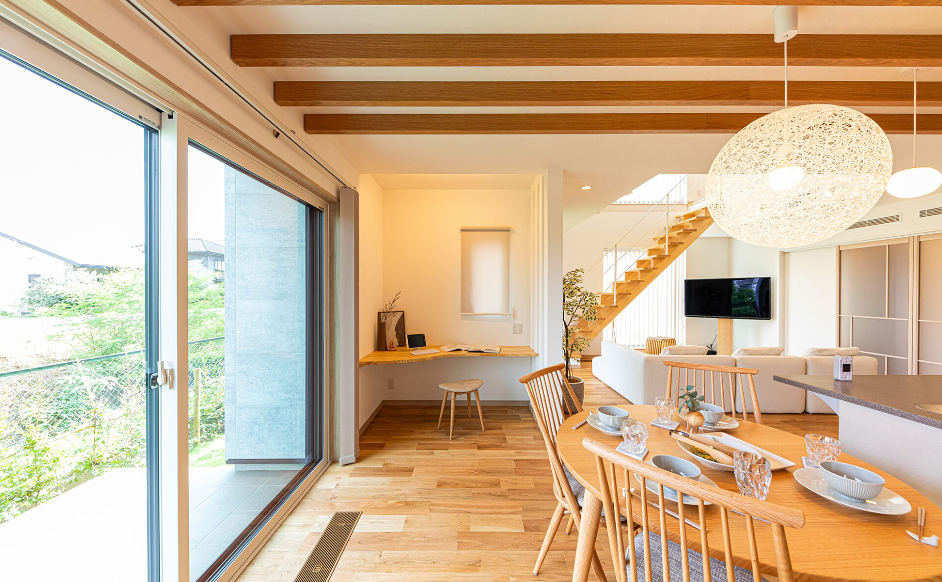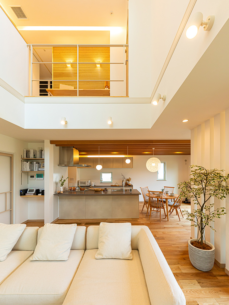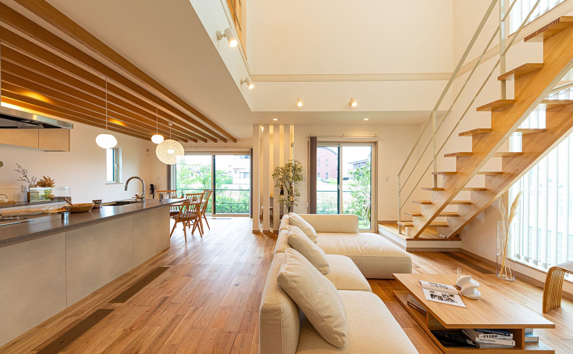 上部吹き抜けを通して家族の声が2階まで響きわたる大空間LDK。家族のコミュニケーションが豊かになる開放的なモデルハウスです。洗面所と脱衣室を分ける間取りや、LDKのスペースを活かしたカウンター、各部屋や廊下に散りばめた収納スペースなどマネしたいポイント満載。YUCACOシステムを採用したモデルハウスをご体感ください。