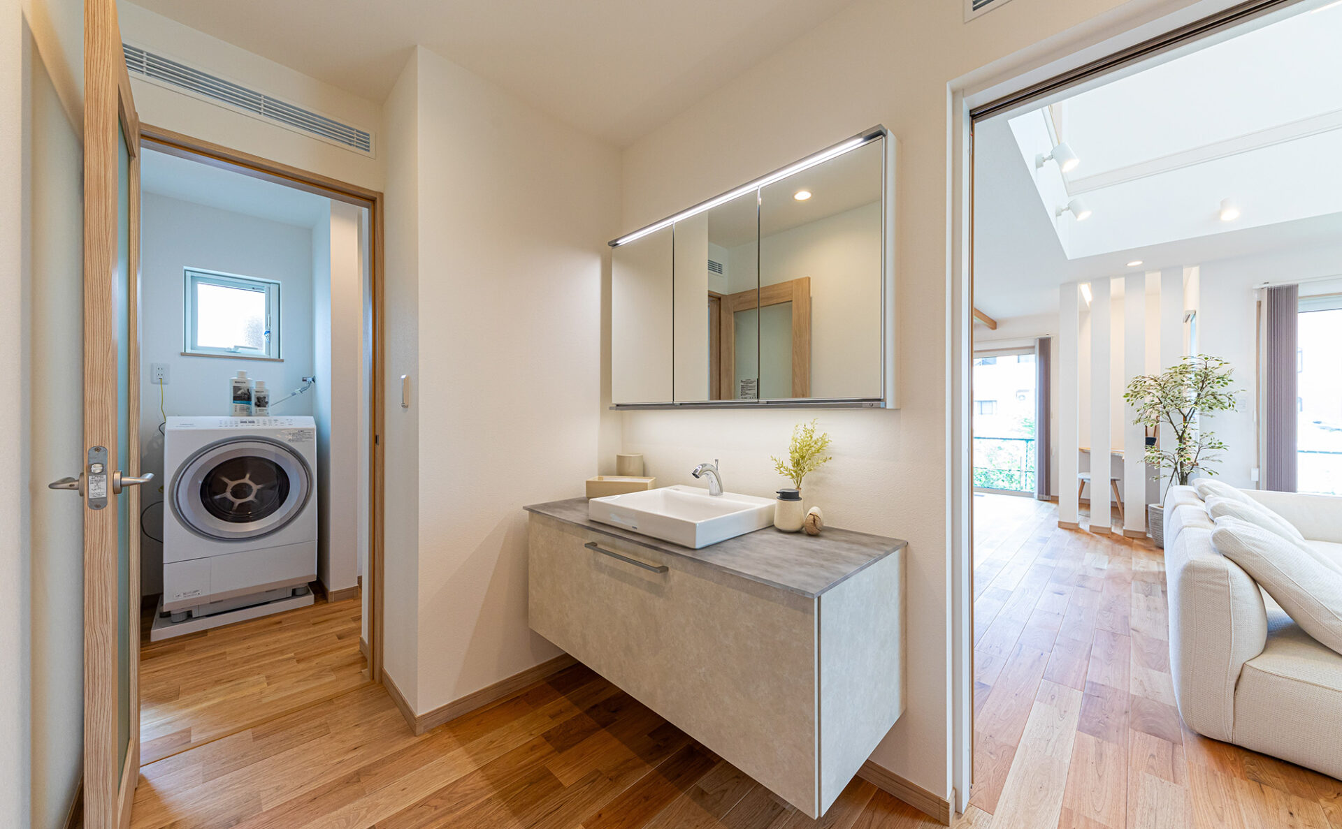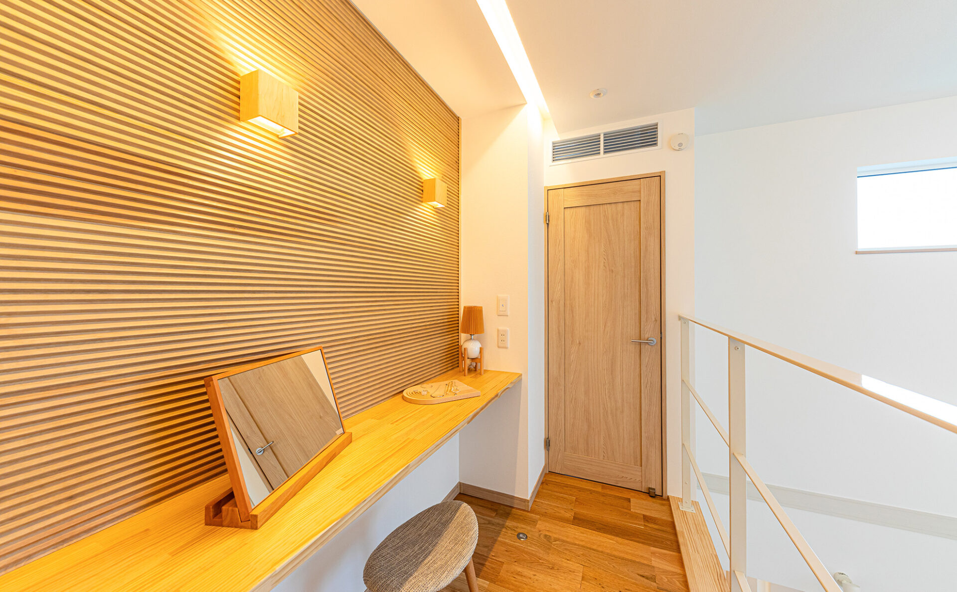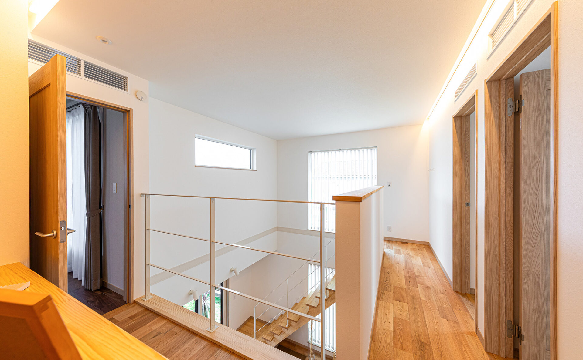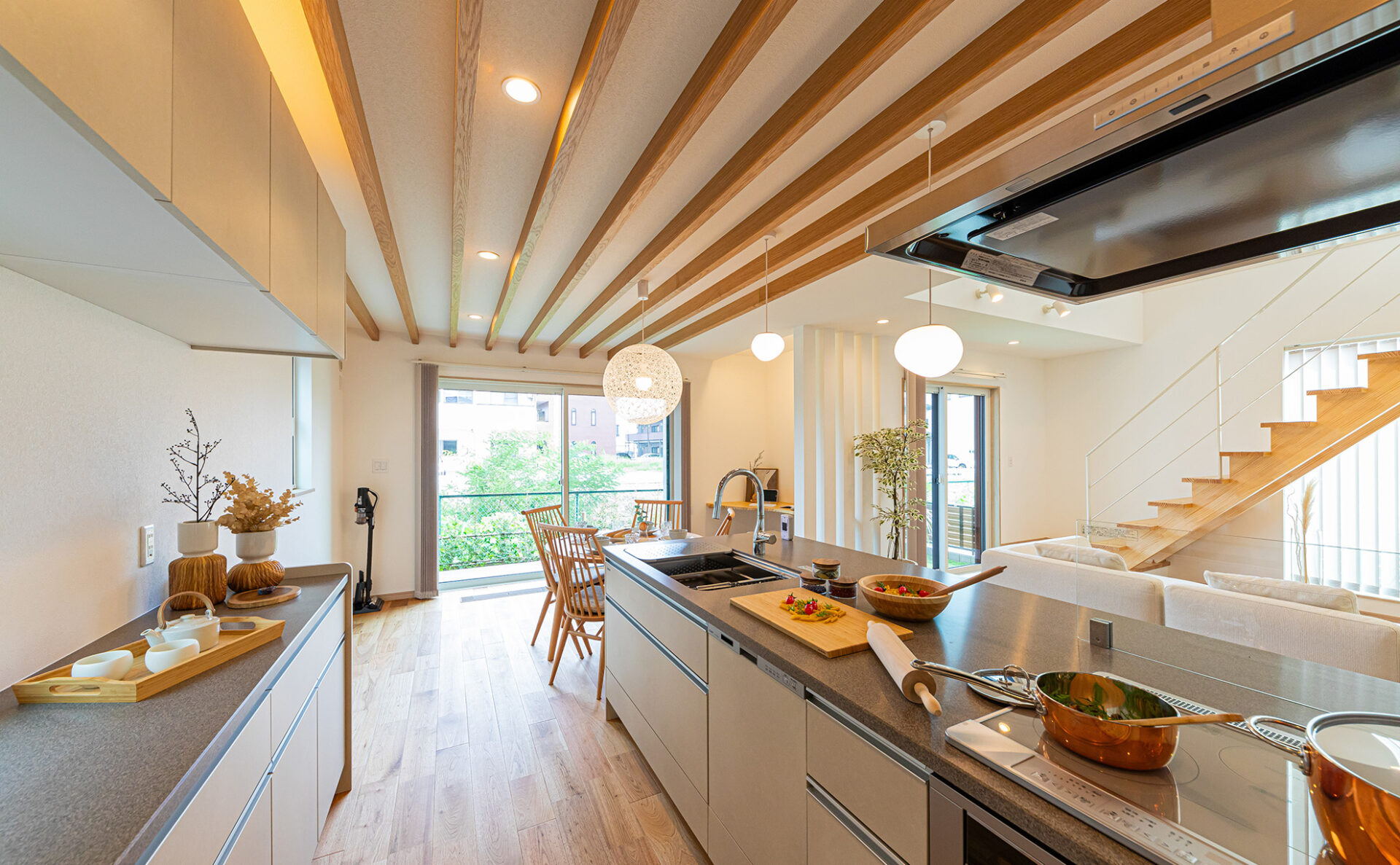 上部吹き抜けを通して家族の声が2階まで響きわたる大空間LDK。家族のコミュニケーションが豊かになる開放的なモデルハウスです。洗面所と脱衣室を分ける間取りや、LDKのスペースを活かしたカウンター、各部屋や廊下に散りばめた収納スペースなどマネしたいポイント満載。YUCACOシステムを採用したモデルハウスをご体感ください。
