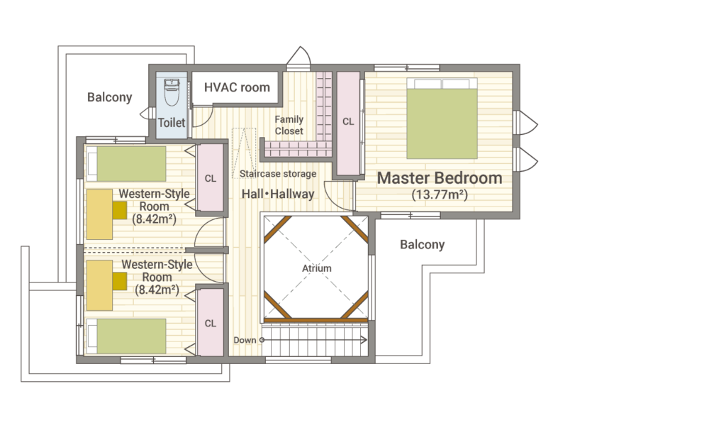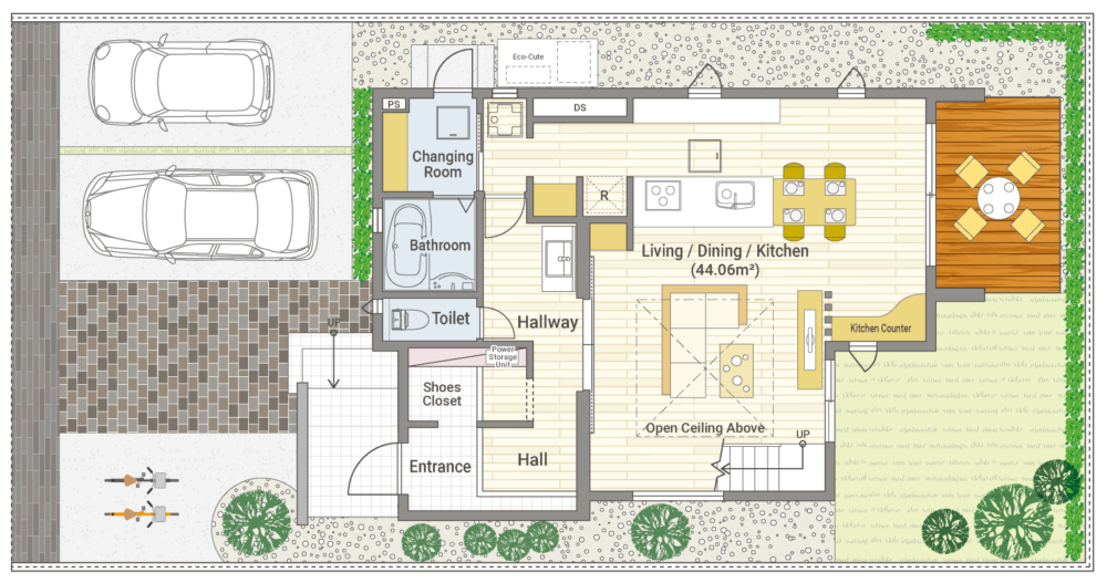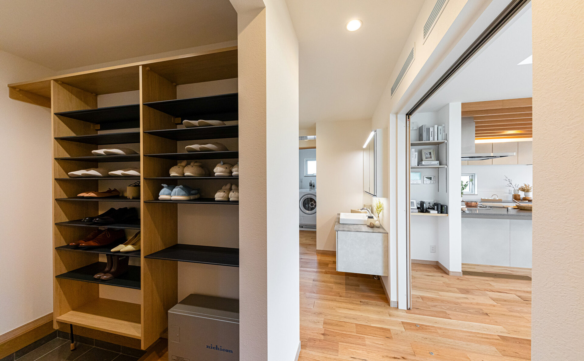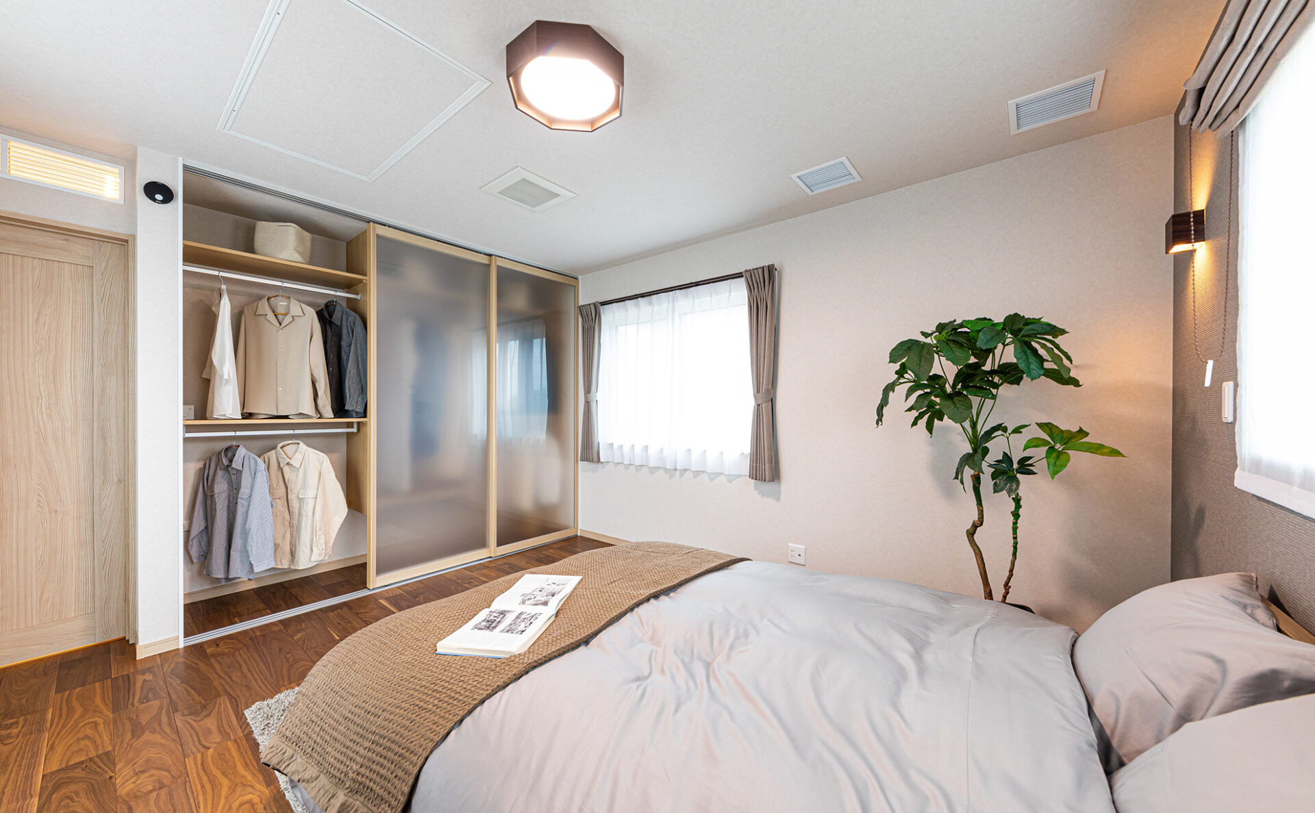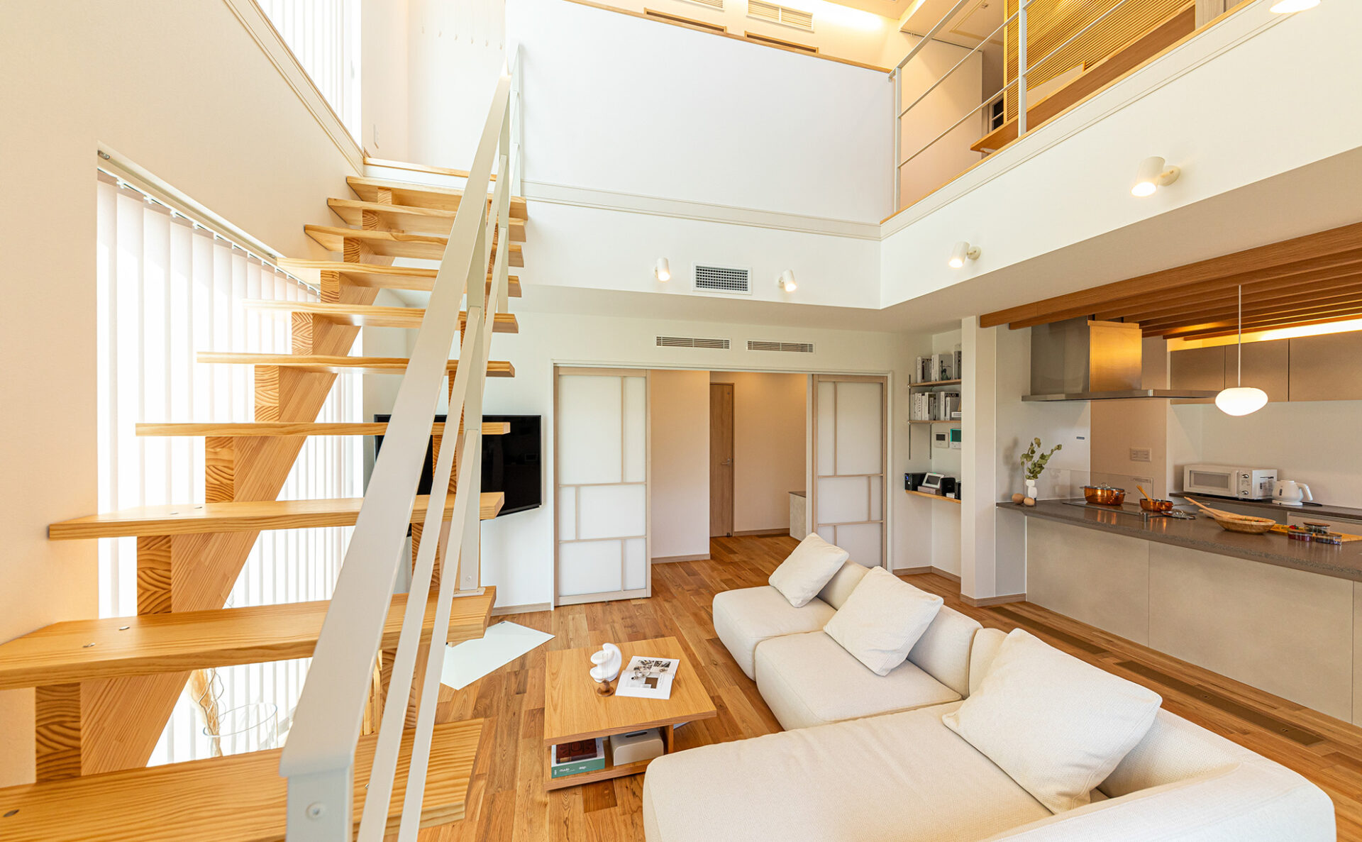 上部吹き抜けを通して家族の声が2階まで響きわたる大空間LDK。家族のコミュニケーションが豊かになる開放的なモデルハウスです。洗面所と脱衣室を分ける間取りや、LDKのスペースを活かしたカウンター、各部屋や廊下に散りばめた収納スペースなどマネしたいポイント満載。YUCACOシステムを採用したモデルハウスをご体感ください。