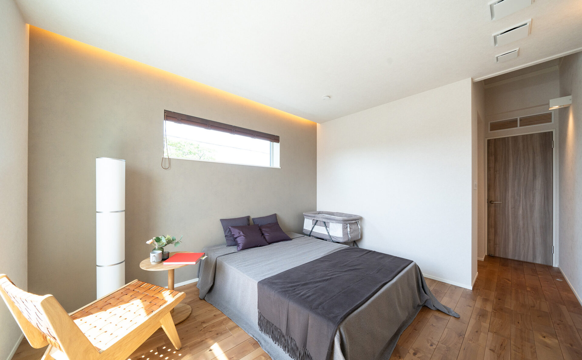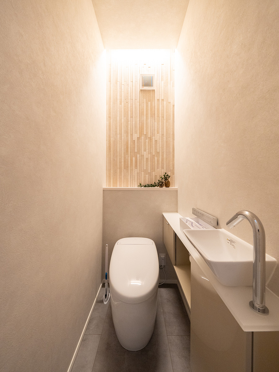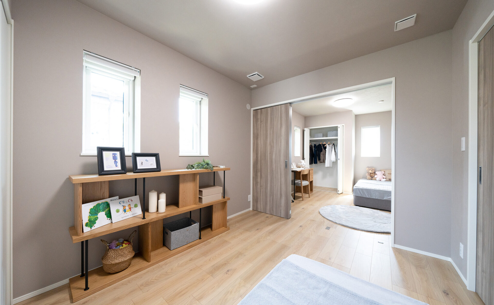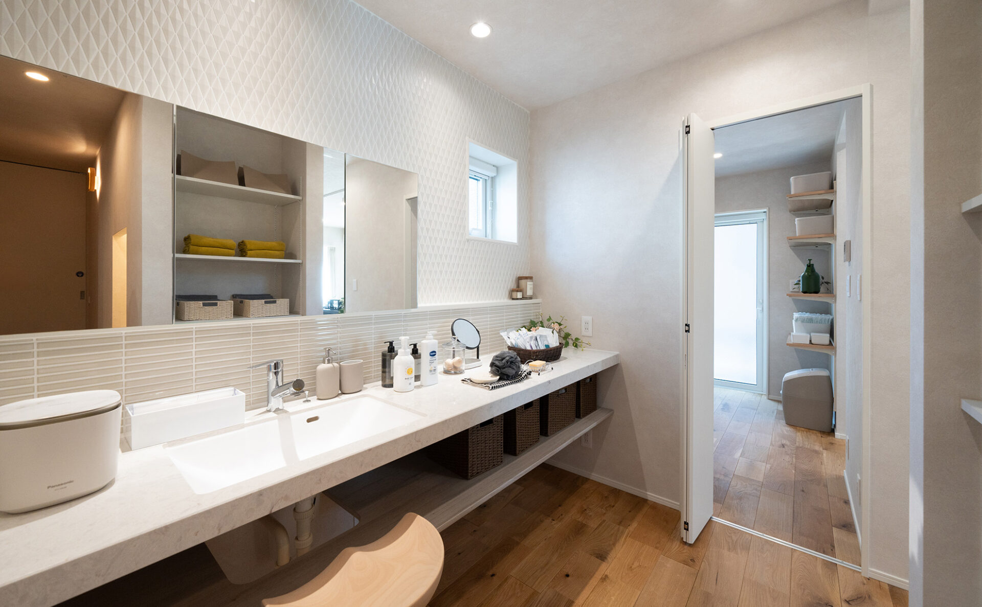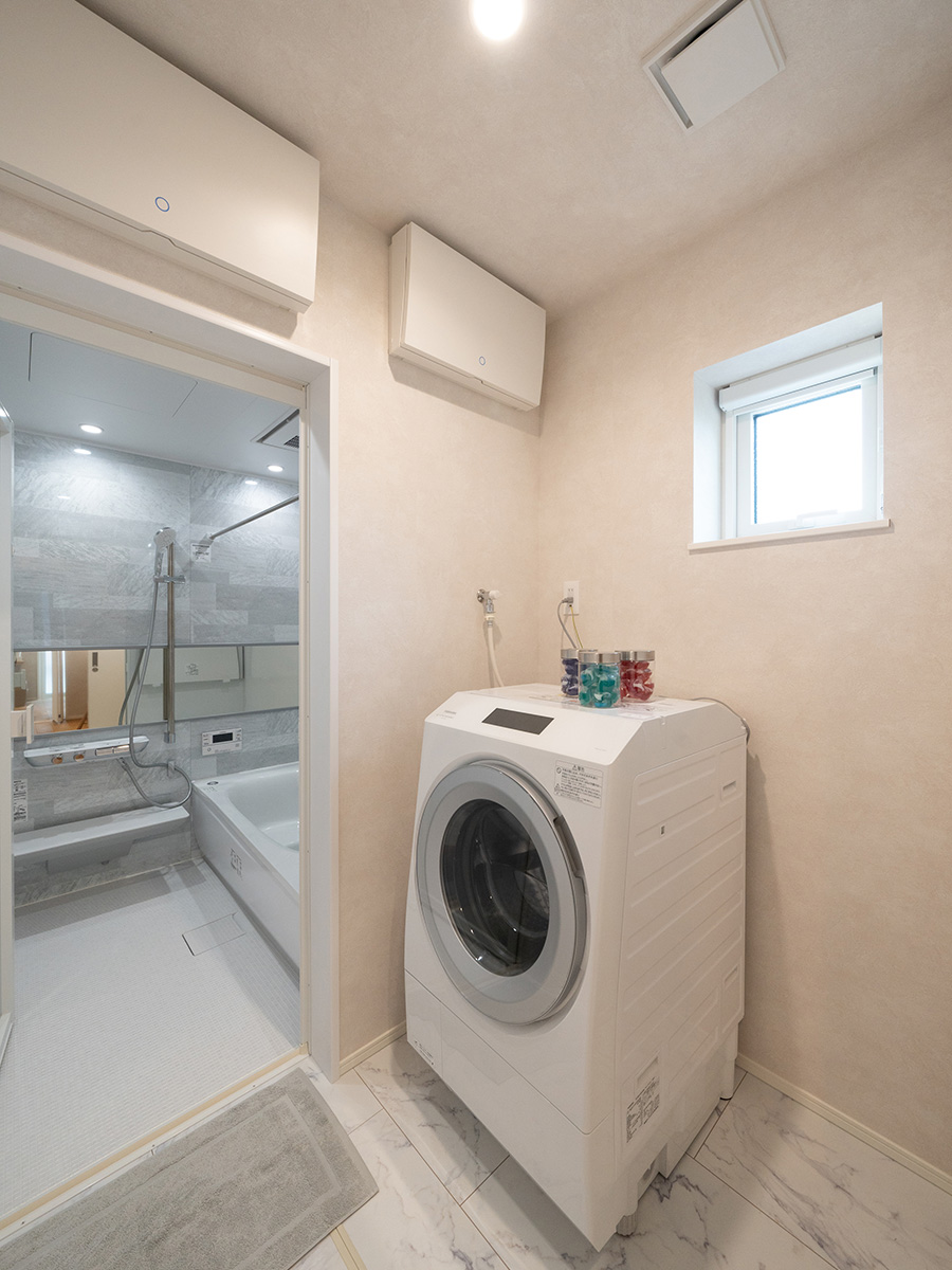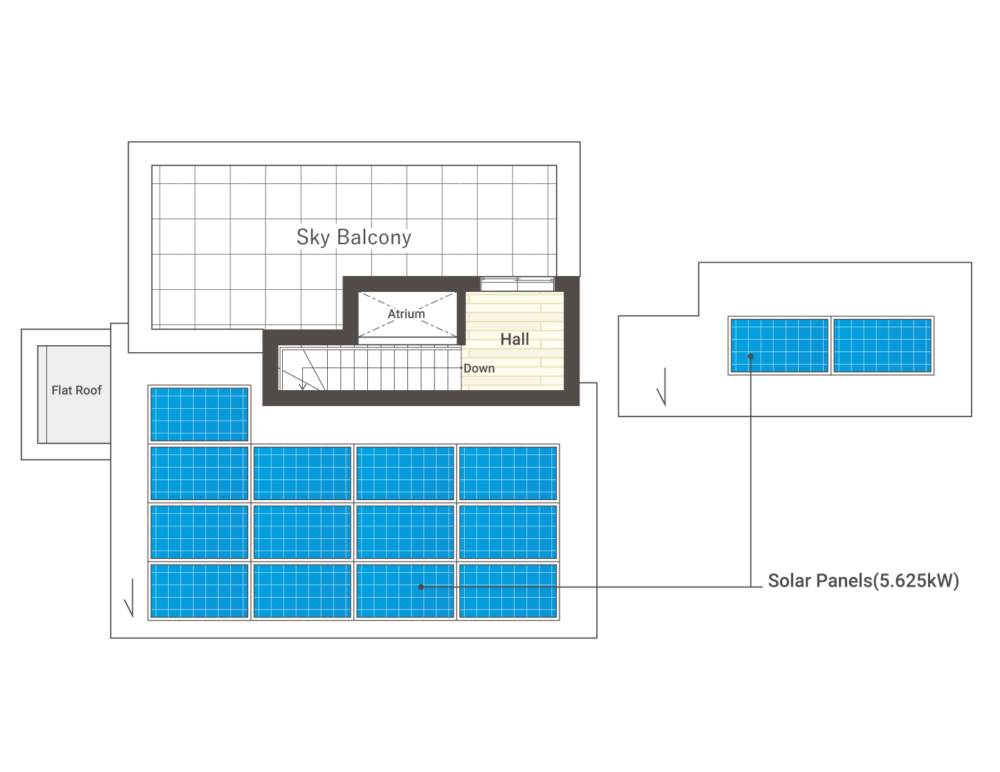 オープンで明るい空間のモデルハウスは、家族の団らんに最適の間取り。広々としており、家具の配置も自由度が高い空間です。また、大容量のファミリークローゼットや独立した書斎スペースなど、収納と機能性を重視した設計で、快適で効率的な生活をお送りいただけます。太陽光パネルを約5.6kw搭載しており、家計に優しい暮らしを実現。また、エアフローシステムを搭載し、1年中快適な暮らしをご体感いただけます。