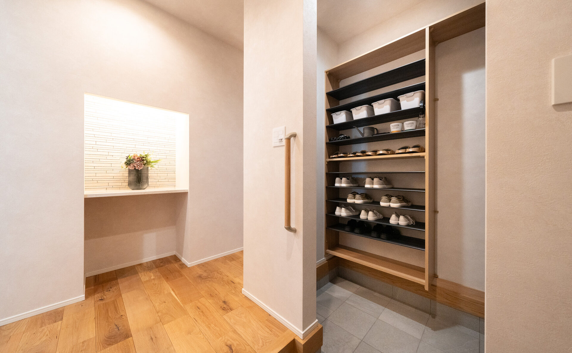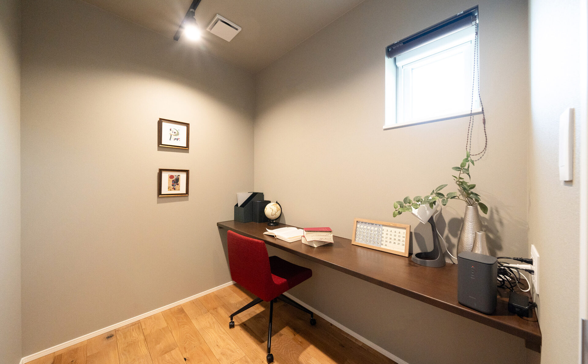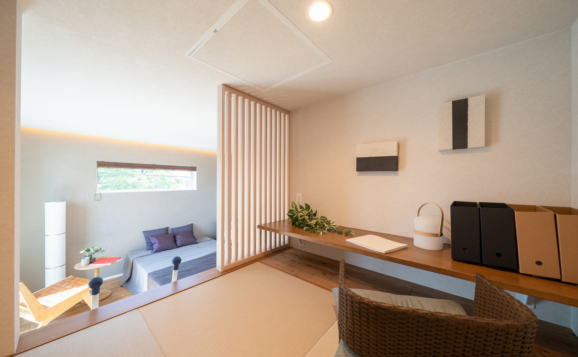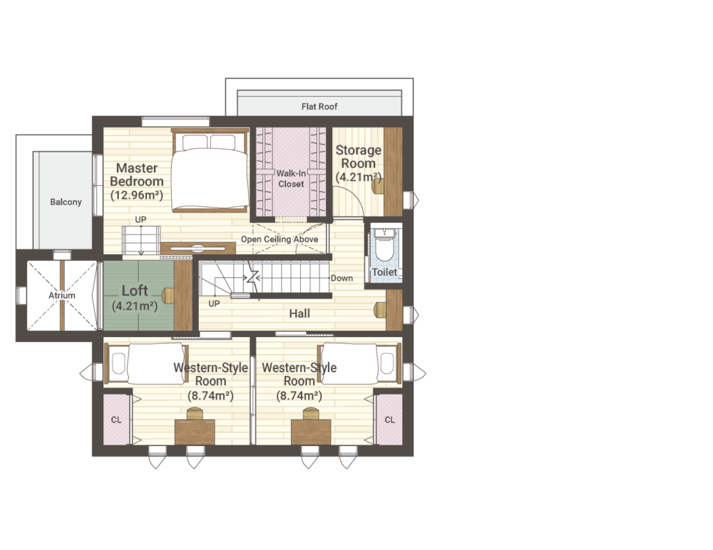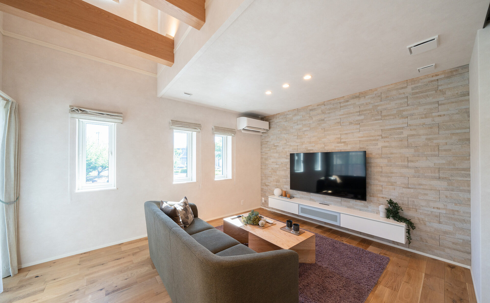 オープンで明るい空間のモデルハウスは、家族の団らんに最適の間取り。広々としており、家具の配置も自由度が高い空間です。また、大容量のファミリークローゼットや独立した書斎スペースなど、収納と機能性を重視した設計で、快適で効率的な生活をお送りいただけます。太陽光パネルを約5.6kw搭載しており、家計に優しい暮らしを実現。また、エアフローシステムを搭載し、1年中快適な暮らしをご体感いただけます。
