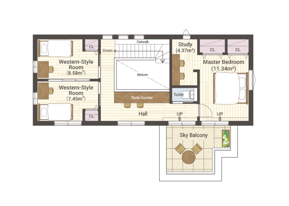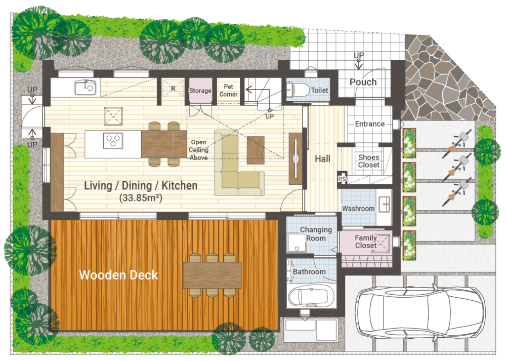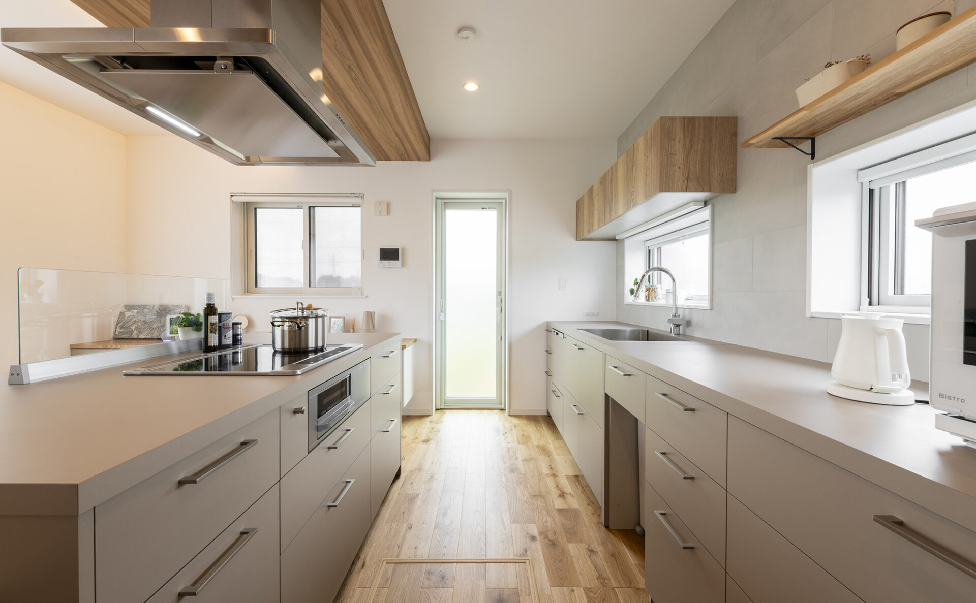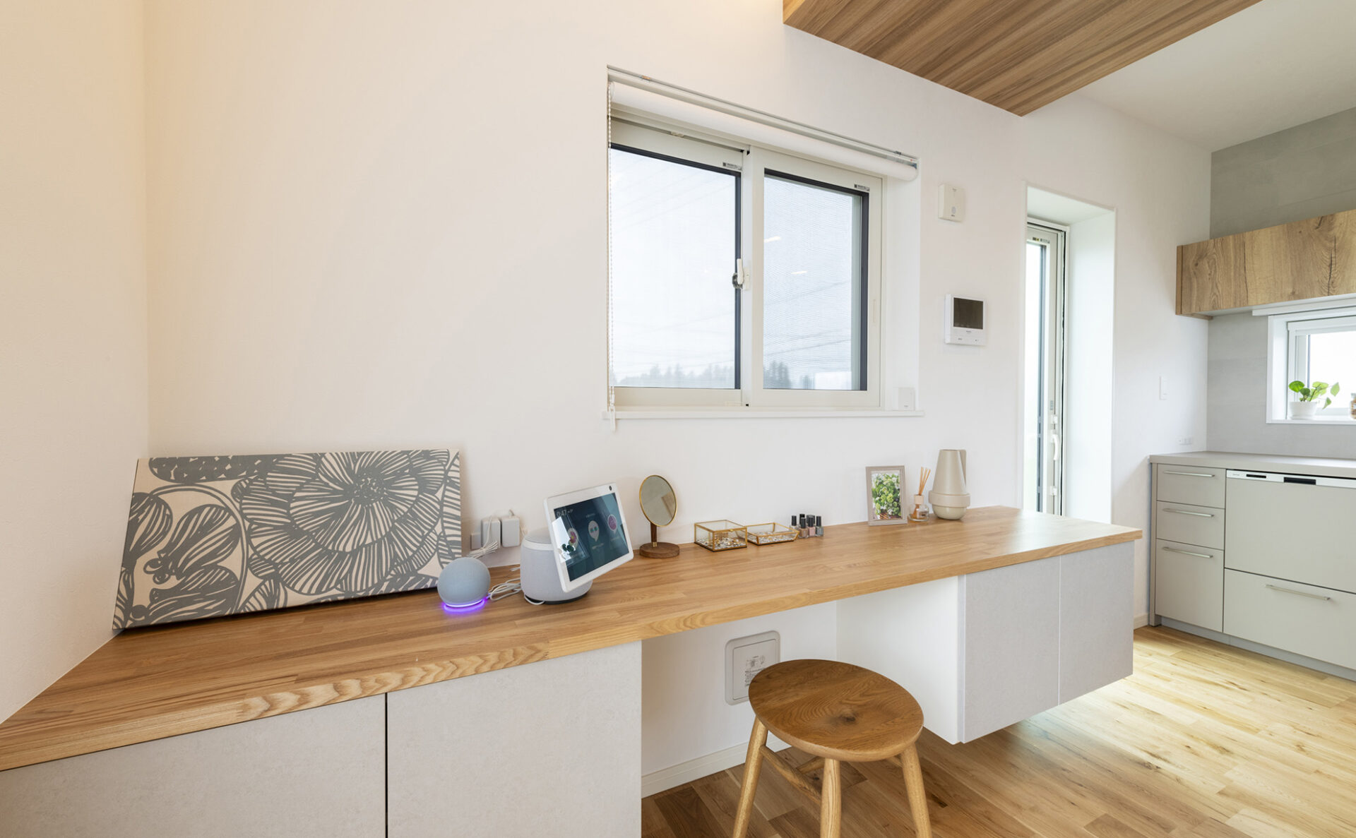 閑静なエリアに建つモデルハウスは、高い断熱性能を誇る住み心地に優れた住まい。解放感と快適性を兼ね備え、最高水準の断熱性能を誇ります。リビングと連続したウッドデッキや、バルコニーなどのアウトドア空間も充実しており、風と光を感じる健やかな住まいです。エアフロ―システムを搭載し、家全体が快適。9.0kWの太陽光パネルを採用し家計と地球にやさしい住まいです。