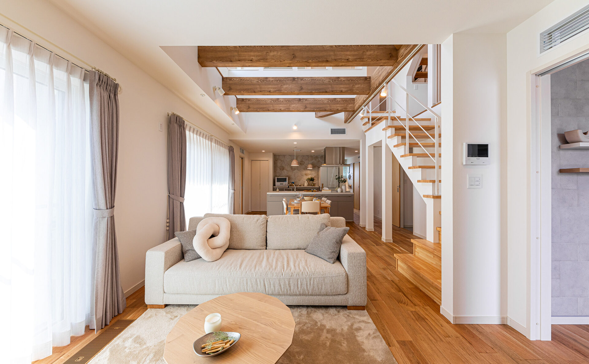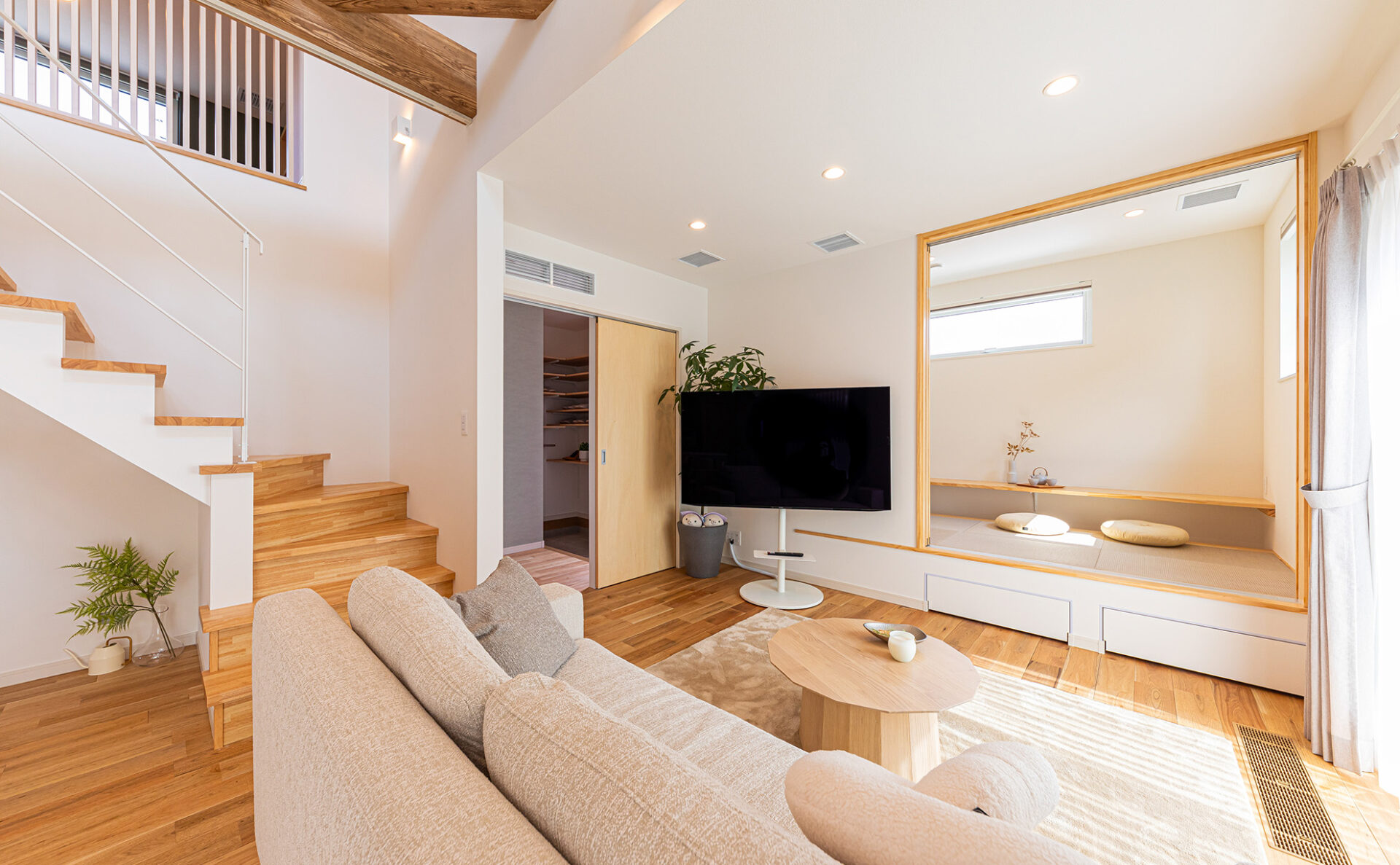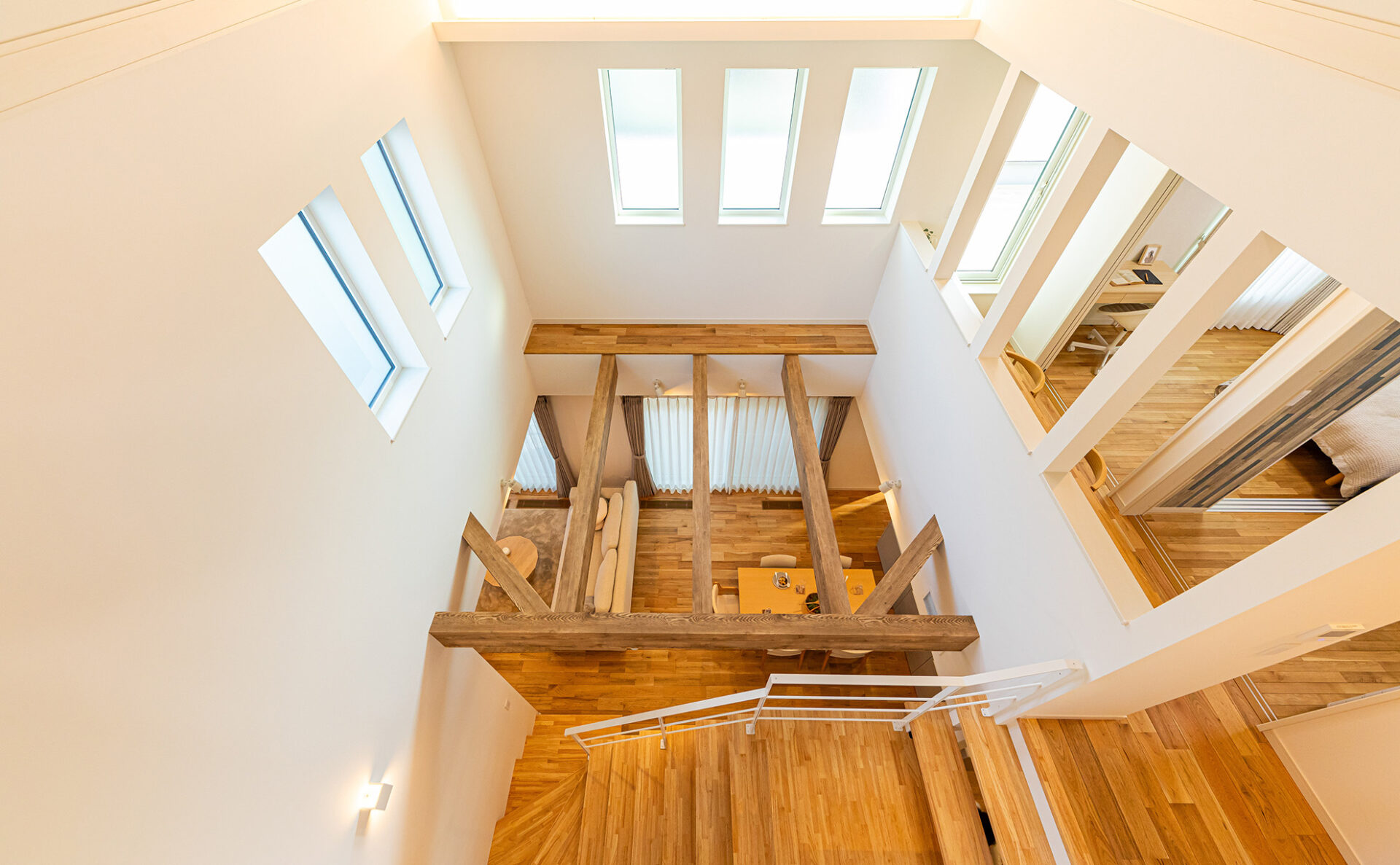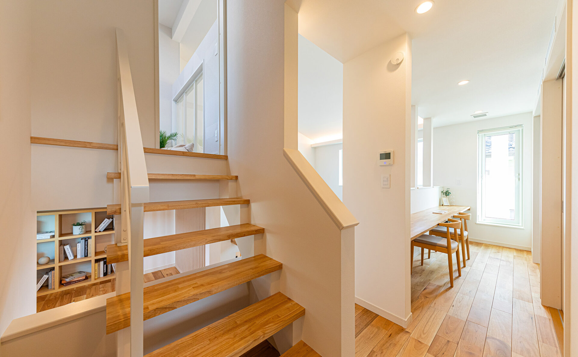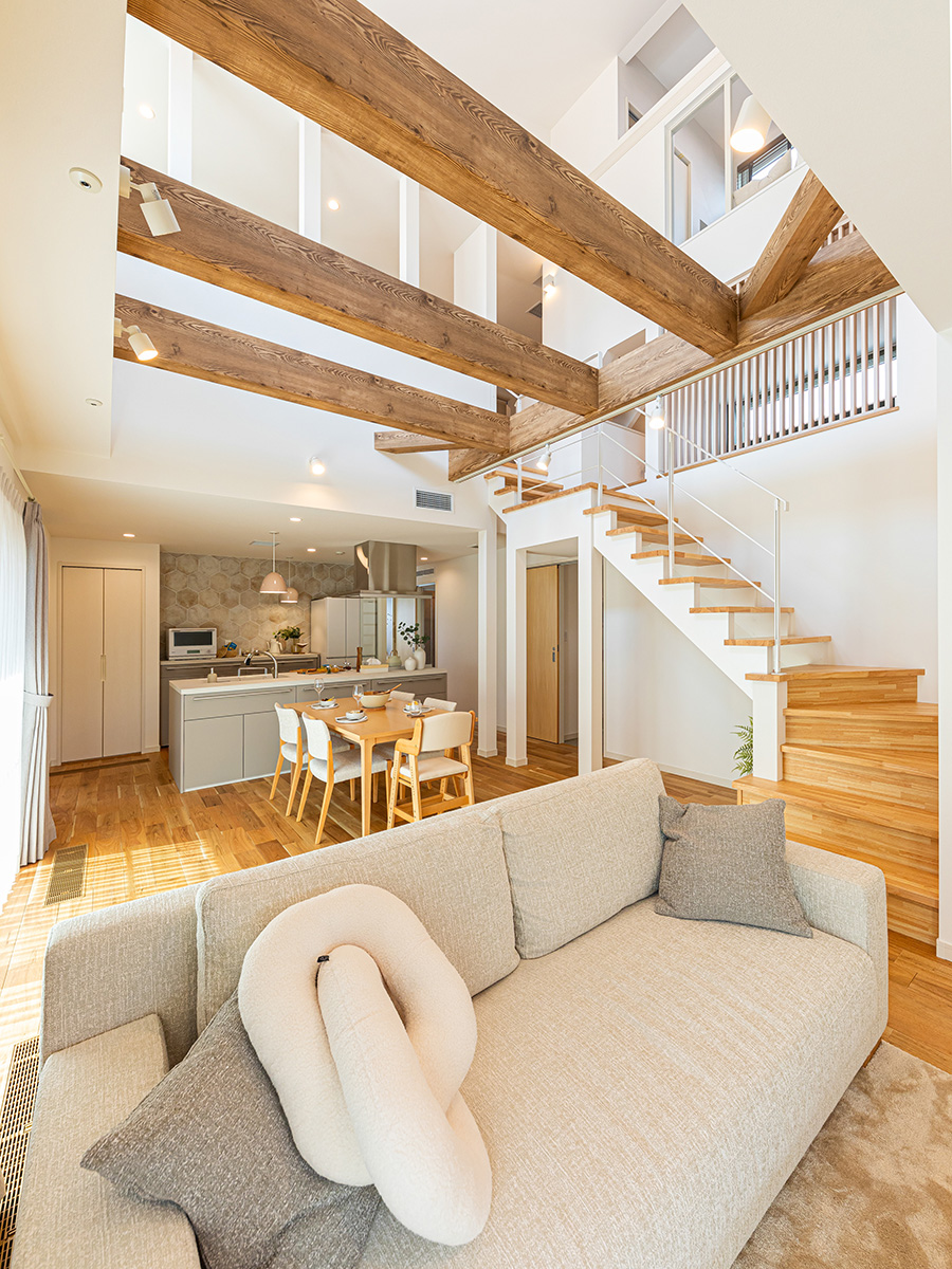 リビング階段や吹き抜けによる立体的な空間で、お互いの気配を感じるモデルハウス。