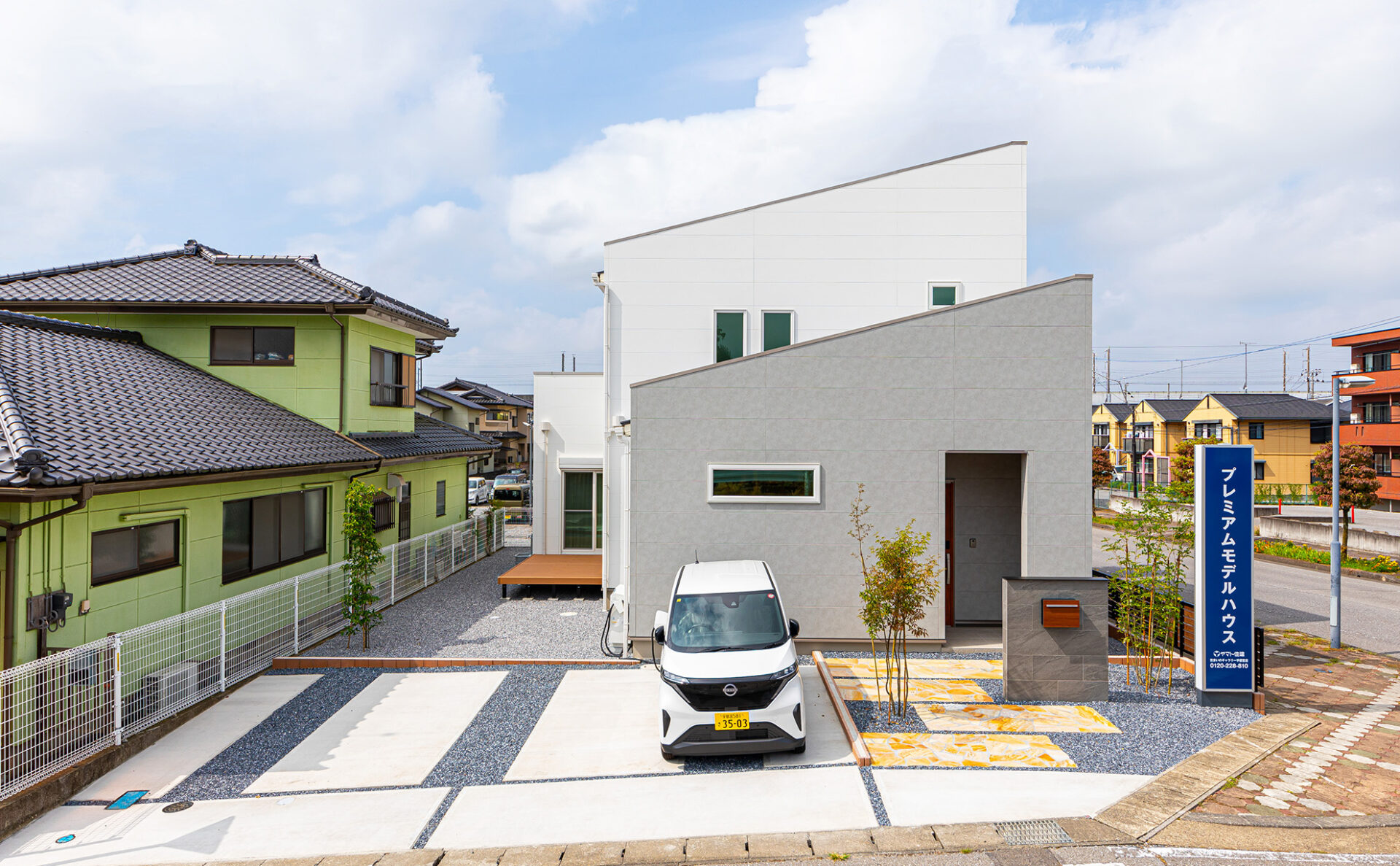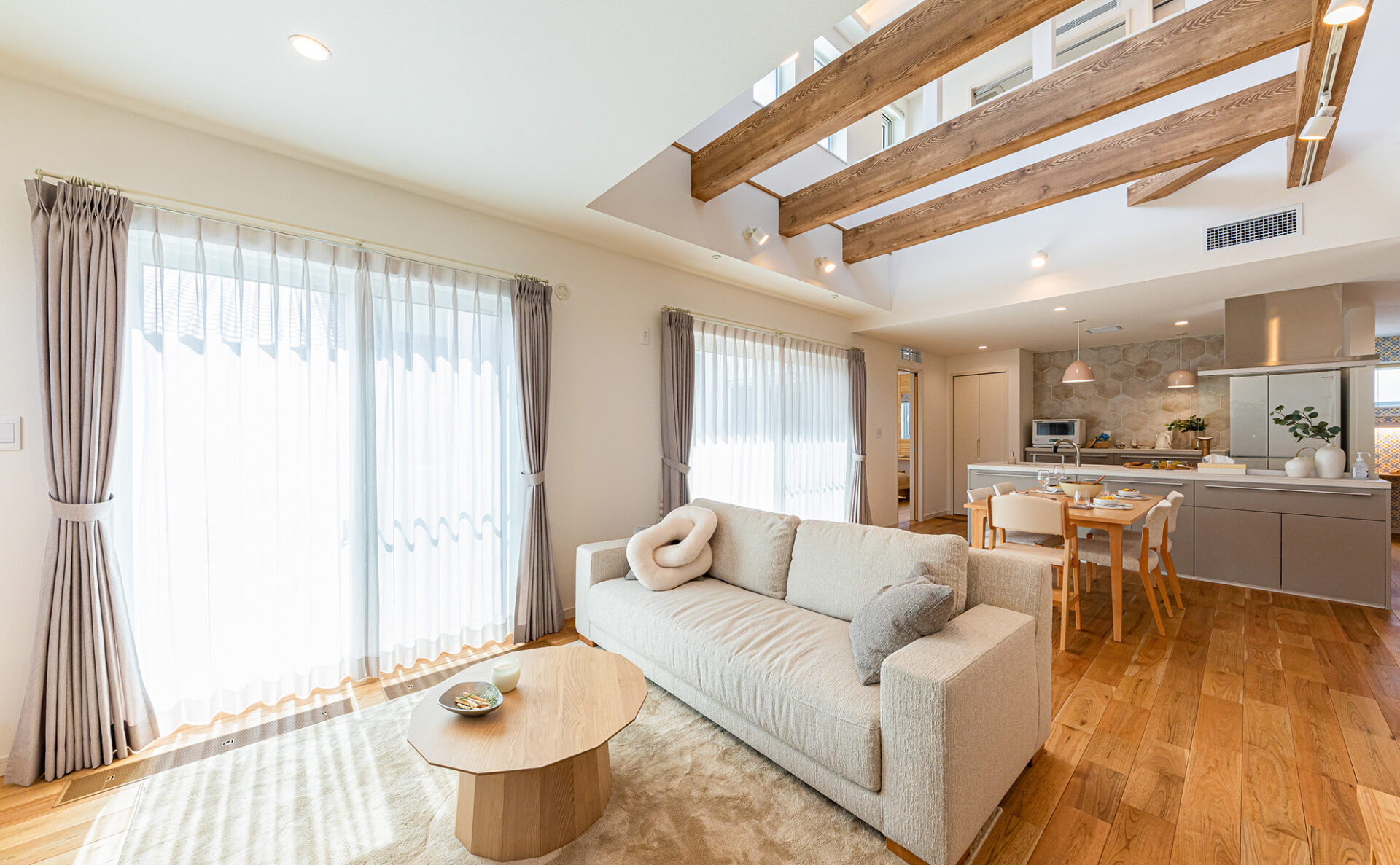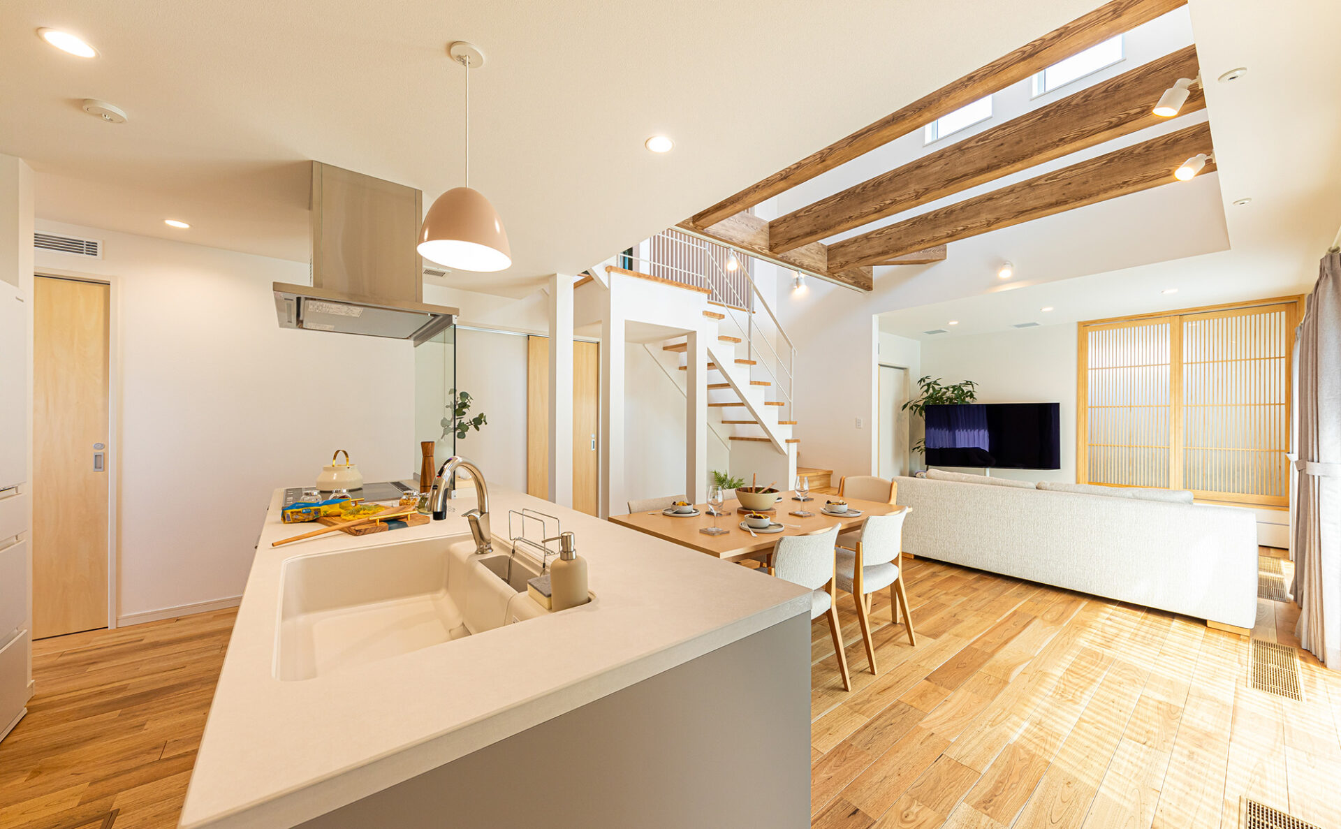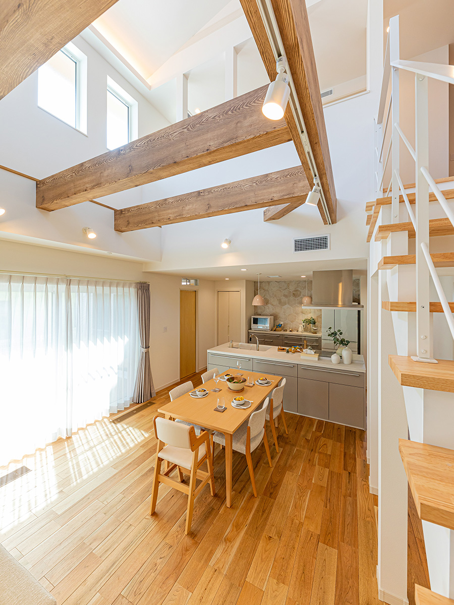 リビング階段や吹き抜けによる立体的な空間で、お互いの気配を感じるモデルハウス。