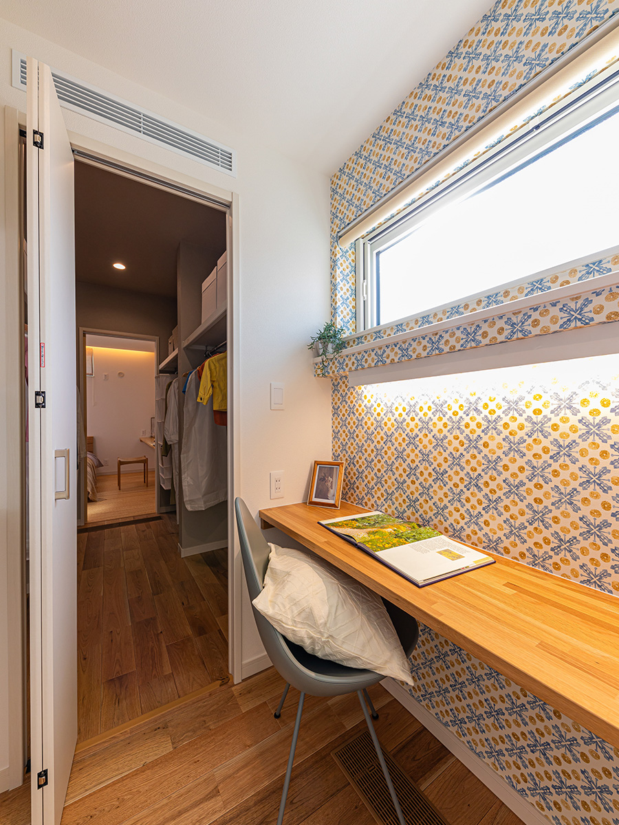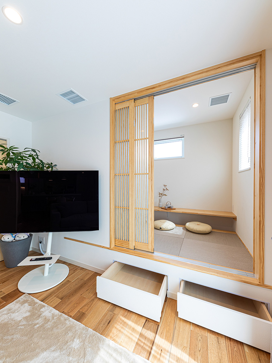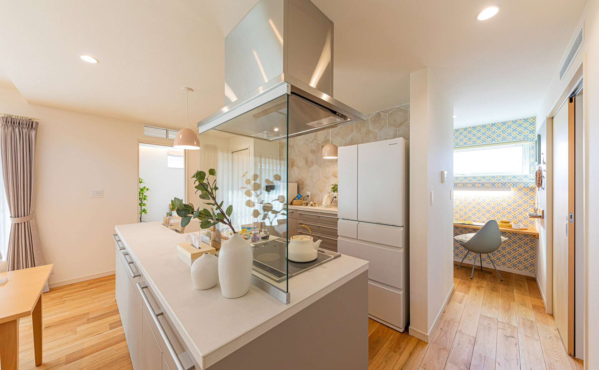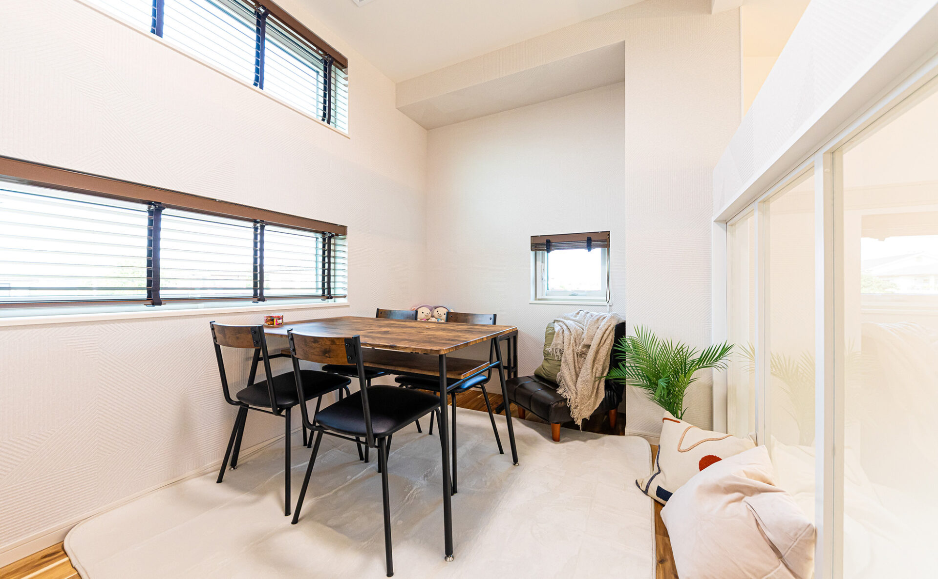 1階部分の行き止まりがない回遊動線は、廊下を無くすことで無駄が一切ない間取りを実現しました。中間ロフトや多目的室・キャットウォークを設けた吹き抜けなど真似してみたい見どころ満載の住まいです。YUCACOシステムを採用したモデルハウスです。