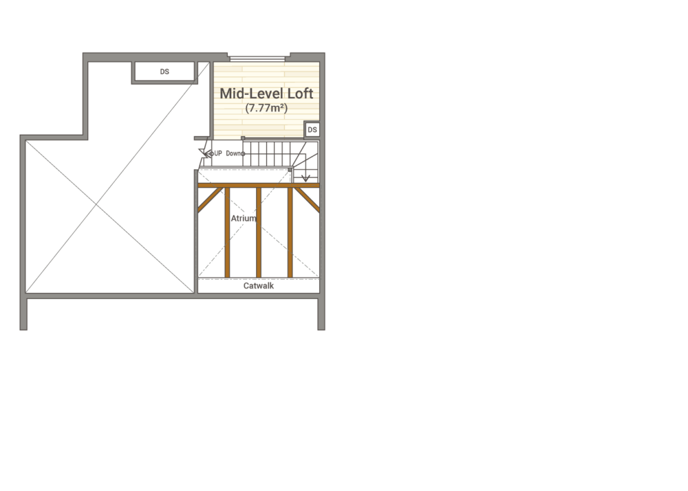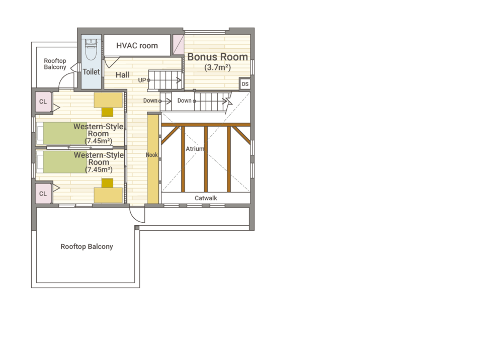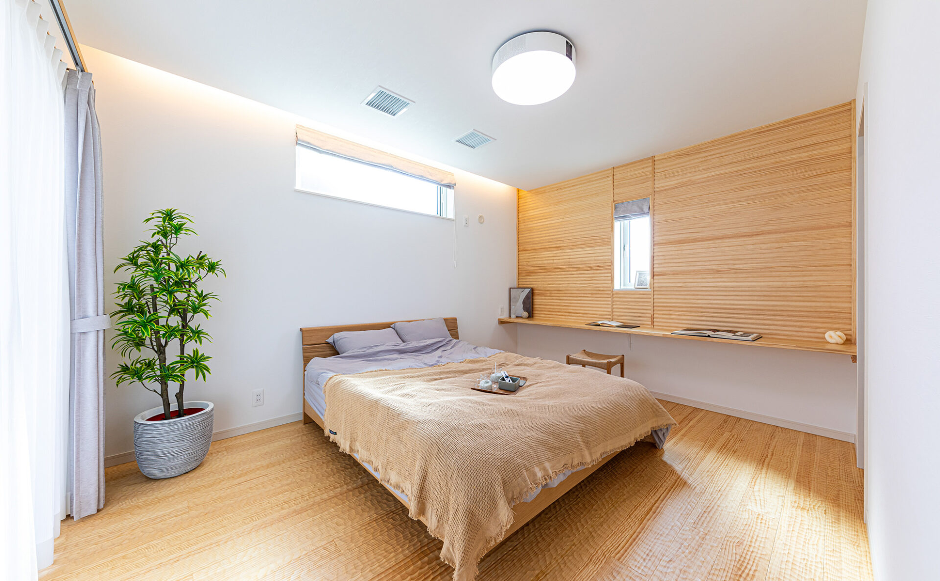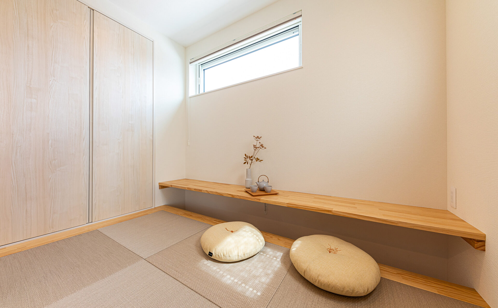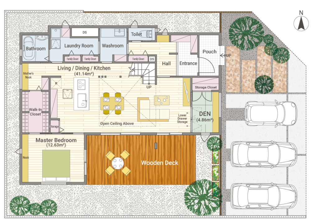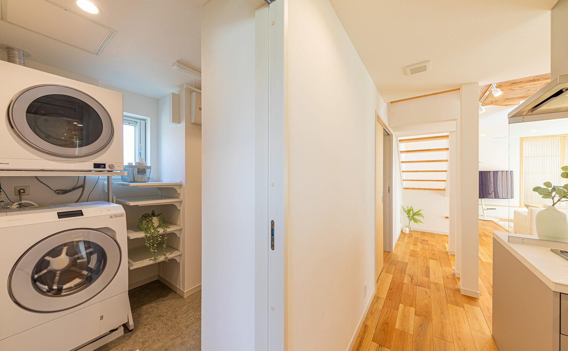 1階部分の行き止まりがない回遊動線は、廊下を無くすことで無駄が一切ない間取りを実現しました。中間ロフトや多目的室・キャットウォークを設けた吹き抜けなど真似してみたい見どころ満載の住まいです。YUCACOシステムを採用したモデルハウスです。