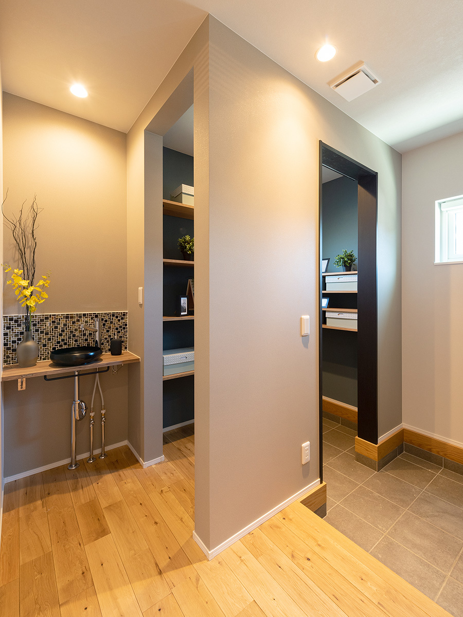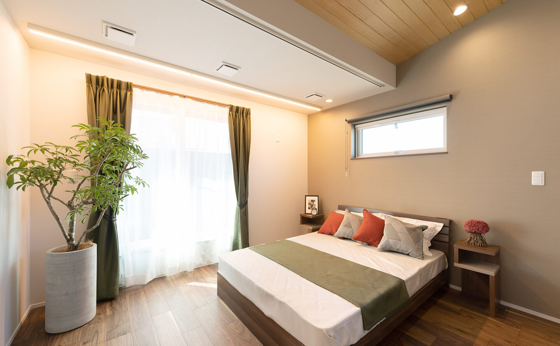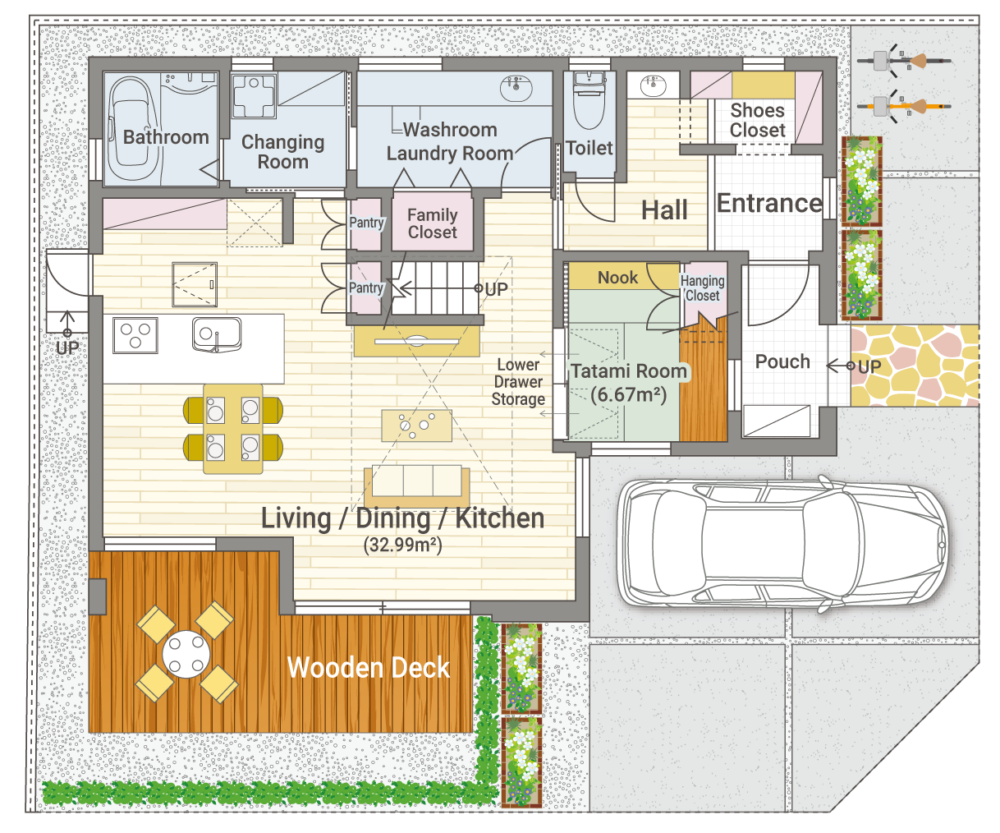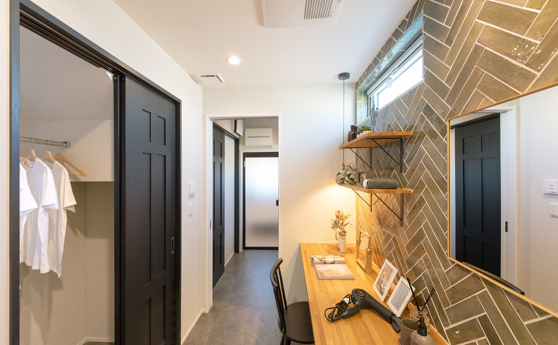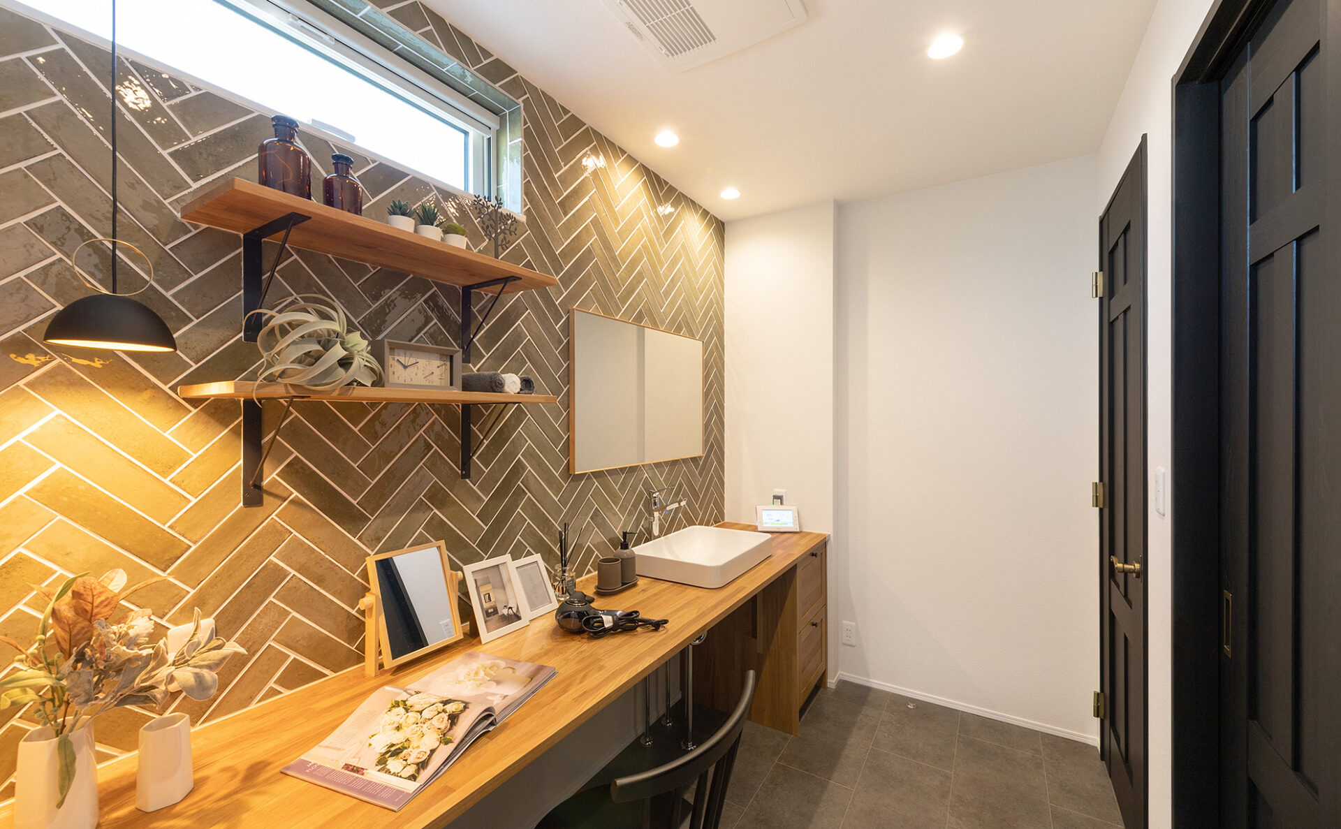 明るく広々としたLDK、無垢材の床が心地よい住まい。みんなで料理ができるキッチン、リビングから繋がるウッドデッキやバルコニーでアウトドアなど家族時間を楽しめます。手洗いの習慣が身につく玄関の洗面や、洗面室のファミリークローゼットなど、家族が快適に過ごせるアイデアが満載です。室内空気循環システム(エアフローシステム)を採用したモデルハウスです。