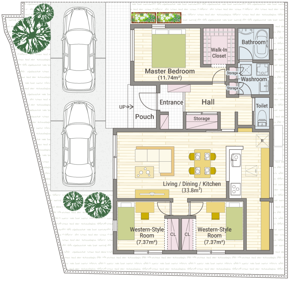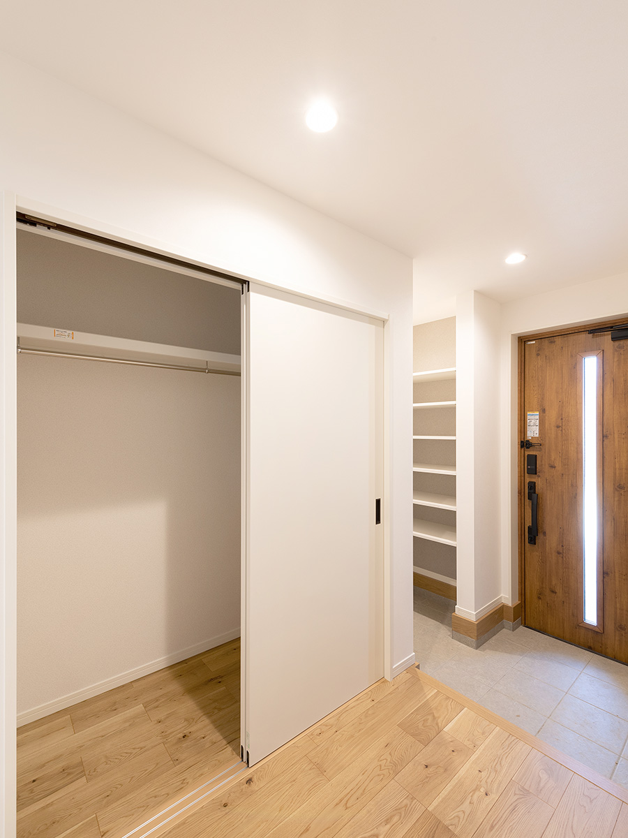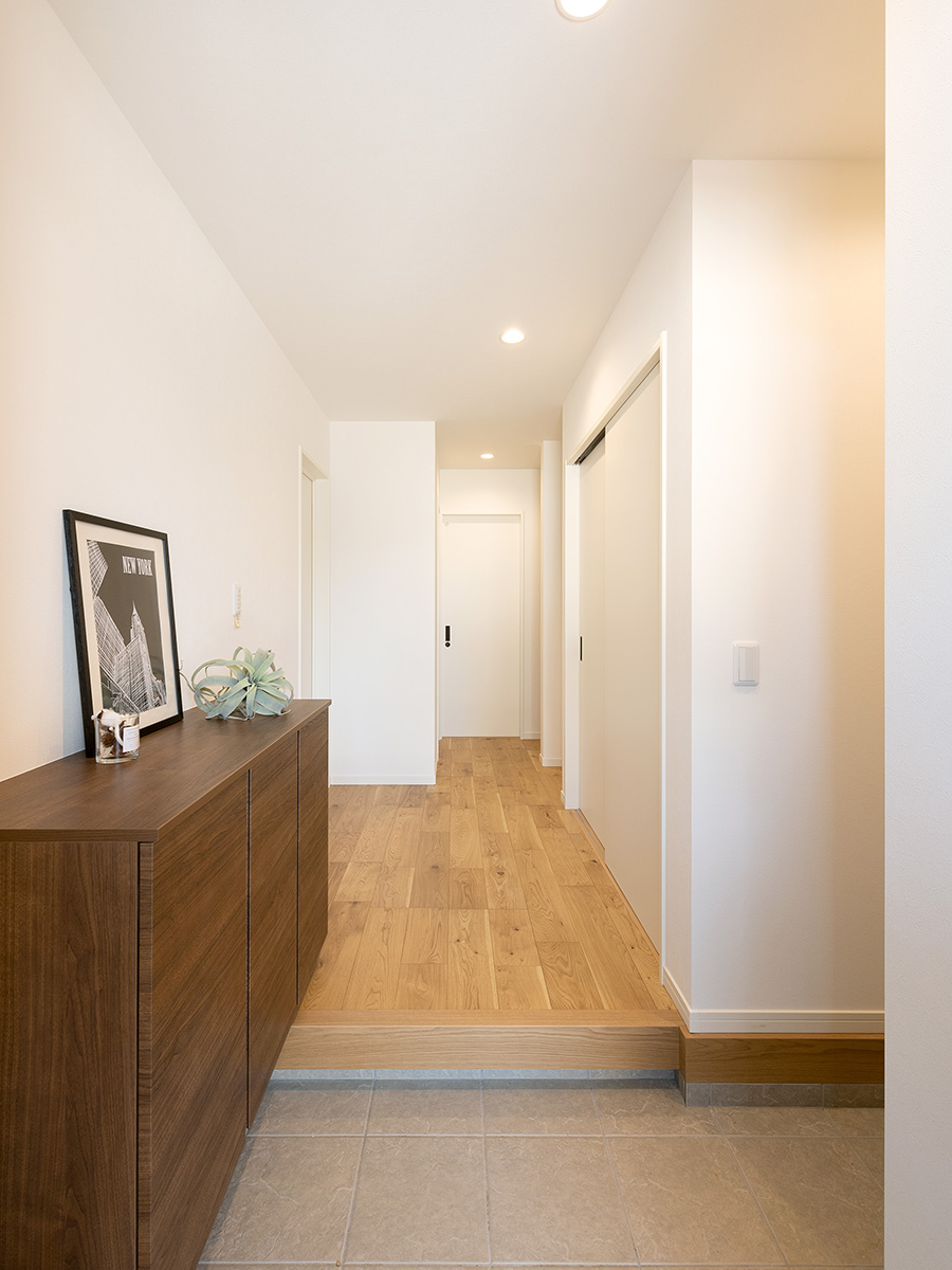 広々とした20帖を越えるLDK、家族の会話が弾むオープンなキッチン。動線がラクになる平屋の住まいは子どもが独立したあとも夫婦がゆったりと暮らせます。食材や生活用品を収納できる広めのパントリー、細々したものを整理できる玄関ホールの収納スペースなど、コンパクトでありながら収納にこだわりました。平屋ならではの暮らし提案が満載です。
