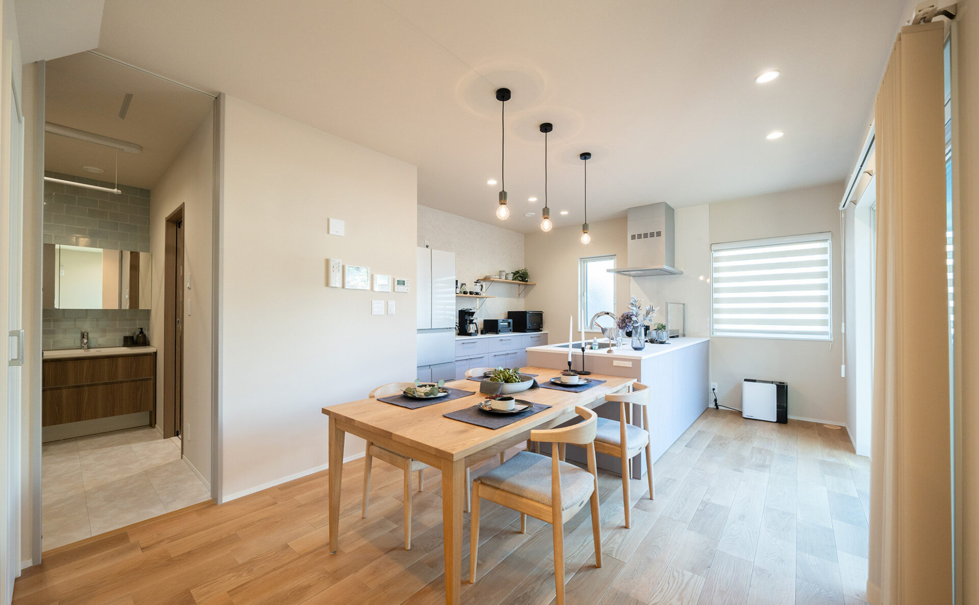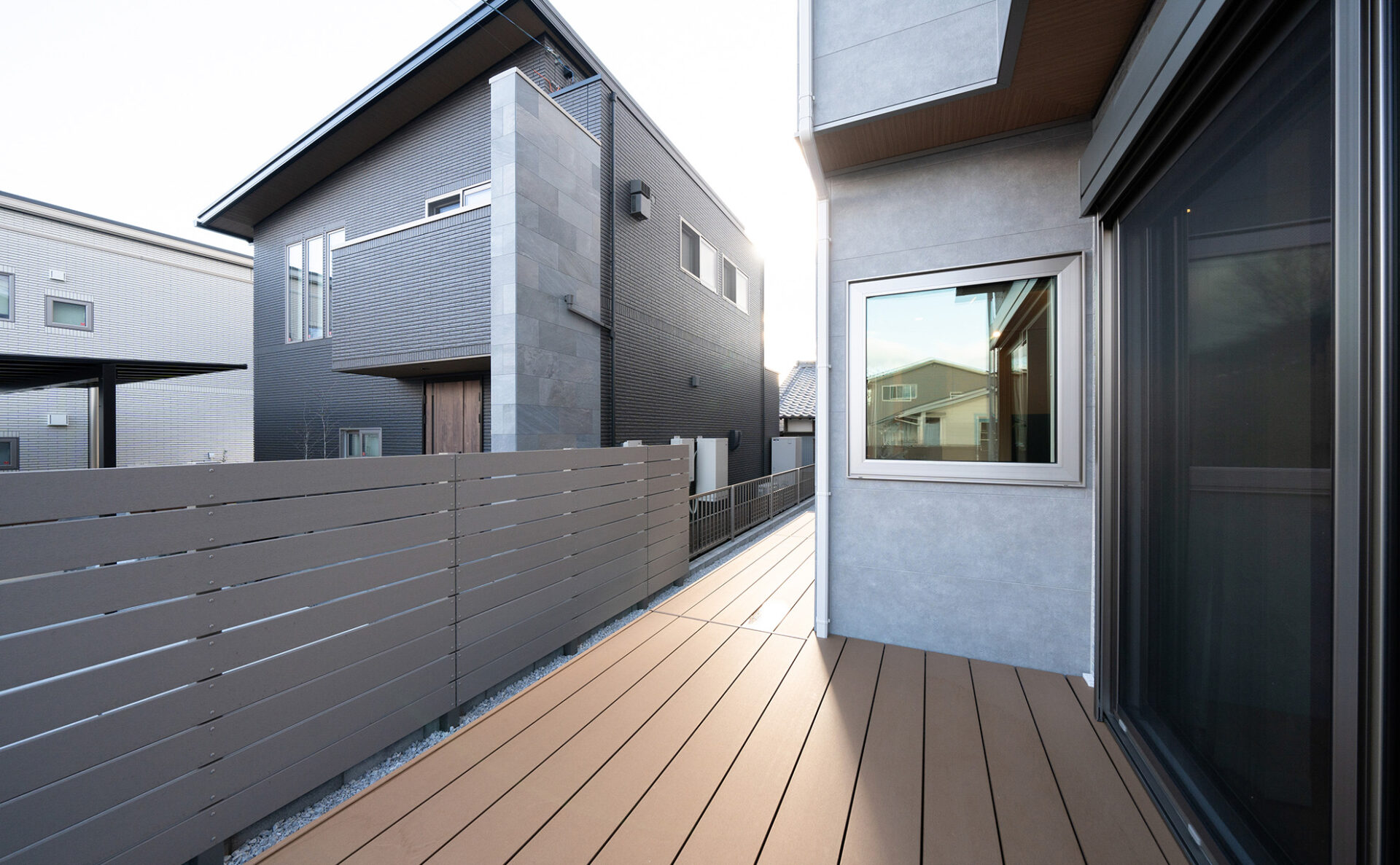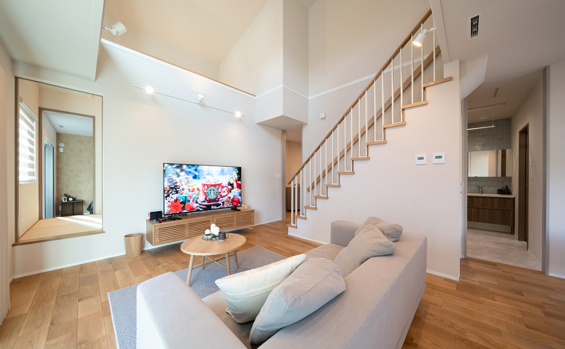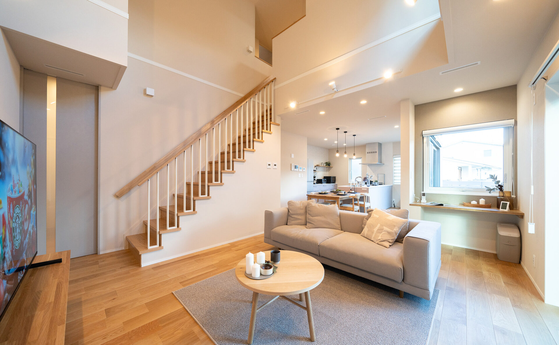 開放的な吹き抜けのLDKに加えて、ウッドデッキや屋上庭園など多彩なアウトドア空間が魅力のモデルハウス。アウトドア空間を通じて内外が繋がることで、暮らしが外へ広がる住まいとなりました。太陽光パネルを約8.25kw搭載しており、家計に優しい暮らしを実現できます。また、全館空調システム「エコエアファイン」を搭載しており年中快適にお過ごしいただけます。