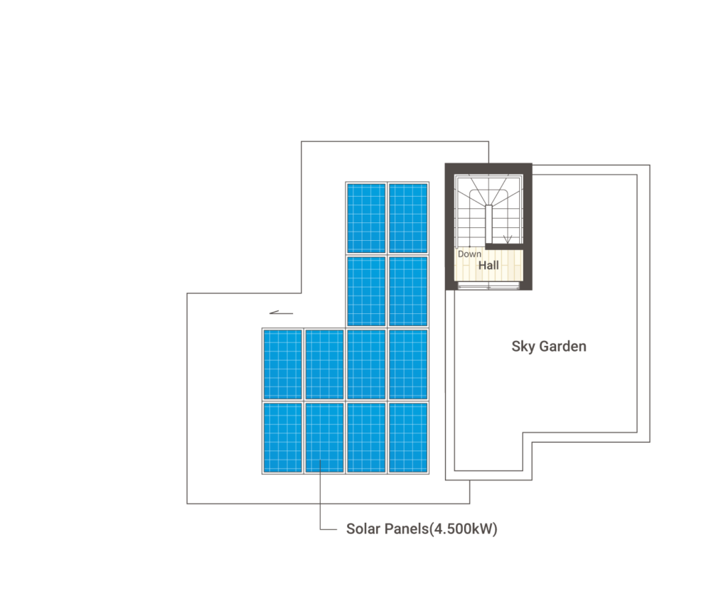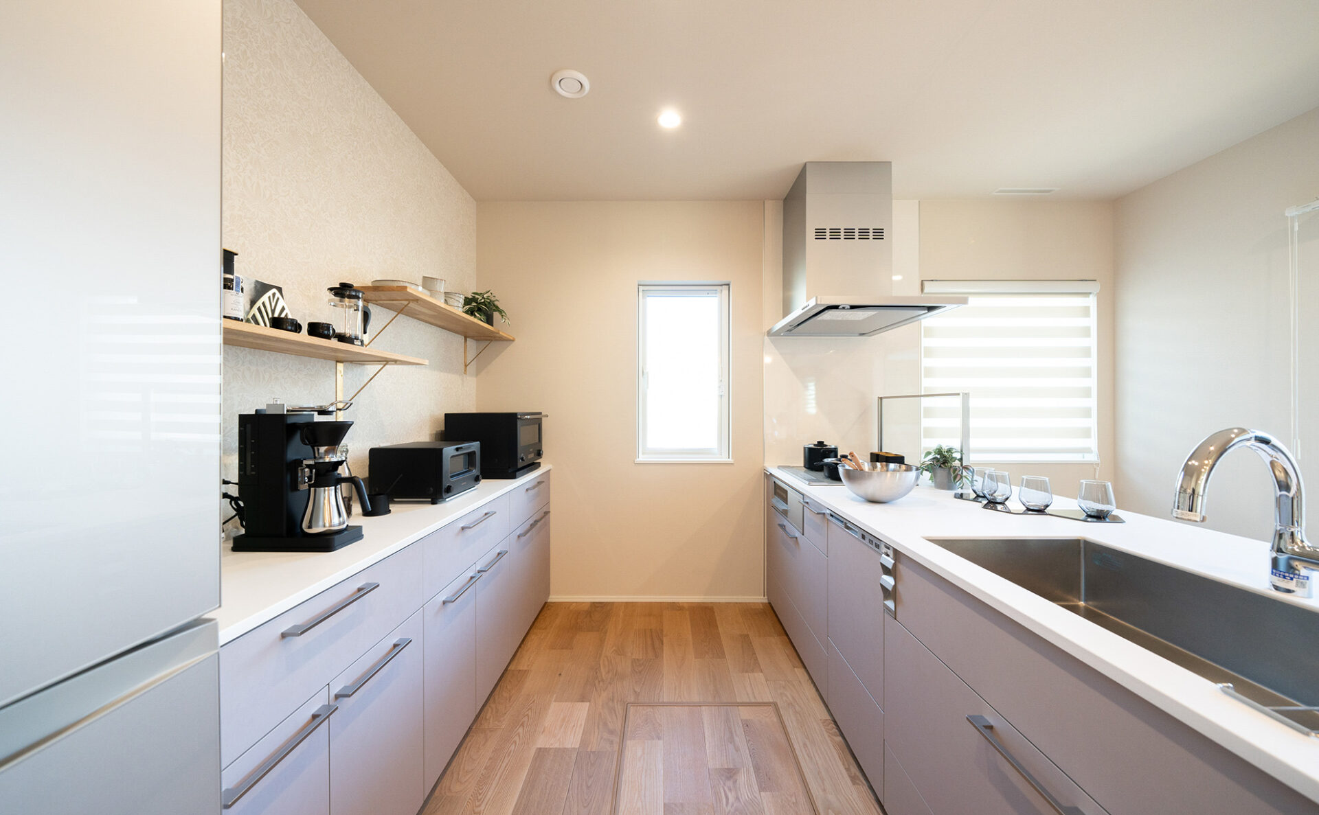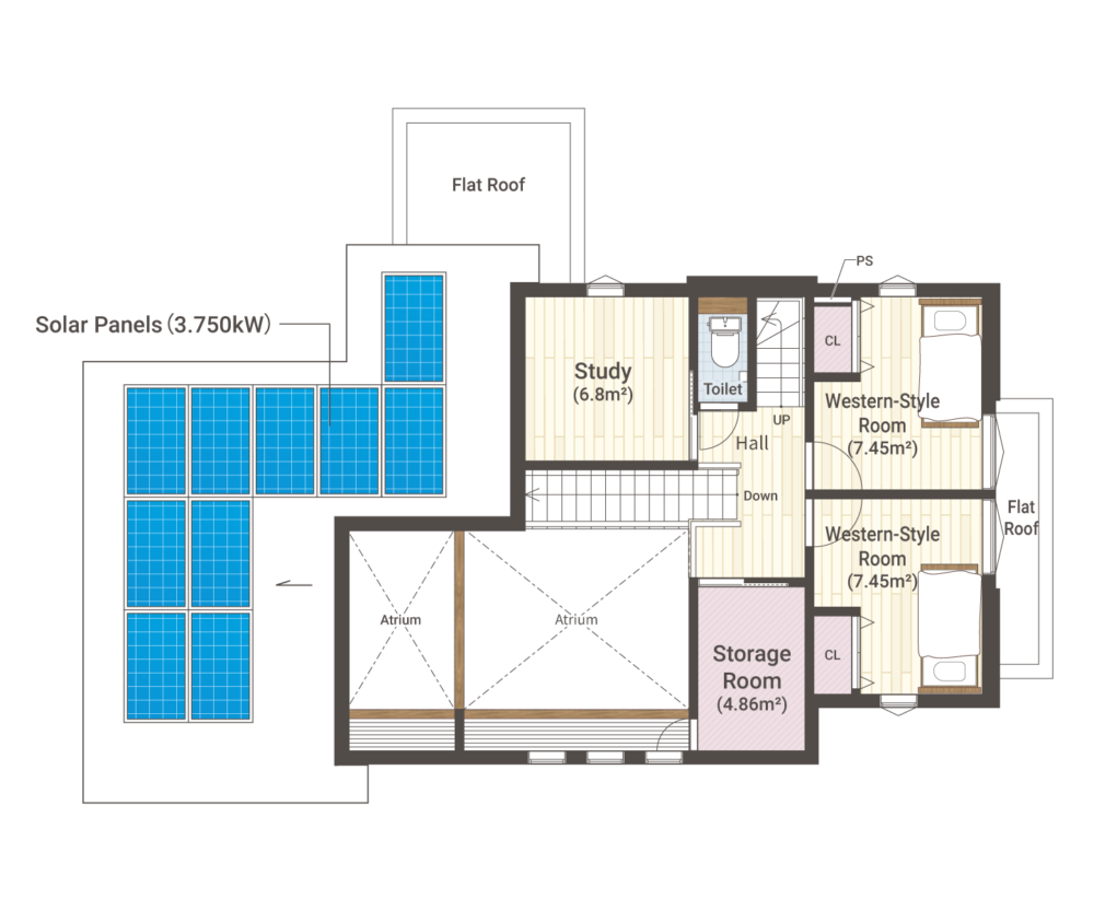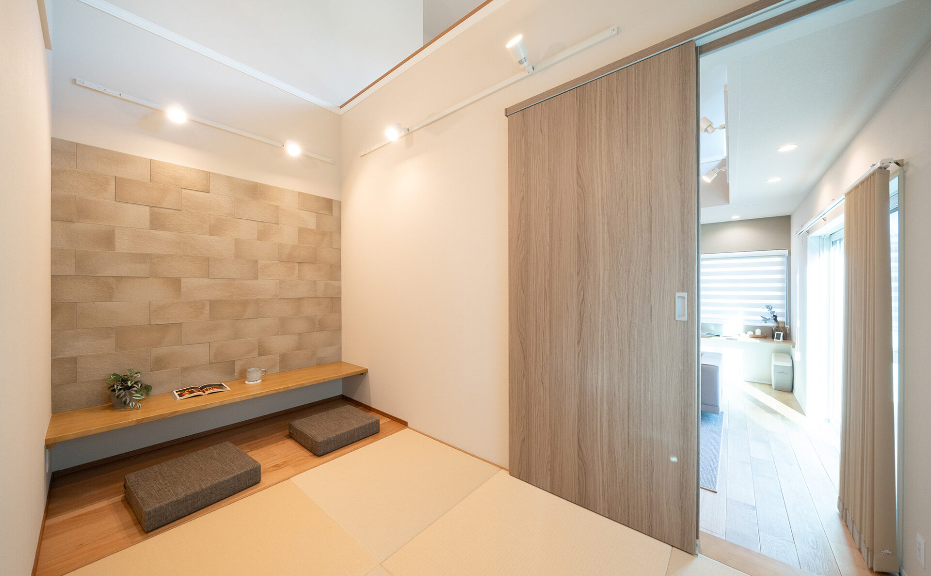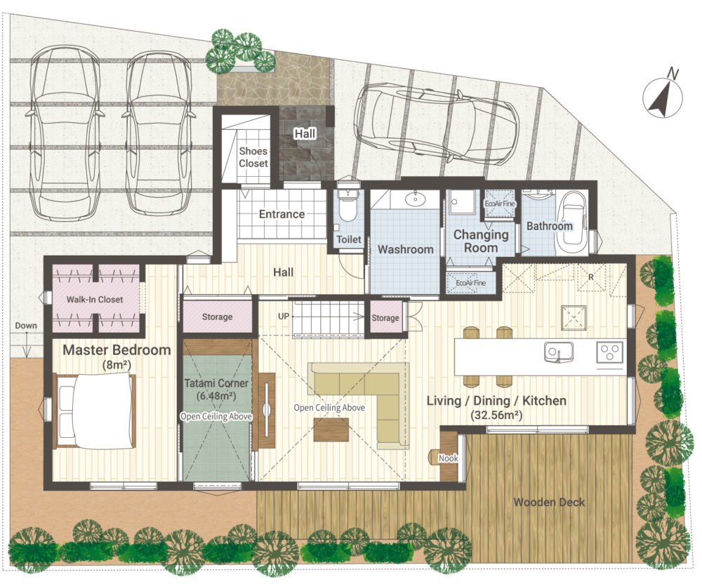 開放的な吹き抜けのLDKに加えて、ウッドデッキや屋上庭園など多彩なアウトドア空間が魅力のモデルハウス。アウトドア空間を通じて内外が繋がることで、暮らしが外へ広がる住まいとなりました。太陽光パネルを約8.25kw搭載しており、家計に優しい暮らしを実現できます。また、全館空調システム「エコエアファイン」を搭載しており年中快適にお過ごしいただけます。