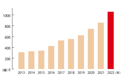 ヤマト住建は今年で創業36年を迎え、全国37拠点にて家庭にも地球環境にもやさしい、ZEH(ネット・ゼロ・エネルギー・ハウス)やLCCM(ライフ・サイクル・カーボン・マイナス)住宅を普及させるべく邁進しています。お客様おひとりおひとりの想いやご希望に寄り添った家づくりを行い、2022年度の受注棟数は1,000棟を超え、今期も多くの受注をいただいております。