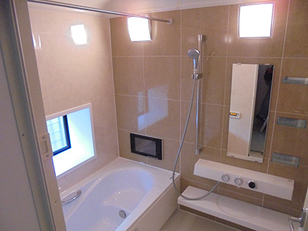 タイルの浴室では冬場かなり寒かった為、断熱性の高いユニットバスにされました。壁はハイグレードなブラウンの鏡面仕上げとし、浴室テレビも付けて居心地の良い空間に。