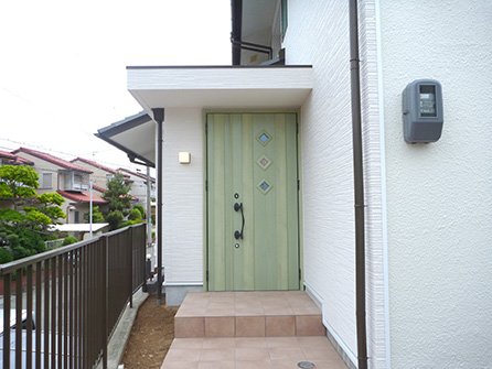 家の顔でもある玄関は、明るくなるように正面に持って来ました。扉の色もさわやかなグリーンを選びました。