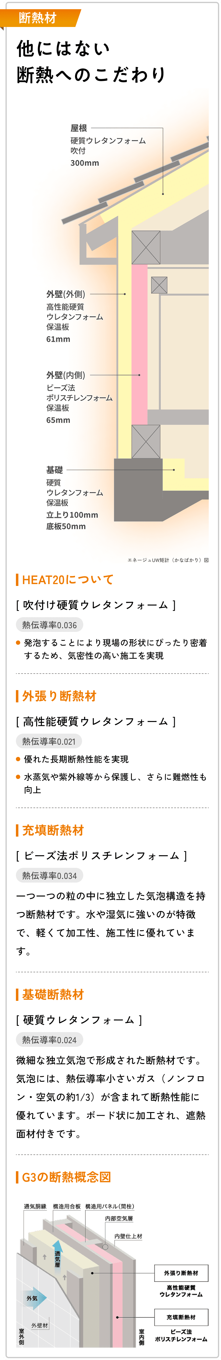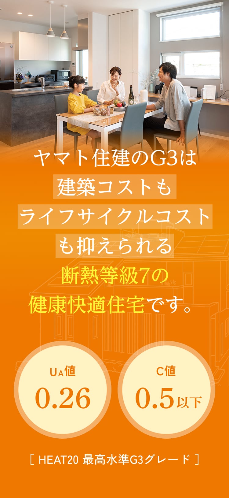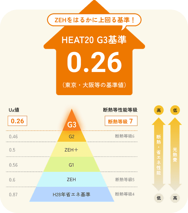 2030年に義務化予定の断熱等級5(住宅性能表示制度・断熱等性能等級)のUA値0.6を大きくクリアしており、エネージュG3の優れた断熱性能を証明しています。
