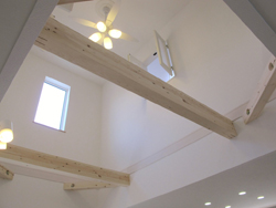 吹き抜け部分にある梁はあえて無垢材のままにしてもらっています。 雰囲気が出ていて気に入ってるんです。