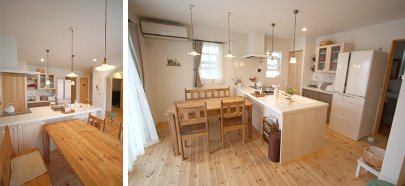 ▲(親世帯)アンティークな雰囲気でとっても明るいLDK。床にはパイン材を使用しています。 アールの垂れ壁でさらに優しい空間になりました。猫ちゃんのトイレもアール型なんです。