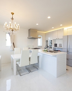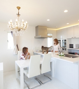 ▲白いカラーで統一されたLDK。対面キッチンは、間接照明でおしゃれに演出。