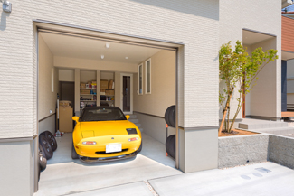 ▲インナーガレージは、奥のドアからリビングを通り抜けて洗面室に直接出入りできるよう設計