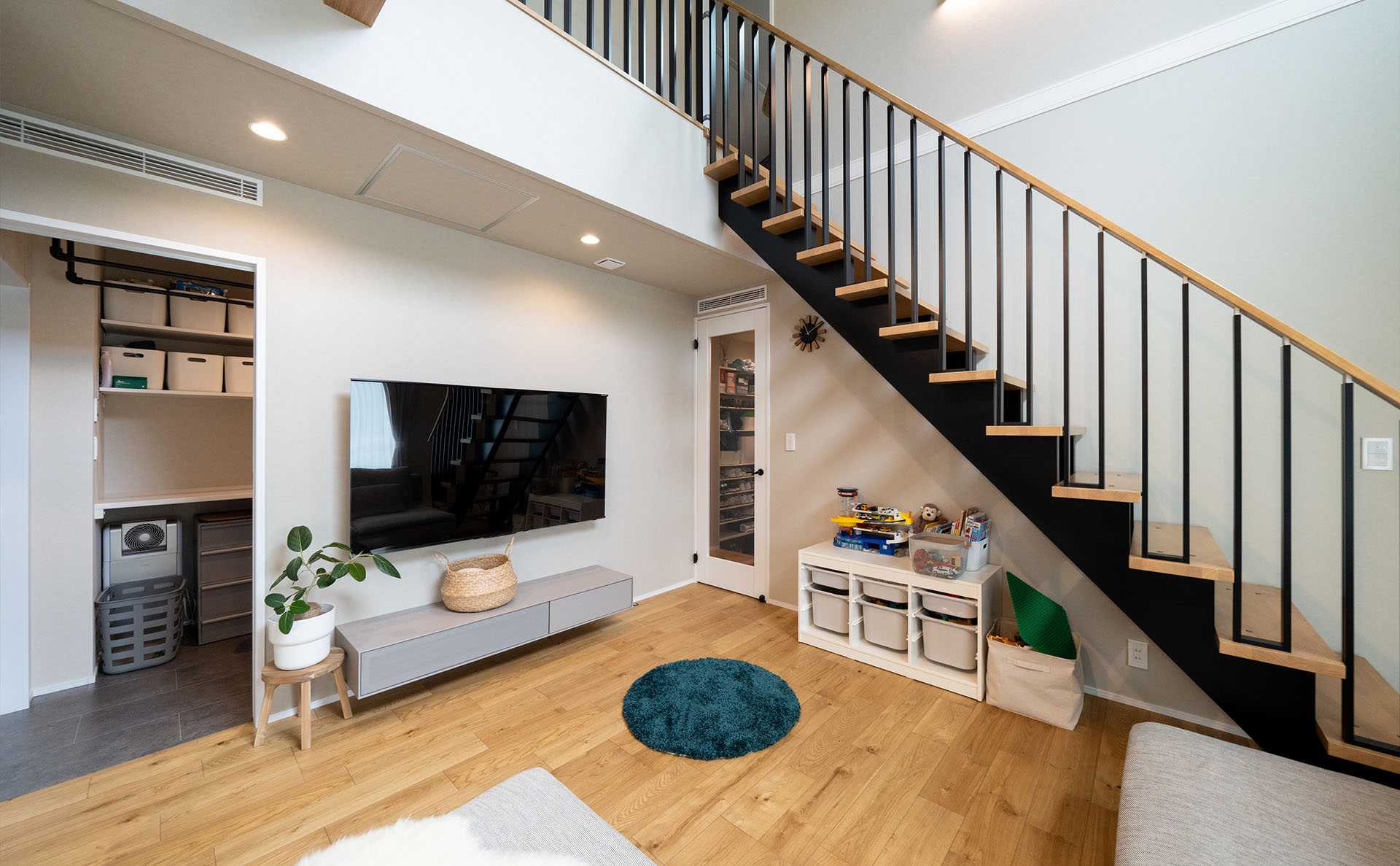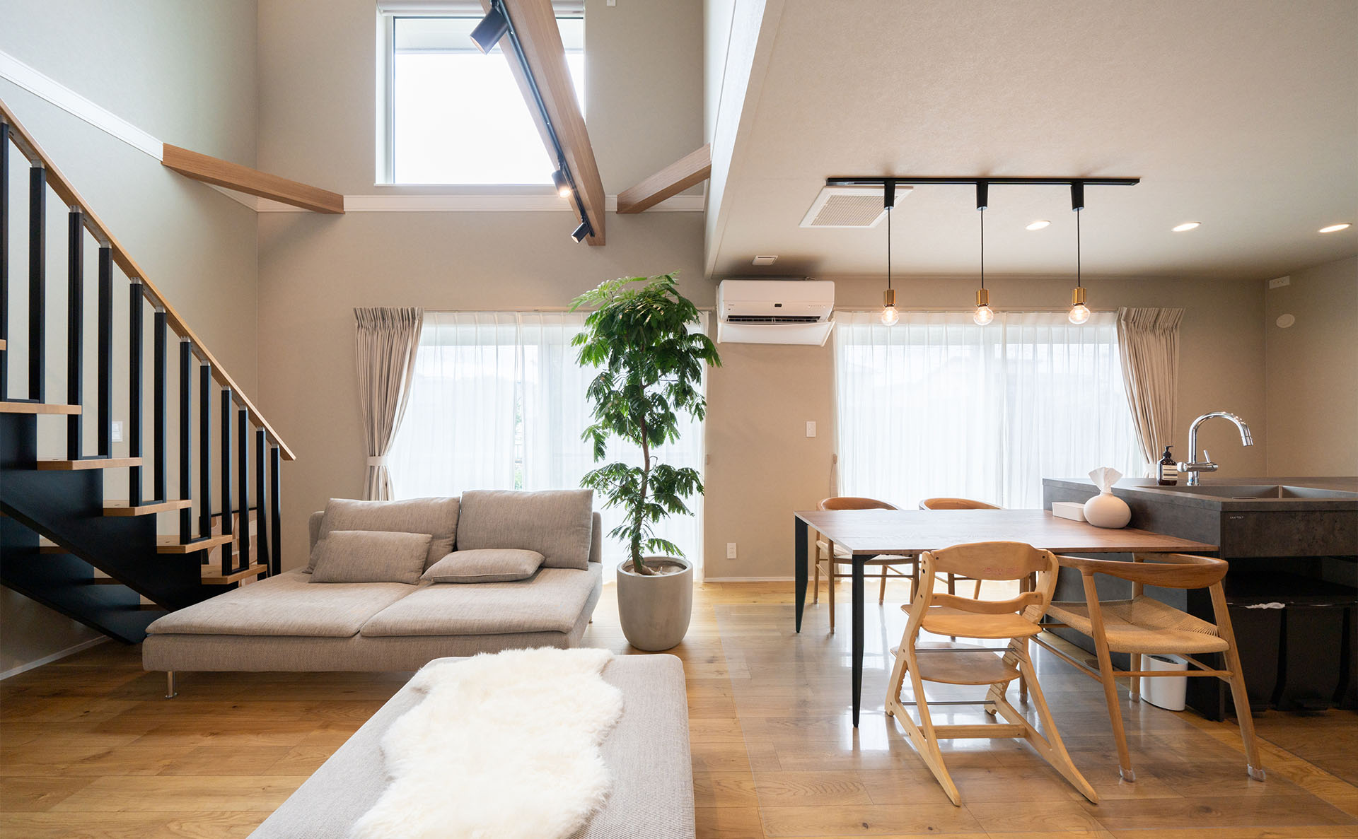 まずこの吹抜けとリビングの階段、あと大きな窓、生活動線っていうのも考えて間取りを作りました。
