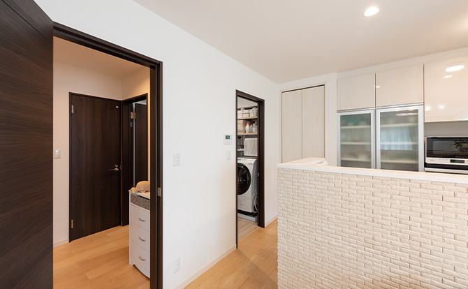 でも、外から入ってくると、やっぱり汚れているのかなというところは感じていて、2人とも医療職なので、できればリビングを通らずにお風呂場とか洗面所に行けたらいいなというのがあって、ここを通らないように、リビングを通らないように設計をさせてもらいました。