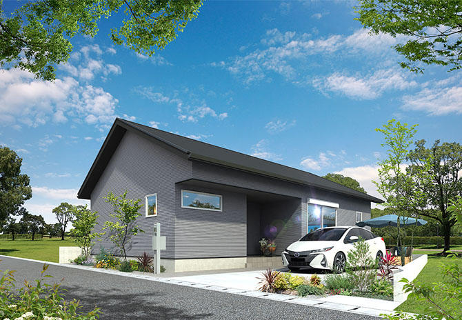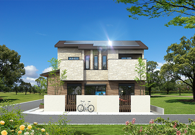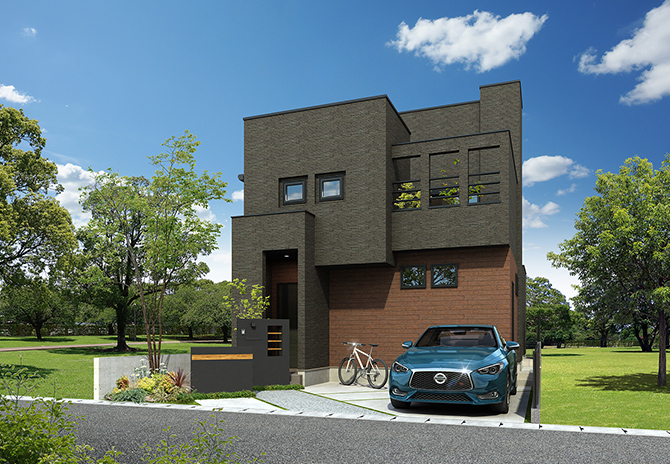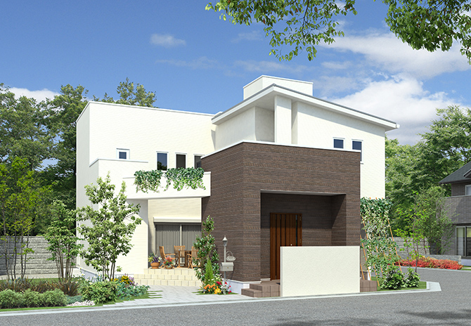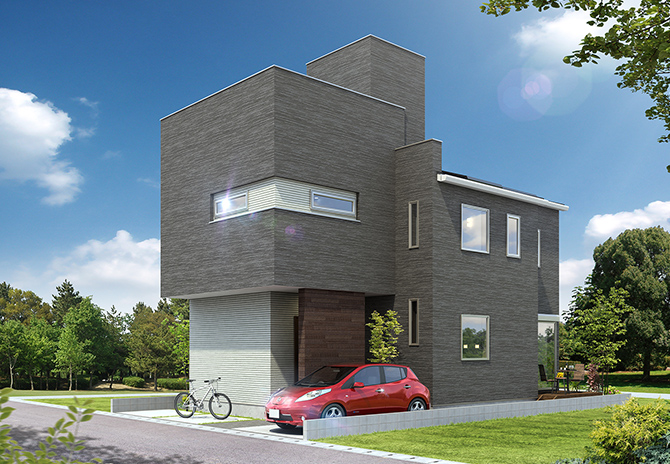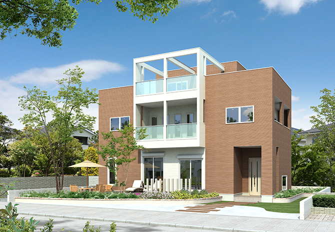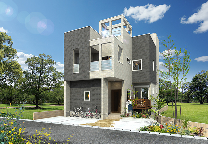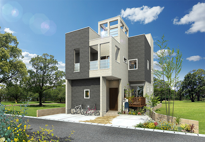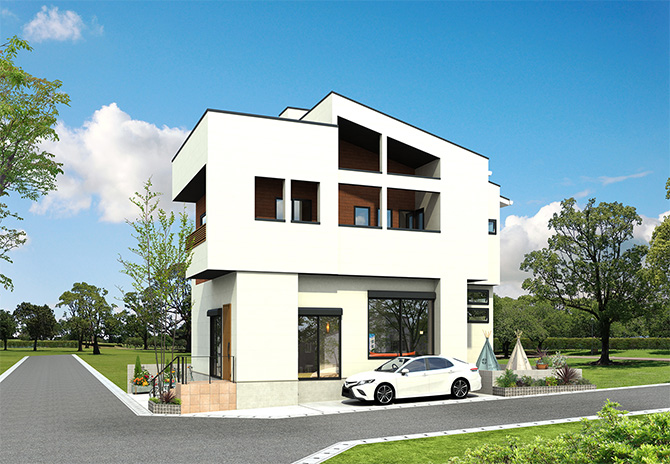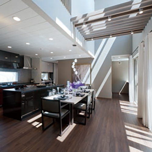 船橋住宅展示場 ダブルロフトへと続く、スキップフロアの家 2階建て 40~50坪 スキップフロア ママ目線 家事動線 ロフト 中庭・テラス 収納にこだわり 吹き抜け・高天井 屋上庭園 無垢材 展示場ページへ