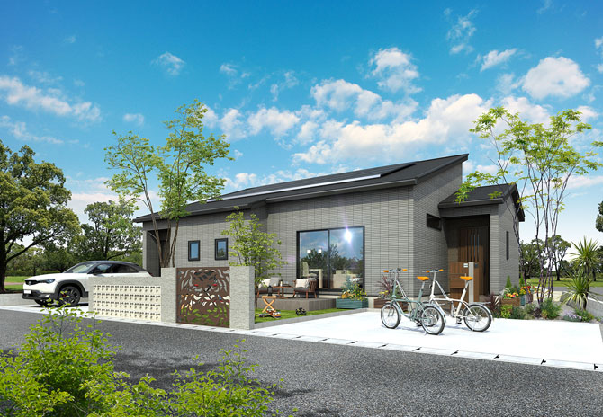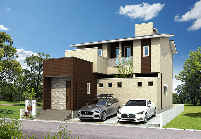 神奈川住宅展示場 サーキュラー階段とパティオのある憩いの家 2階建て 40~50坪 ママ目線 家事動線 ロフト 中庭・テラス 収納にこだわり 吹き抜け・高天井 無垢材 3Dモデルハウスを見る 展示場ページへ
