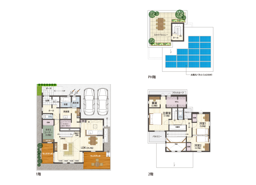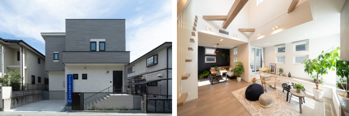 2つのウッドデッキや屋上庭園と暮らせる自然と調和した朗らかな住まい。約25帖の大空間が目を見張るLDKは、明るく心地よい家族が集まるスペースです。各スペースの充実した収納など真似したいポイントが盛りだくさん。太陽光発電システムを約6kW搭載し、家計と地球にやさしい住宅を実現しました。