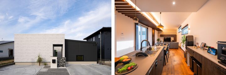 2色に貼り分けた外壁がモダンな印象のモデルハウス。勾配天井が開放感あるLDKや、WICLつきの主寝室、2つの洋室など空間が各所に広がる平屋の住まいです。太陽光パネルを約6.00kw搭載しており、家計に優しい暮らしを実現できます。また、全館空調システム「エコエアファイン」を搭載しており年中快適にお過ごしいただけます。