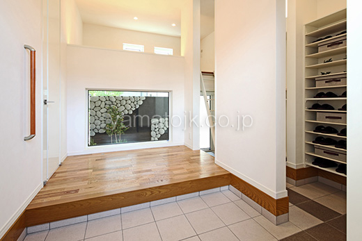 心地よい光が溢れるステップリビングのある家 玄関ホール(正面:坪庭)