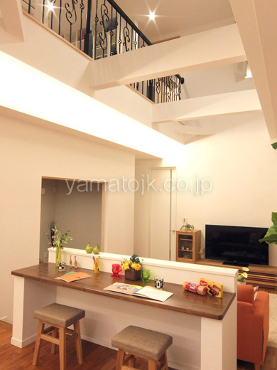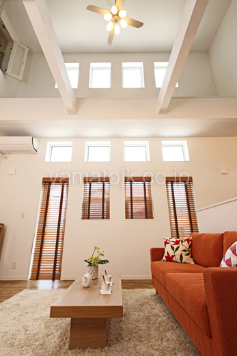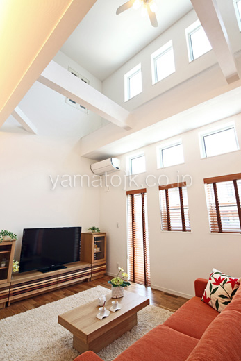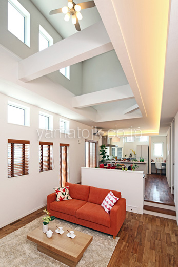 心地よい光が溢れるステップリビングのある家 吹き抜け