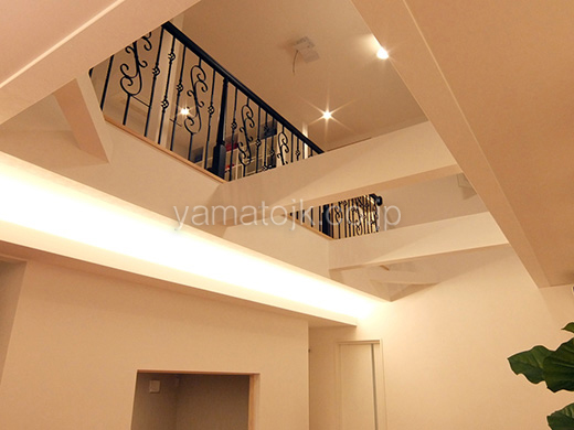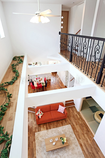 心地よい光が溢れるステップリビングのある家 吹き抜け(2階より)