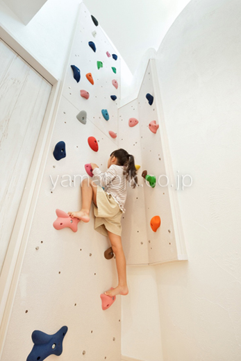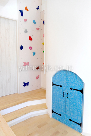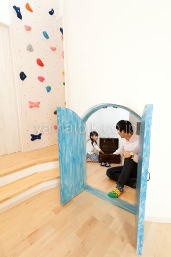 渡り廊下/吹き抜け/子供部屋(3枚引き込み扉)/ファミリーライブラリー/ボルダリング