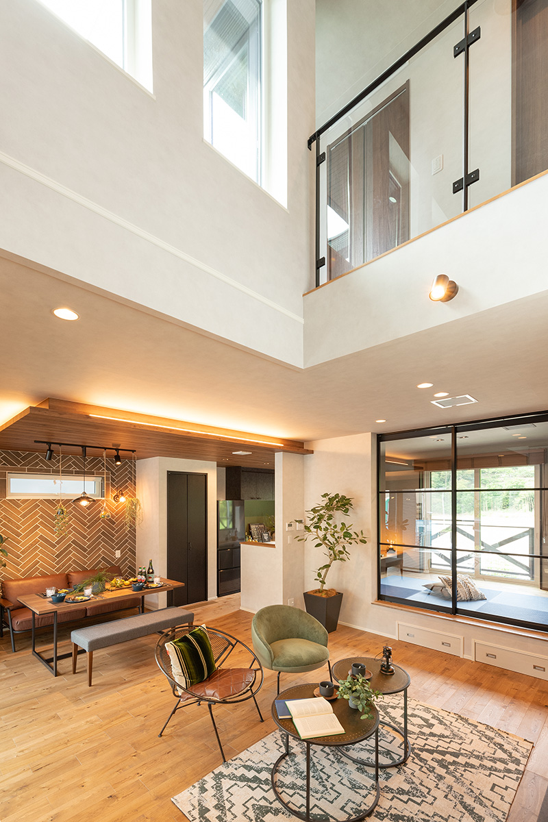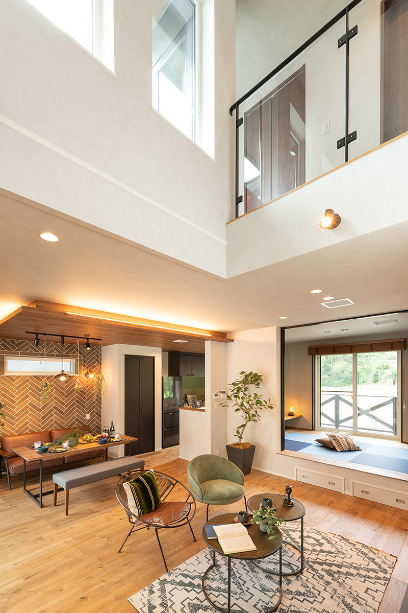 和歌山モデルハウス/リビング/和室(床下収納付き)/吹き抜け
